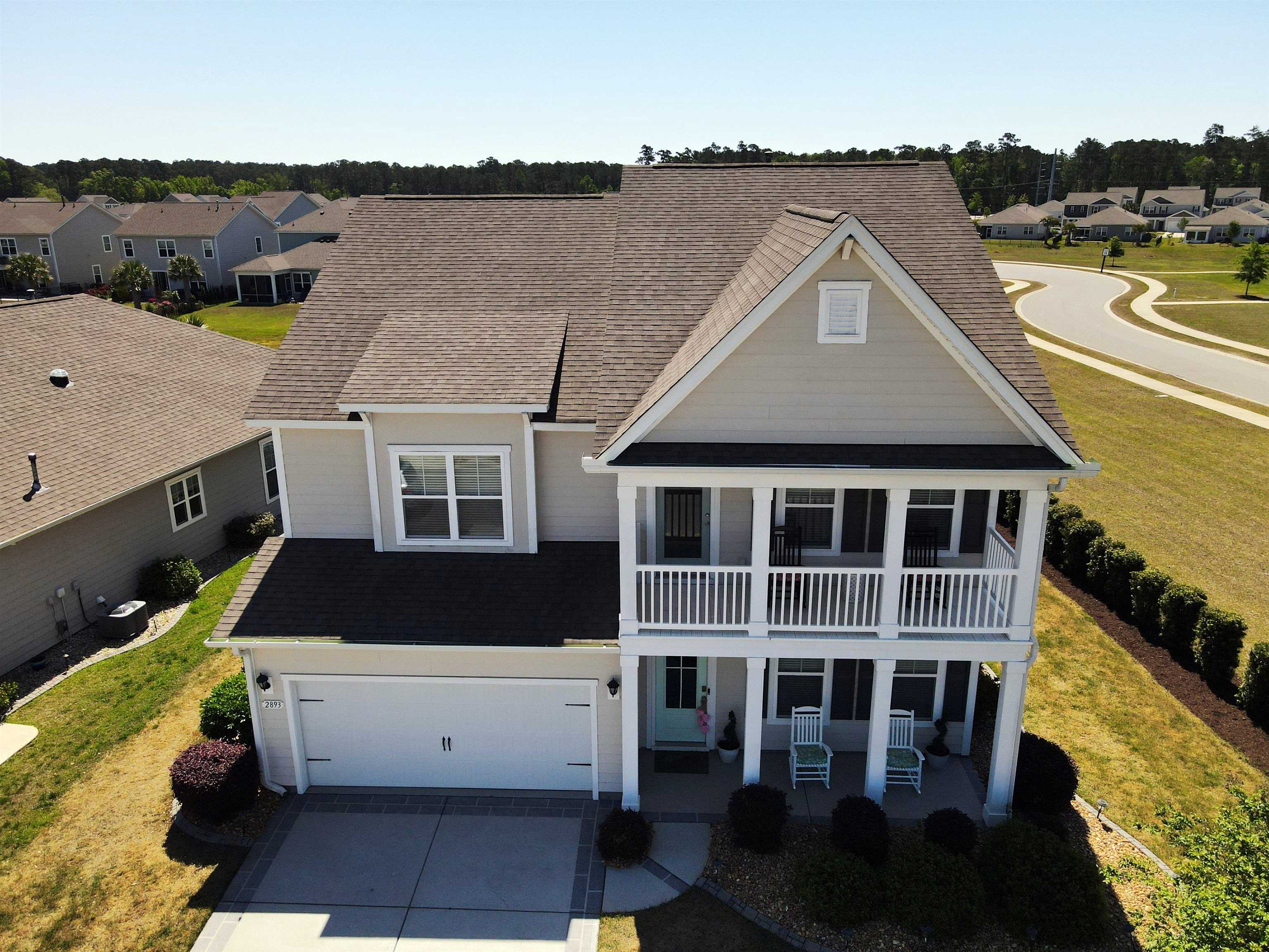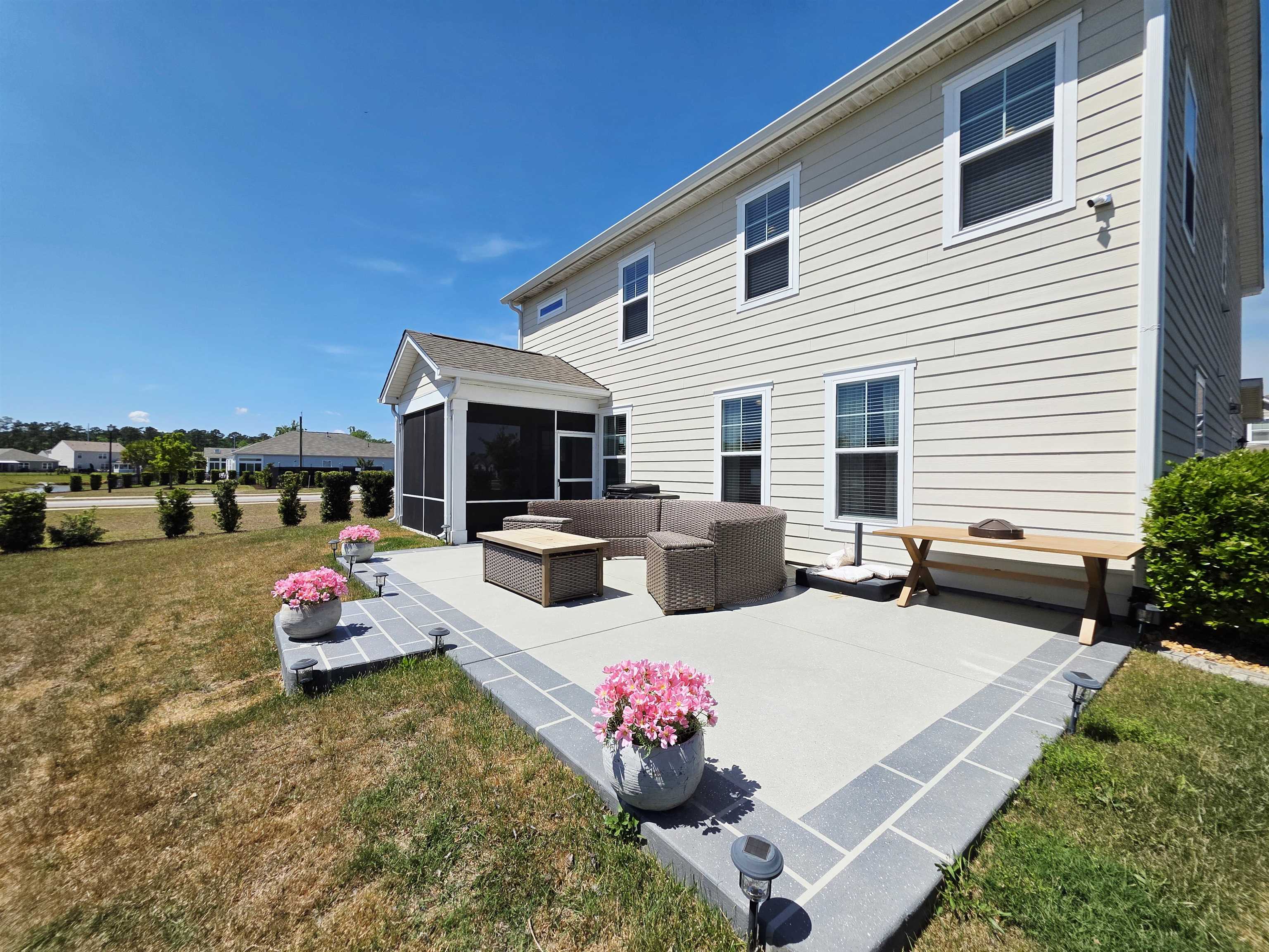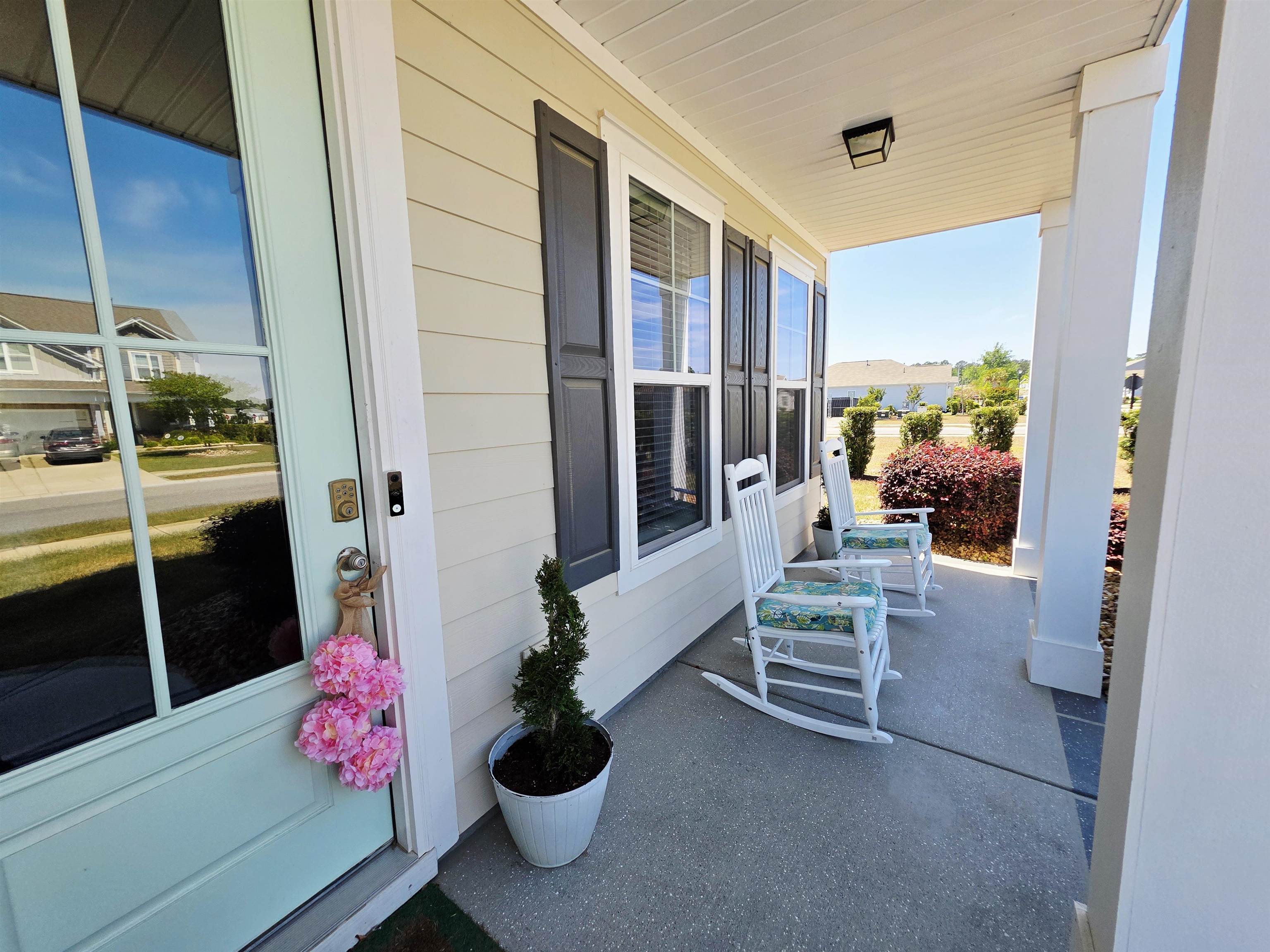 Beautiful two-story home with Hardie board siding and a charming double front porch, located on a desirable corner lot in a resort-style community. This open floor plan features a spacious great room and hardwood-look tile throughout the main living areas on the first floor. The kitchen is beautifully appointed with custom cabinetry, quartz countertops, tiled backsplash, stainless steel appliances including a gas stove, and a butler’s pantry. A formal dining room or office adds flexibility, and a guest bedroom with a full bath is conveniently located on the first floor. Upstairs, you’ll find a huge loft with ample closet space, two guest bedrooms, a laundry room, and a grand owner’s suite complete with a separate sitting area, walk-in closet, dual vanity areas, and an oversized tiled spa-style shower. This home was built in 2019 and is in excellent condition, as it was only used a few months each year as a second home. Outdoor features include a screened-in back porch, an additional side patio perfect for grilling, and a beautifully painted and stamped driveway featuring an eye-catching design of two palm trees that adds incredible curb appeal. Enjoy living like you’re on vacation with community amenities that include a resort-style pool and hot tub, air-conditioned pickleball court and meeting space, walking trails, and a short golf cart ride to the shops, dining, and attractions of The Market Common, as well as the beach. This is a must-see property that combines style, comfort, and coastal lifestyle.