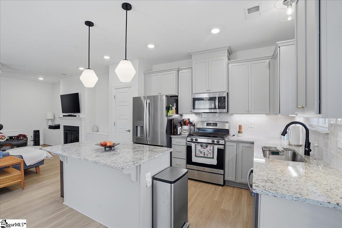 Welcome to this beautifully maintained 2021 Cothran built townhouse nestled in the sought-after Madison Park community — just minutes from Woodruff Road's shopping, dining, and entertainment! This 3BR/2.5BA offers a thoughtfully designed living space with high-end finishes throughout. The main level impresses with 9' smooth ceilings, an open floor plan, granite countertops, gas range, built-in microwave, and a spacious dining area perfect for entertaining. A cozy gas log fireplace anchors the living room, while a front porch and rear patio extend your living space outdoors. The full yard irrigation system keeps everything lush with no extra effort. Upstairs, the generous primary suite features double sinks, a walk-in closet, and a private shower — a true retreat at the end of the day. Two additional bedrooms, a full bath, and a convenient walk-in laundry room complete the upper level. The attached one-car garage includes extra driveway parking. Best of all — the HOA covers exterior maintenance, lawn care and termite contract making this truly low-maintenance living at its finest. Located in the Mauldin school district with easy access to I-385 — this one won't last long. Schedule your showing today.