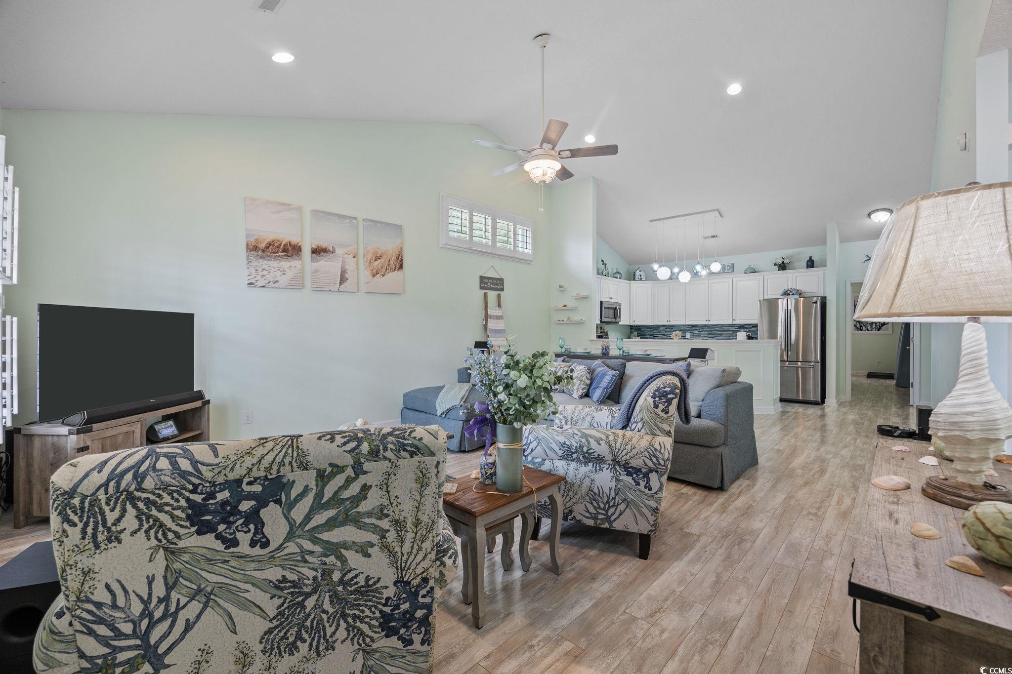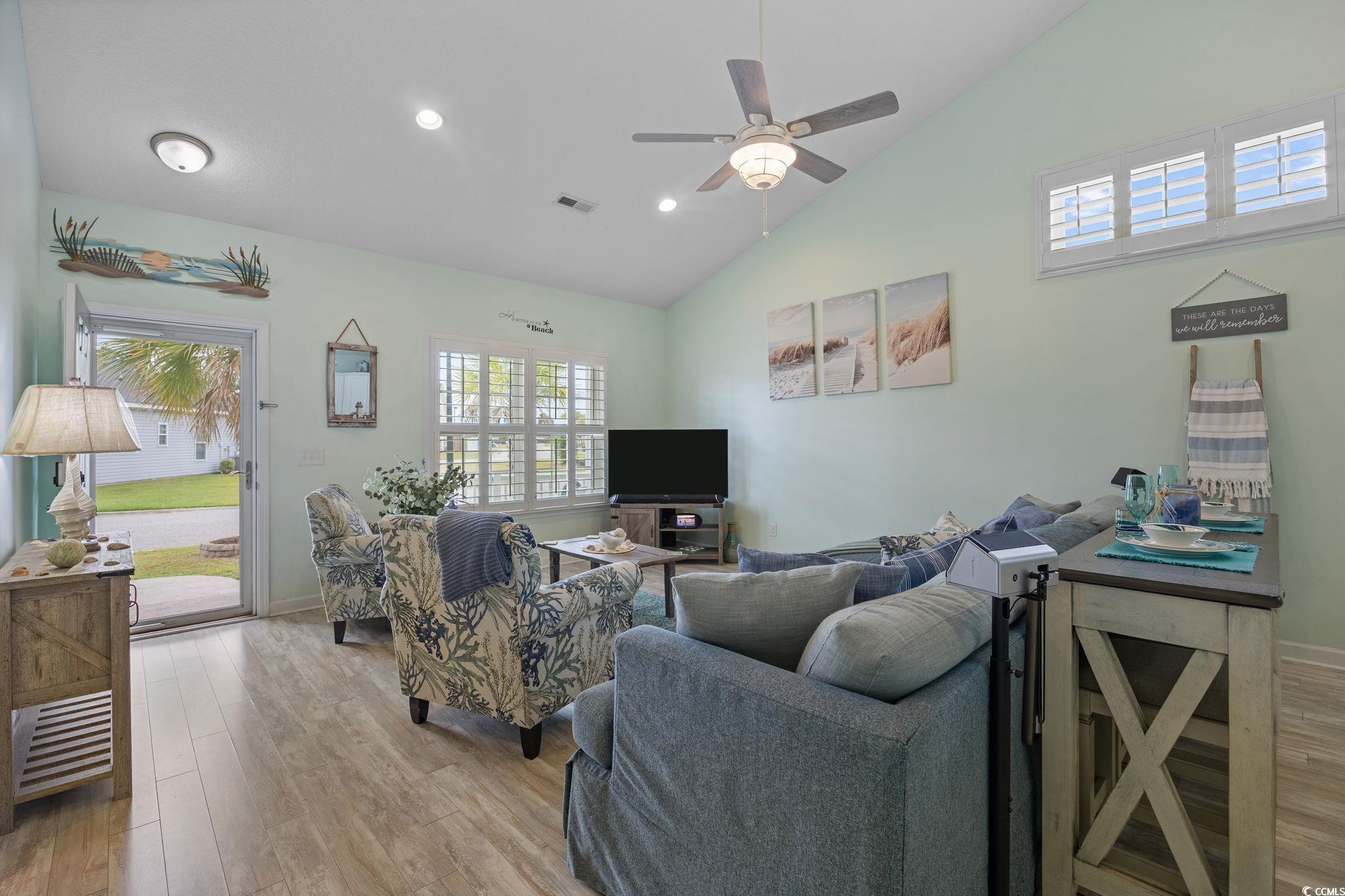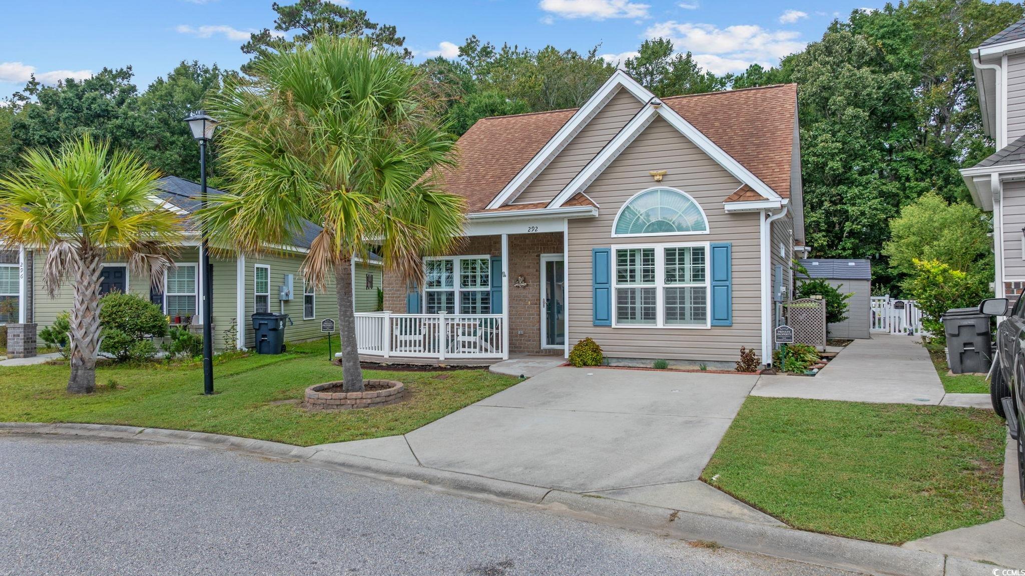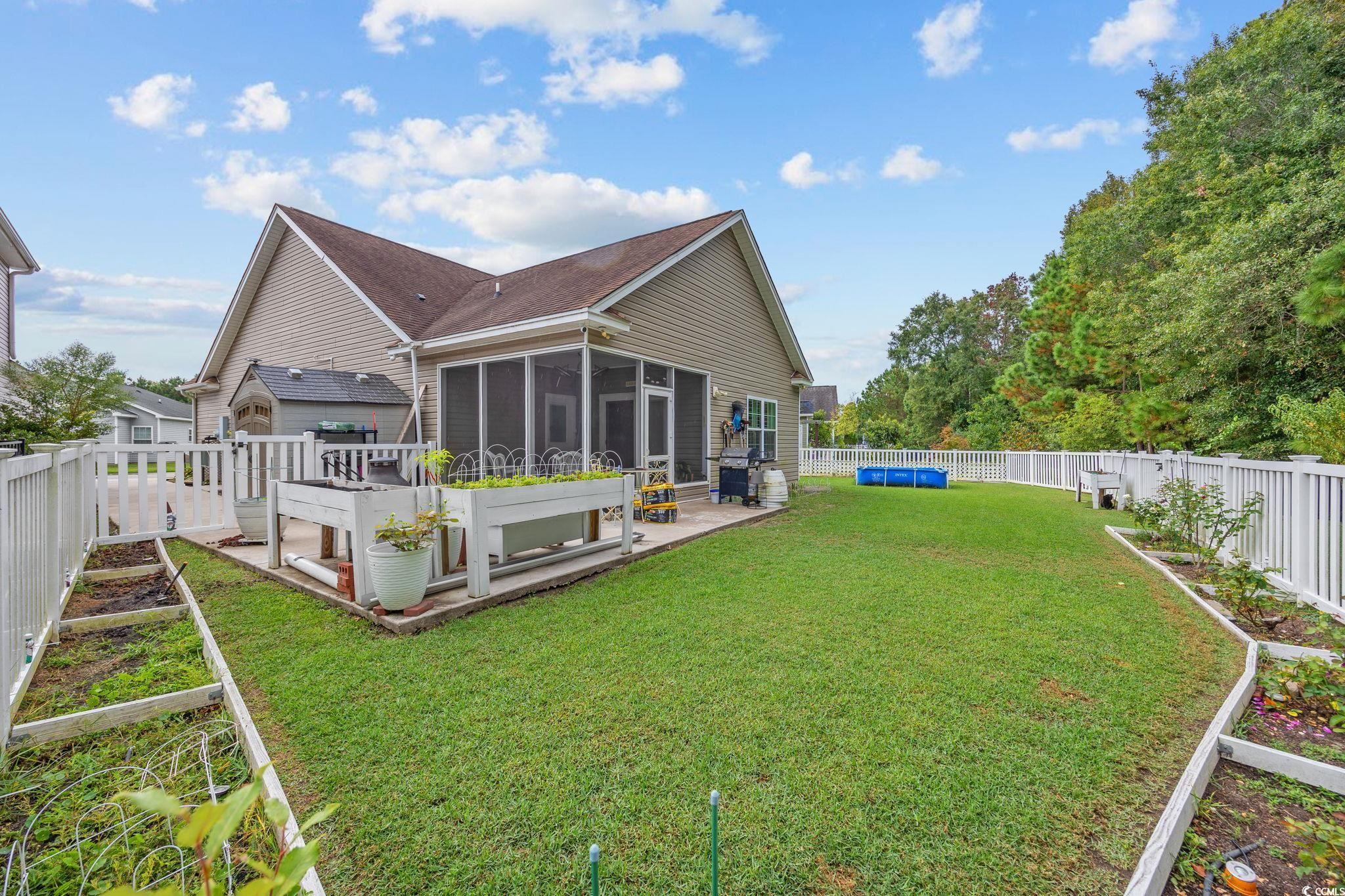 Welcome to this move in ready 3-bedroom, 2-bath home in the charming Palm Cove community. This home is being sold fully furnished; everything conveys except clothing and personal items. Tucked away in a quiet subdivision, this property features a 2-car driveway, charming front porch, and an extended sidewalk leading to the side of the home with detached outdoor storage. Inside, you’ll find a bright and airy living room with vaulted ceilings, Laminate throughout, plantation shutters, and breezy coastal-inspired paint and décor. The kitchen is a standout with stainless steel appliances, quartz countertops, abundant cabinetry, and a breakfast bar for casual dining. A dedicated laundry room offers added convenience with the washer and dryer included, cabinets for extra storage, and tile flooring. The spacious primary suite includes a private bath with a large vanity and walk-in shower. Two additional bedrooms and a full guest bath provide plenty of space for family or guests. Step outside to enjoy the screened-in back porch and extended patio, perfect for entertaining or relaxing. The fenced backyard is a true oasis, complete with raised garden beds and plenty of room to play or unwind. Don’t miss the chance to make this move-in ready home yours!