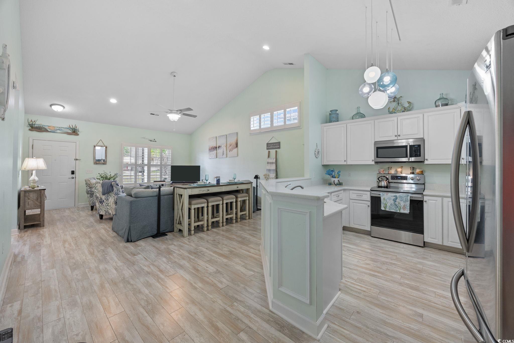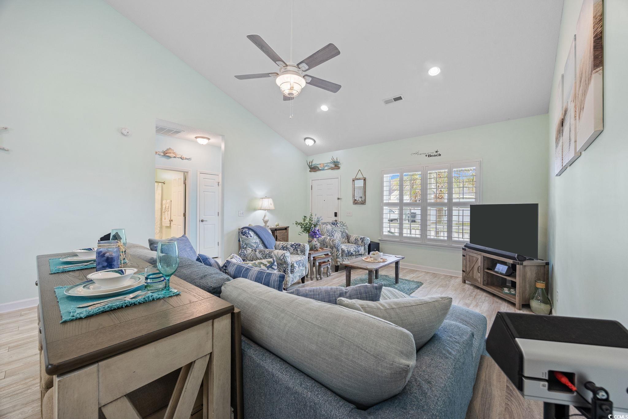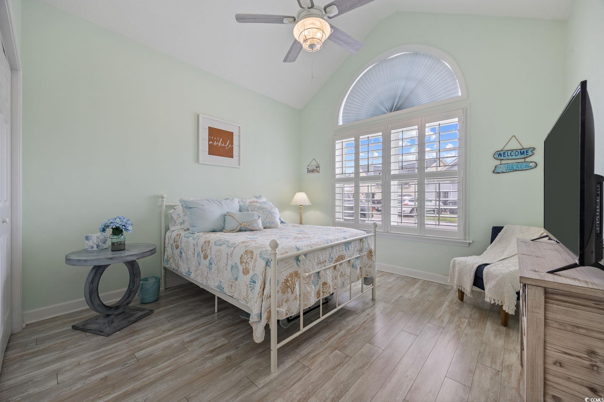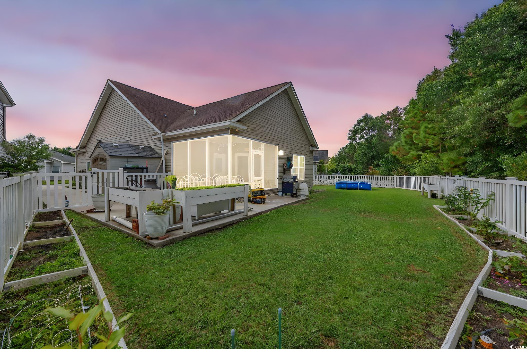 Welcome to this move in ready 3-bedroom, 2-bath home in the charming Palm Cove community. This home is being sold fully furnished; everything conveys except clothing and personal items. Tucked away in a quiet subdivision, this property features a 2-car driveway, charming front porch, and an extended sidewalk leading to the side of the home with detached outdoor storage. Inside, you’ll find a bright and airy living room with vaulted ceilings, Laminate throughout, plantation shutters, and breezy coastal-inspired paint and décor. The kitchen is a standout with stainless steel appliances, quartz countertops, abundant cabinetry, and a breakfast bar for casual dining. A dedicated laundry room offers added convenience with the washer and dryer included, cabinets for extra storage, and tile flooring. The spacious primary suite includes a private bath with a large vanity and walk-in shower. Two additional bedrooms and a full guest bath provide plenty of space for family or guests. Step outside to enjoy the screened-in back porch and extended patio, perfect for entertaining or relaxing. The fenced backyard is a true oasis, complete with raised garden beds and plenty of room to play or unwind. Don’t miss the chance to make this move-in ready home yours!