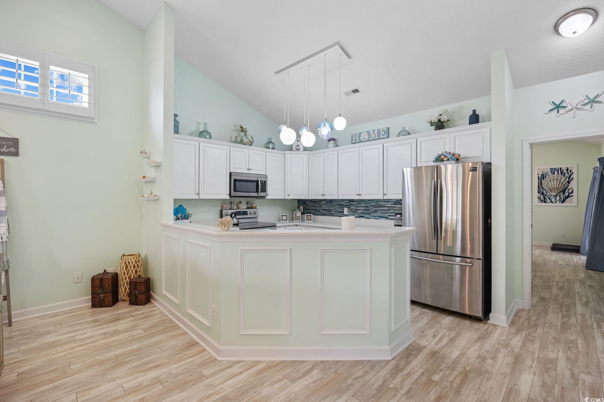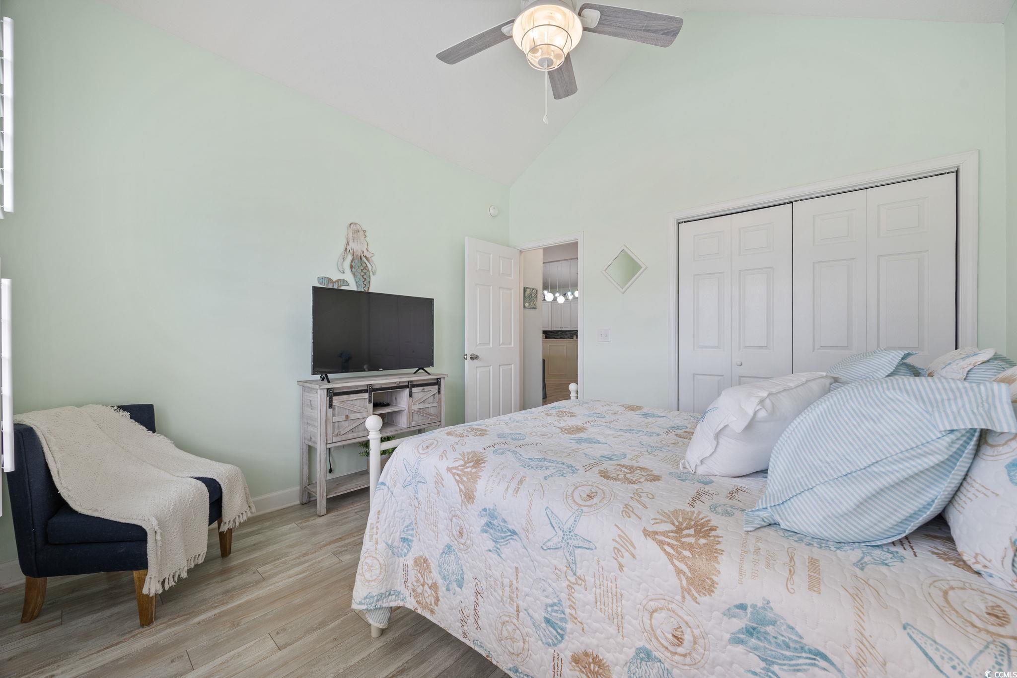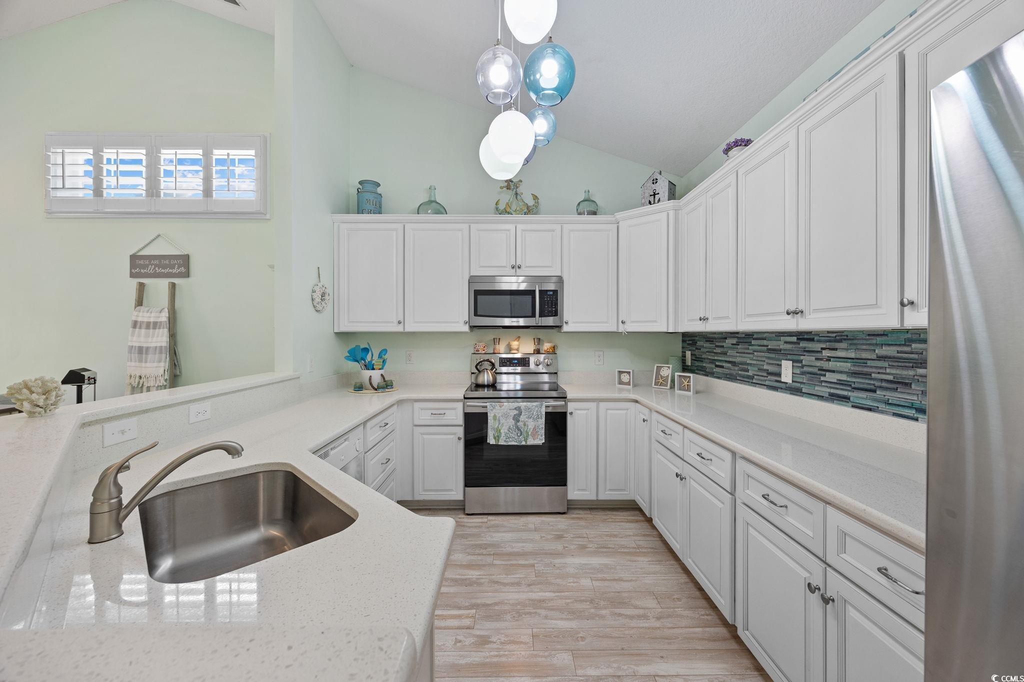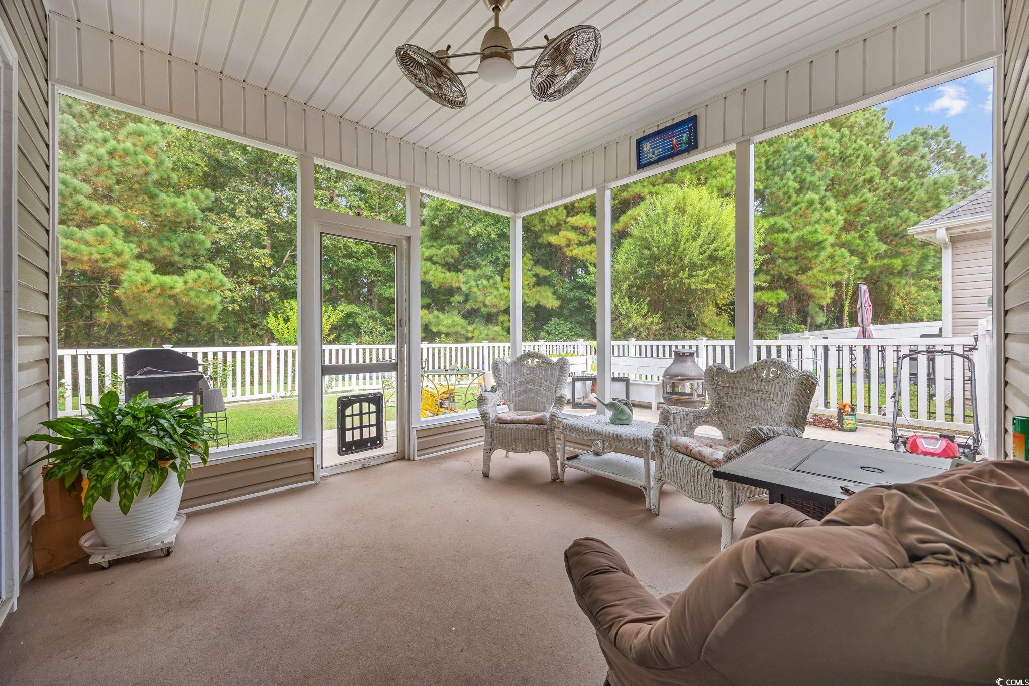 Welcome to this move in ready 3-bedroom, 2-bath home in the charming Palm Cove community. This home is being sold fully furnished; everything conveys except clothing and personal items. Tucked away in a quiet subdivision, this property features a 2-car driveway, charming front porch, and an extended sidewalk leading to the side of the home with detached outdoor storage. Inside, you’ll find a bright and airy living room with vaulted ceilings, Laminate throughout, plantation shutters, and breezy coastal-inspired paint and décor. The kitchen is a standout with stainless steel appliances, quartz countertops, abundant cabinetry, and a breakfast bar for casual dining. A dedicated laundry room offers added convenience with the washer and dryer included, cabinets for extra storage, and tile flooring. The spacious primary suite includes a private bath with a large vanity and walk-in shower. Two additional bedrooms and a full guest bath provide plenty of space for family or guests. Step outside to enjoy the screened-in back porch and extended patio, perfect for entertaining or relaxing. The fenced backyard is a true oasis, complete with raised garden beds and plenty of room to play or unwind. Don’t miss the chance to make this move-in ready home yours!