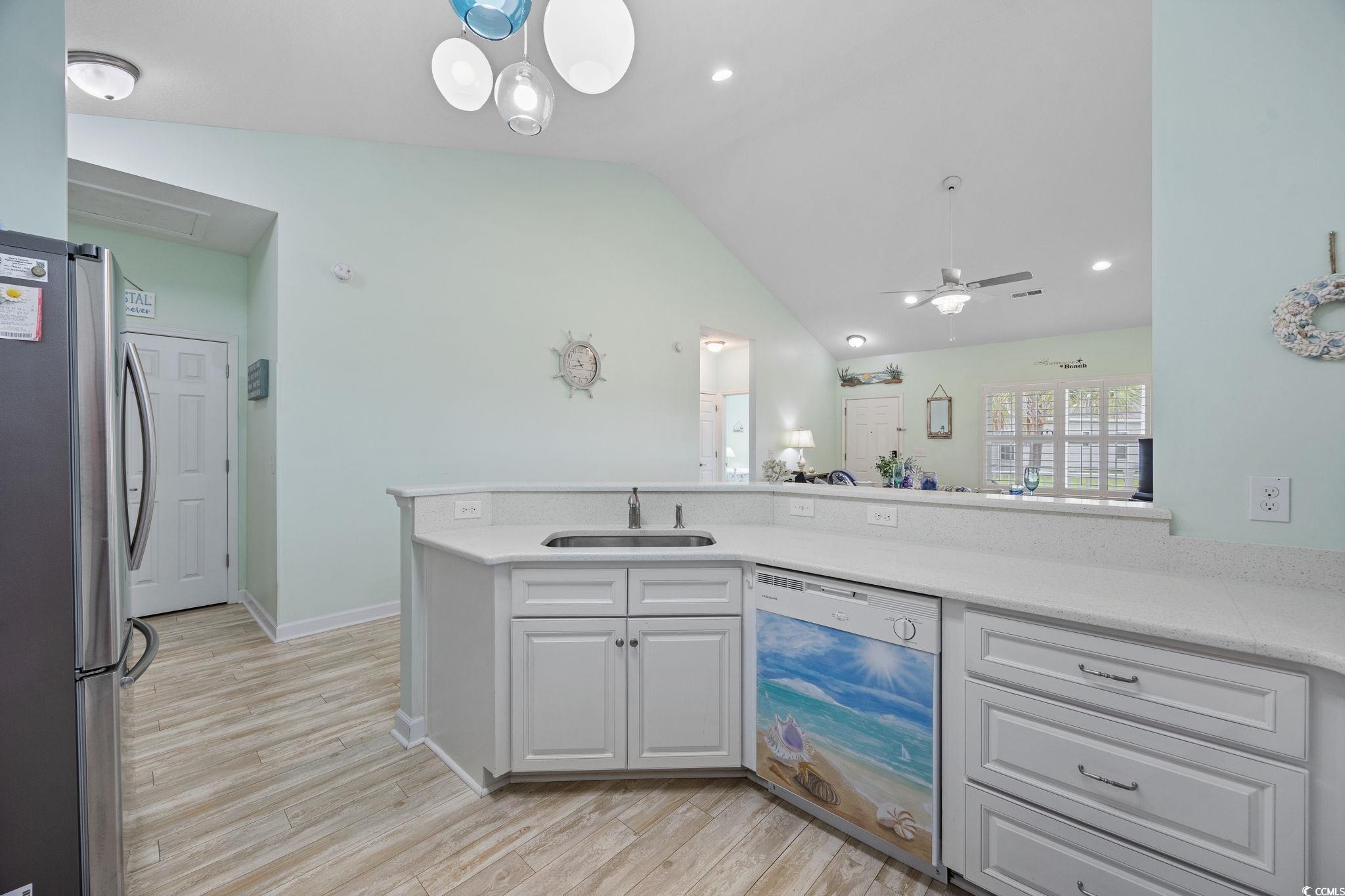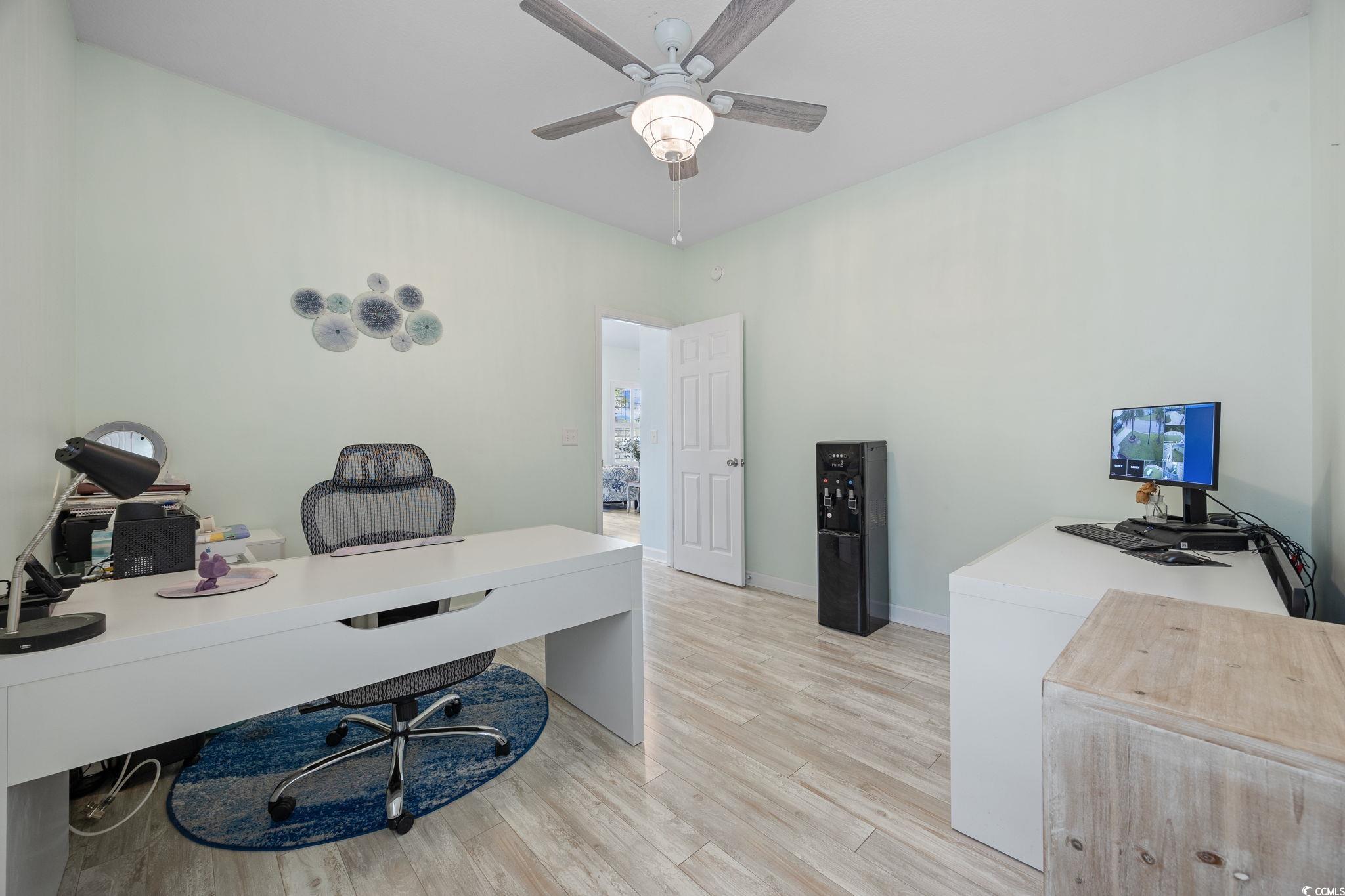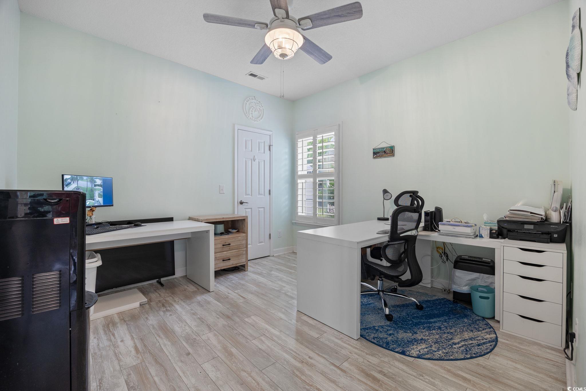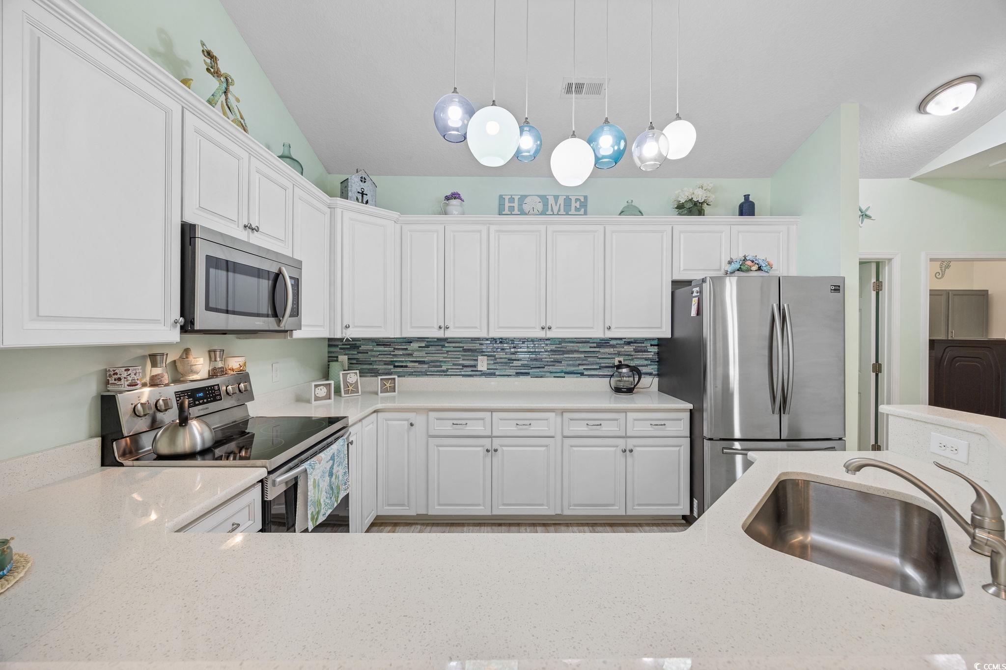 Welcome to this move in ready 3-bedroom, 2-bath home in the charming Palm Cove community. This home is being sold fully furnished; everything conveys except clothing and personal items. Tucked away in a quiet subdivision, this property features a 2-car driveway, charming front porch, and an extended sidewalk leading to the side of the home with detached outdoor storage. Inside, you’ll find a bright and airy living room with vaulted ceilings, Laminate throughout, plantation shutters, and breezy coastal-inspired paint and décor. The kitchen is a standout with stainless steel appliances, quartz countertops, abundant cabinetry, and a breakfast bar for casual dining. A dedicated laundry room offers added convenience with the washer and dryer included, cabinets for extra storage, and tile flooring. The spacious primary suite includes a private bath with a large vanity and walk-in shower. Two additional bedrooms and a full guest bath provide plenty of space for family or guests. Step outside to enjoy the screened-in back porch and extended patio, perfect for entertaining or relaxing. The fenced backyard is a true oasis, complete with raised garden beds and plenty of room to play or unwind. Don’t miss the chance to make this move-in ready home yours!