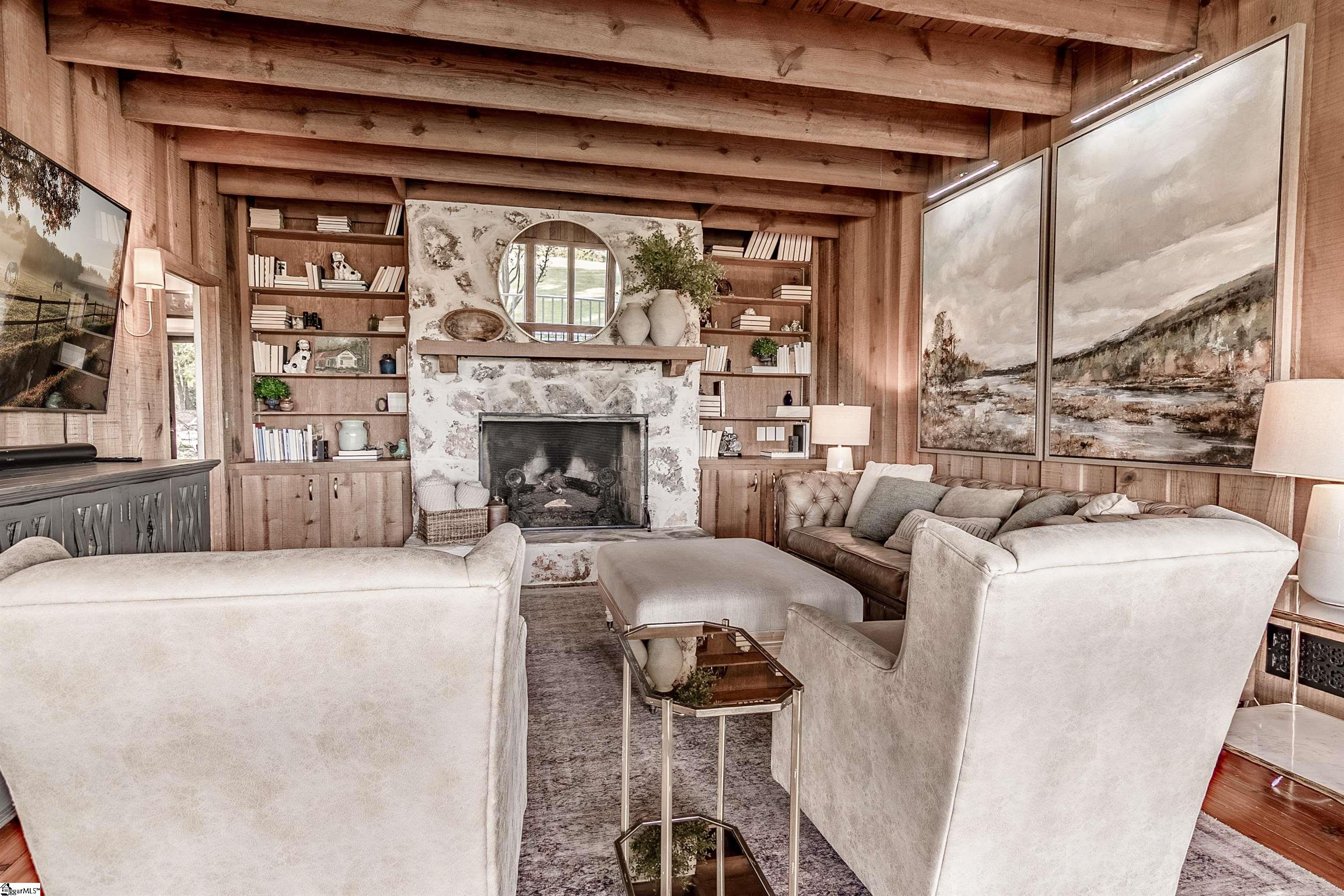 Wake up to inspiring views every day in this luxurious yet welcoming home, purposefully designed to maximize your ability to enjoy the beauty of its 5.4-acre setting in the sought-after Country Place subdivision--so close to everything yet feels like your own world. This 4 bedroom, 3.5 bath unique custom home offers timeless charm, modern updates, and spaces designed for gathering. The main floor showcases a stunning living room with rough-hewn cedar paneling, a floor-to-ceiling stone fireplace with gas logs, built-in bookcases, and an entire wall of windows overlooking the lush acreage. The beautifully remodeled kitchen (2022) is an entertainer’s dream, featuring walls of windows, a massive island with a second sink, dual dishwashers, a built-in full-size refrigerator and freezer, a walk-in pantry with granite countertop, and an abundance of cabinet storage. The formal dining room is ideal for hosting large gatherings, while the flex room with fireplace can serve as an office or a formal living room. Also on the main floor is a half bath, as well as a bedroom with an en suite bathroom and access to the back porch. The expansive covered back porch is perfect for watching sunrises and moonrises that will absolutely take your breath away. Upstairs, the primary suite includes balcony access, a completely renovated spa-like bath (2019) with dual vanities, quartzite countertops, a large walk-in shower, and dual walk-in closets. Two additional bedrooms feature built-in desks, shelving, and private sink/cabinet areas with a shared tub and toilet, plus access to a bonus room that could serve as a 5th bedroom. From the hallway, there is also access to the balcony for everyone to enjoy the view. Continue up to the top level, where a skylit landing creates a cozy reading nook or hobby space, flanked by two walk-in attic rooms that provide abundant storage. On the basement level, a finished recreation room with wet bar and a floor-to-ceiling stone fireplace with gas logs—another perfect spot for entertaining. You’ll also find an oversized 2-car garage and an additional storage room. This special home was thoughtfully designed to take in its beautiful natural surroundings—from the wooded front to the expansive back acreage. Here, every sunrise feels like a gift, and every gathering is made more special by the storybook setting. ***Seller is a licensed Realtor***