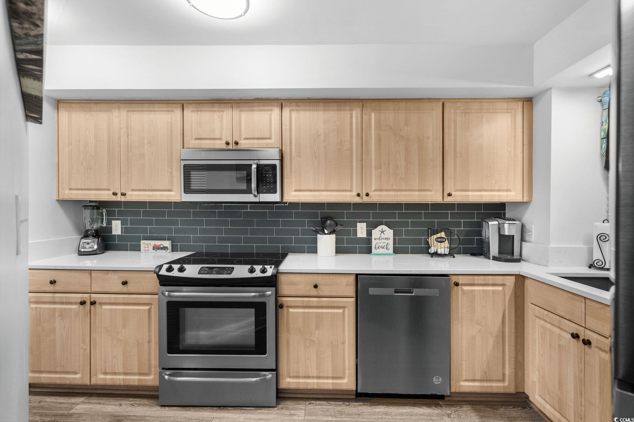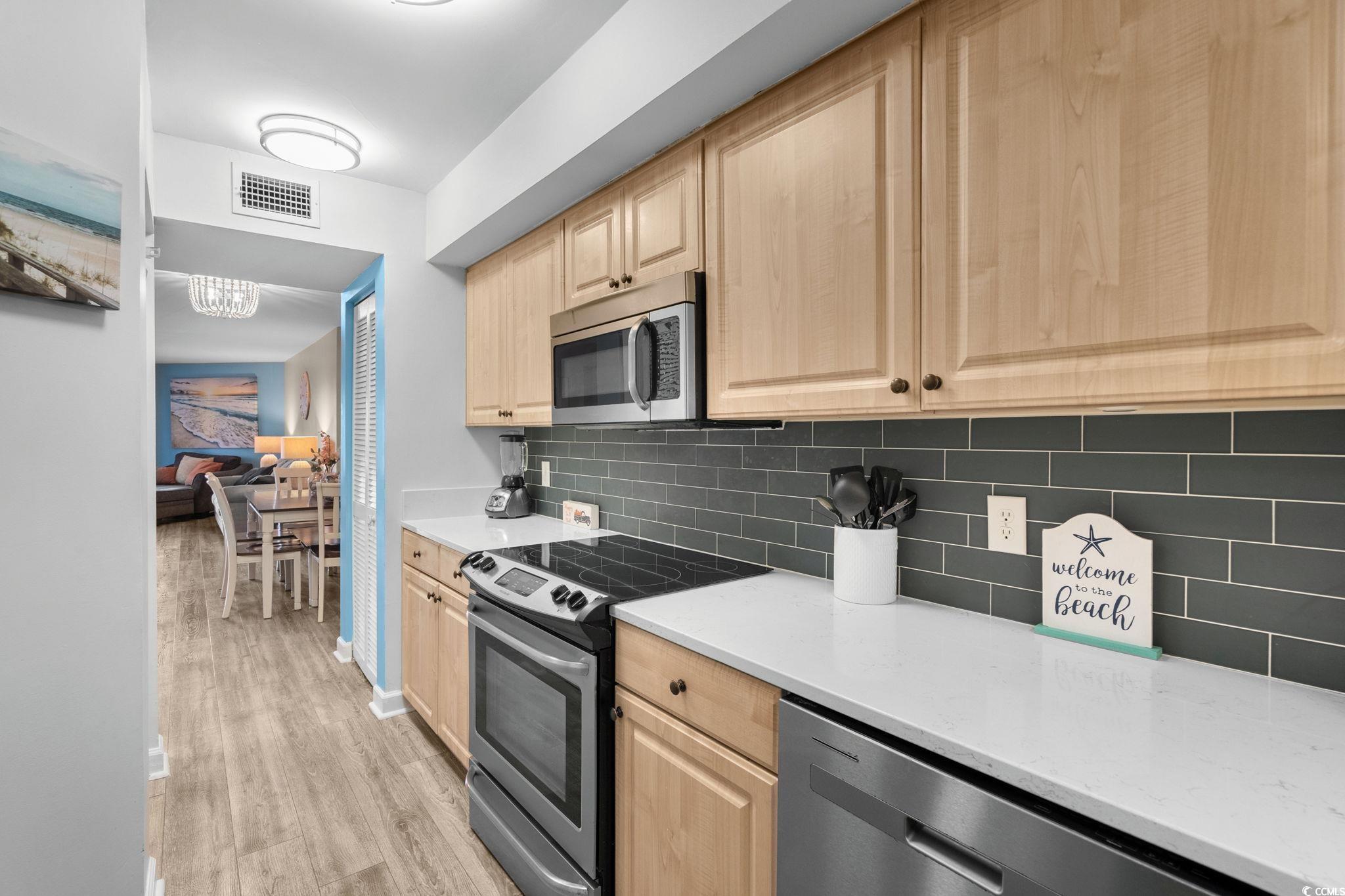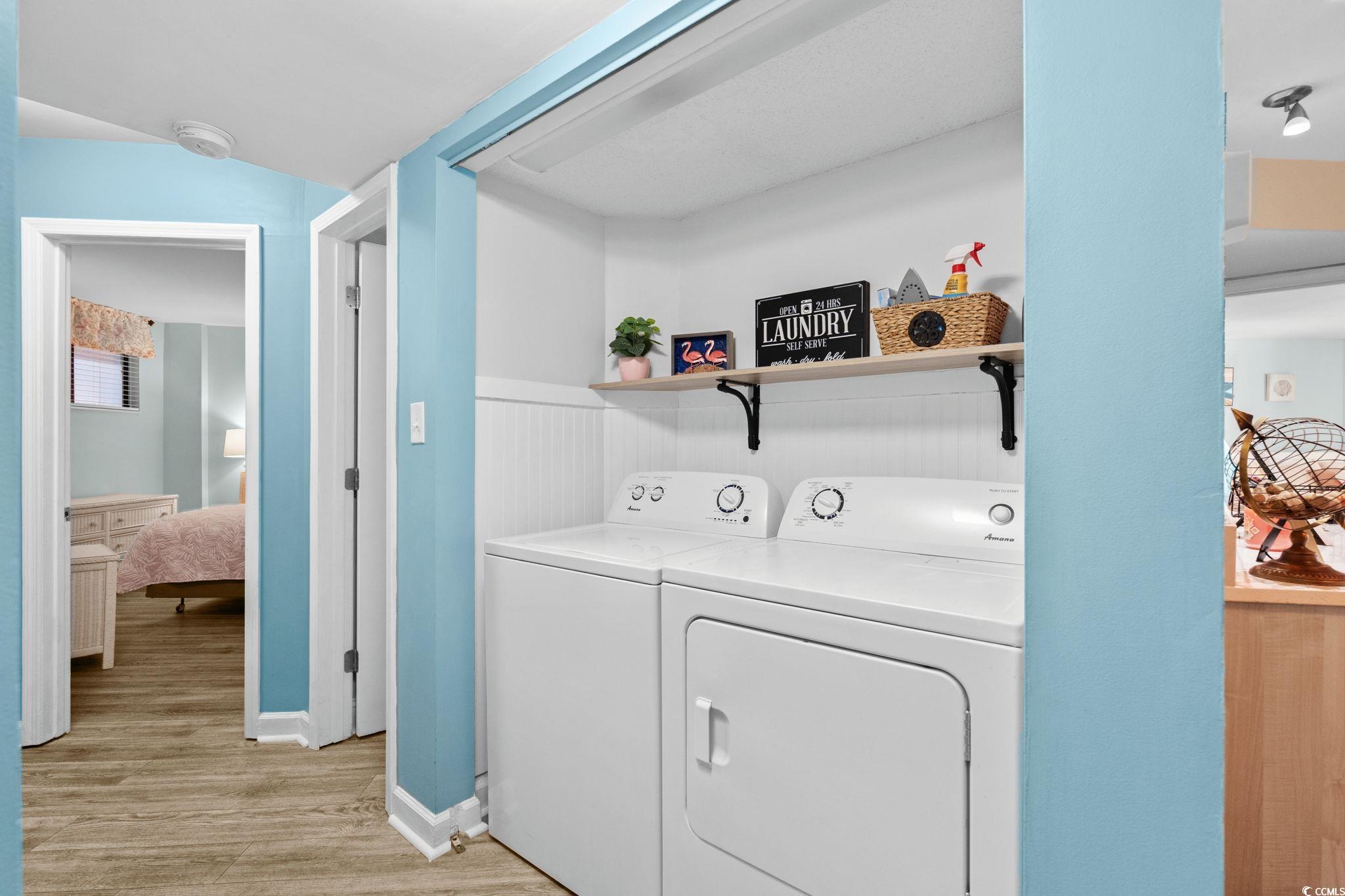 Located just steps away from the beach, this fully furnished 2-bedroom, 2-bathroom condo offers the perfect blend of comfort and convenience. Situated on the second row directly across from the ocean, you'll enjoy easy beach access and stunning views. Inside, the condo features high-quality engineered wood flooring throughout and a modern kitchen with sleek quartz countertops and stainless steel appliances. Recent updates include a newer sofa and chair in the living room, a newer washer and dryer, water heater, dishwasher, and newer queen bed frames with mattresses — making this home truly move-in ready. The spacious primary bedroom opens to a large, tiled balcony — ideal for morning coffee or evening sunsets. The living room also provides balcony access, filling the space with natural light and ocean breezes. The balcony overlooks the community pool, a perfect spot to cool off during warm summer days. Additional conveniences include a storage unit on the lower level for all your beach gear or outdoor hobby equipment. This condo is centrally located on the desirable North end of Myrtle Beach, placing you close to all the area’s top attractions such as Broadway at the Beach, Carolina Opry, renowned restaurants, shopping, golf courses, and medical facilities. Don’t miss this rare opportunity to enjoy beachside living with modern upgrades and unbeatable access to everything Myrtle Beach has to offer. Pack your bags and start living the coastal lifestyle today!