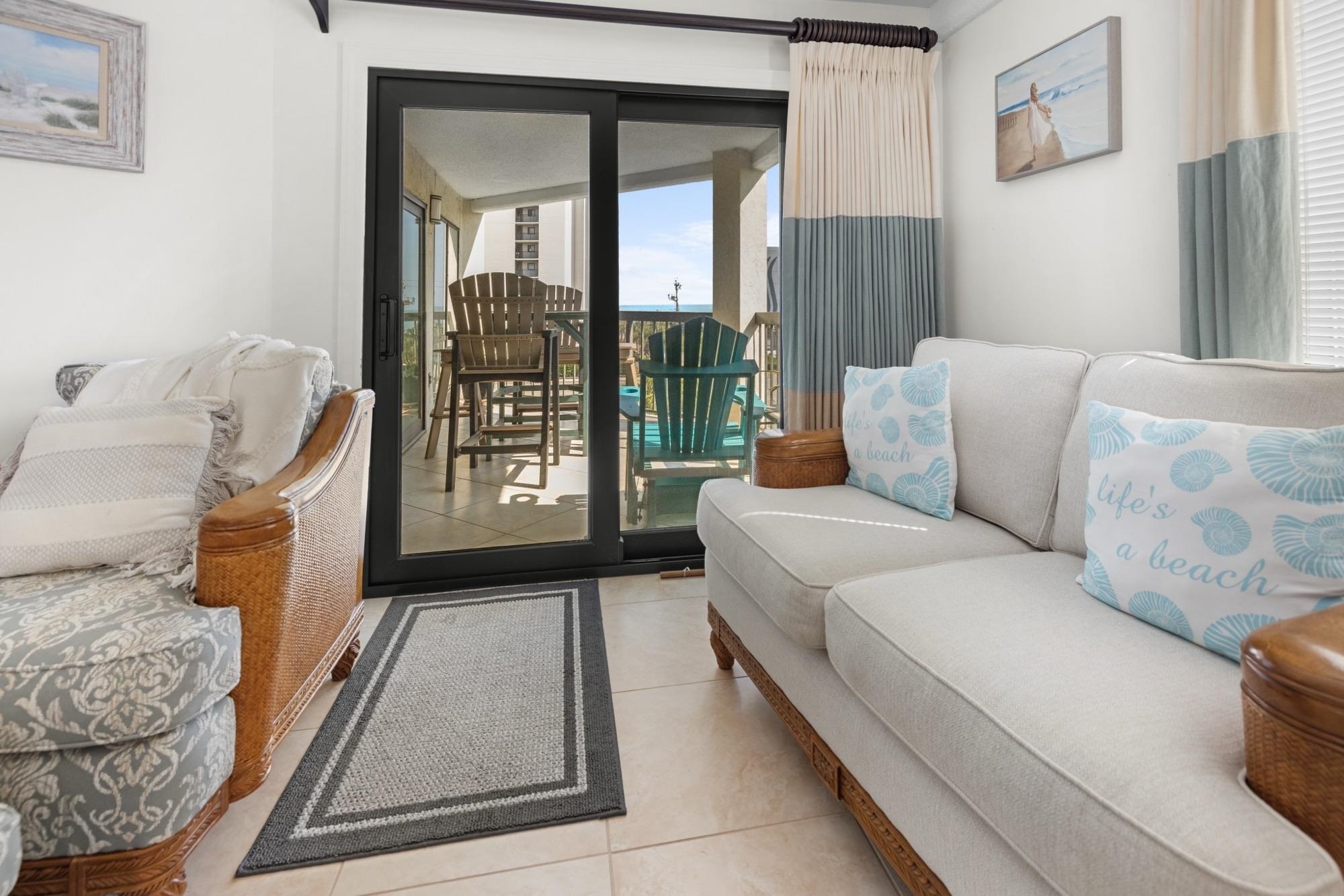 Experience coastal living at its finest in this beautifully appointed 3-bedroom, 3-bath corner unit with ocean views, located on the fourth floor of a highly desirable boutique condominium. Just steps from the beach, this residence offers stunning ocean views from a private balcony, accessible from the living room, and the master bedroom; perfect for relaxing or entertaining. Designed with a split-bedroom floor plan for optimal privacy, each bedroom features its own ensuite bathroom with granite countertops and custom built-ins. The spacious primary suite boasts a large walk-in closet complete with built-ins and an in-wall lockable safe. Additional highlights include a dedicated ground-level storage unit (6 x 5), ideal for bicycles, beach gear, and outdoor equipment. With its prime location, thoughtful layout, and upscale finishes, this condo is the perfect blend of comfort, convenience, and coastal charm. This condo has been used as a second home, and has never been rented. Shopping, dining, and entertainment facilities are nearby.