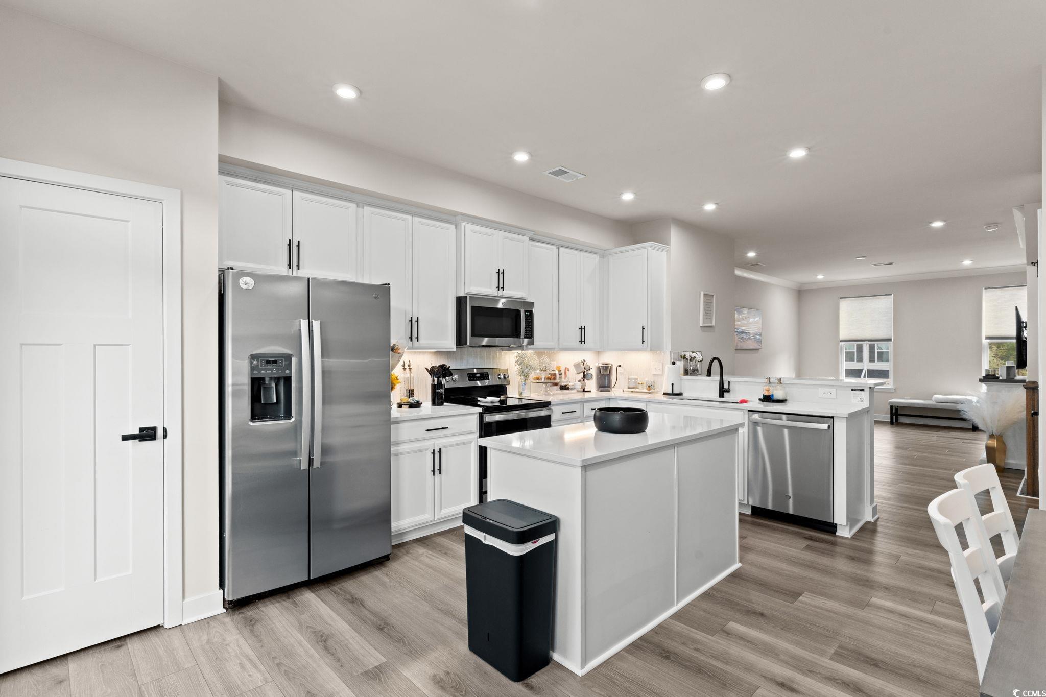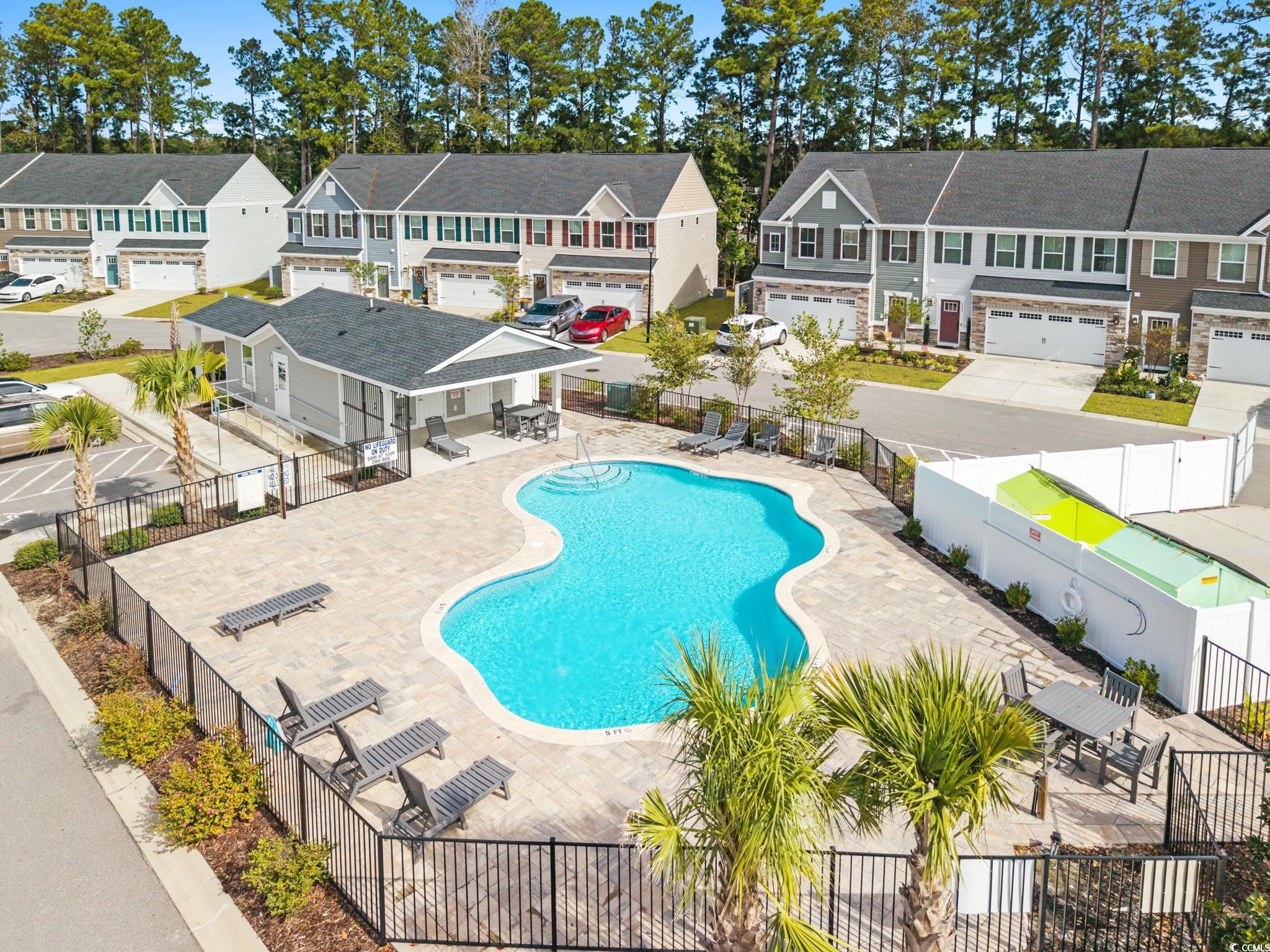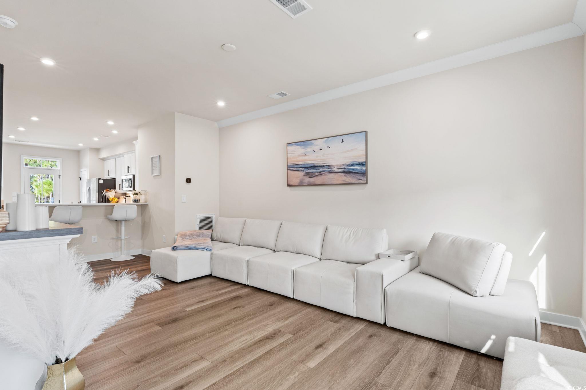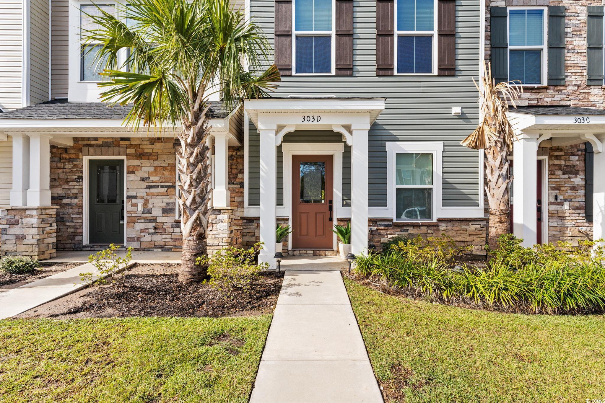 Welcome to 303 Golan Circle Unit D in Forest Pines, a modern 3-story townhome offering 3 bedrooms, 3.5 bathrooms, and nearly-new construction built in 2023! This move-in-ready home showcases luxury vinyl plank flooring, stainless steel appliances (including refrigerator), solid surface countertops, crown molding, and a tile backsplash for a sleek, polished look. Enjoy the open-concept layout with plenty of natural light, a spacious kitchen and dining area, and a private deck perfect for relaxing or entertaining. Each bedroom features its own full bath, including a large primary suite with a walk-in shower and generous closet space. The ground-level flex room opens to a rear patio and fenced backyard overlooking a wooded area, creating a peaceful and private retreat. Located near Arrowhead Golf Course, Tanger Outlets, Coastal Grand Mall, Myrtle Beach Airport, and just minutes to the beach, this home delivers modern coastal living at its finest. The HOA covers landscaping, exterior insurance, trash, and access to the community pool and clubhouse, offering true low-maintenance living in the heart of Myrtle Beach!