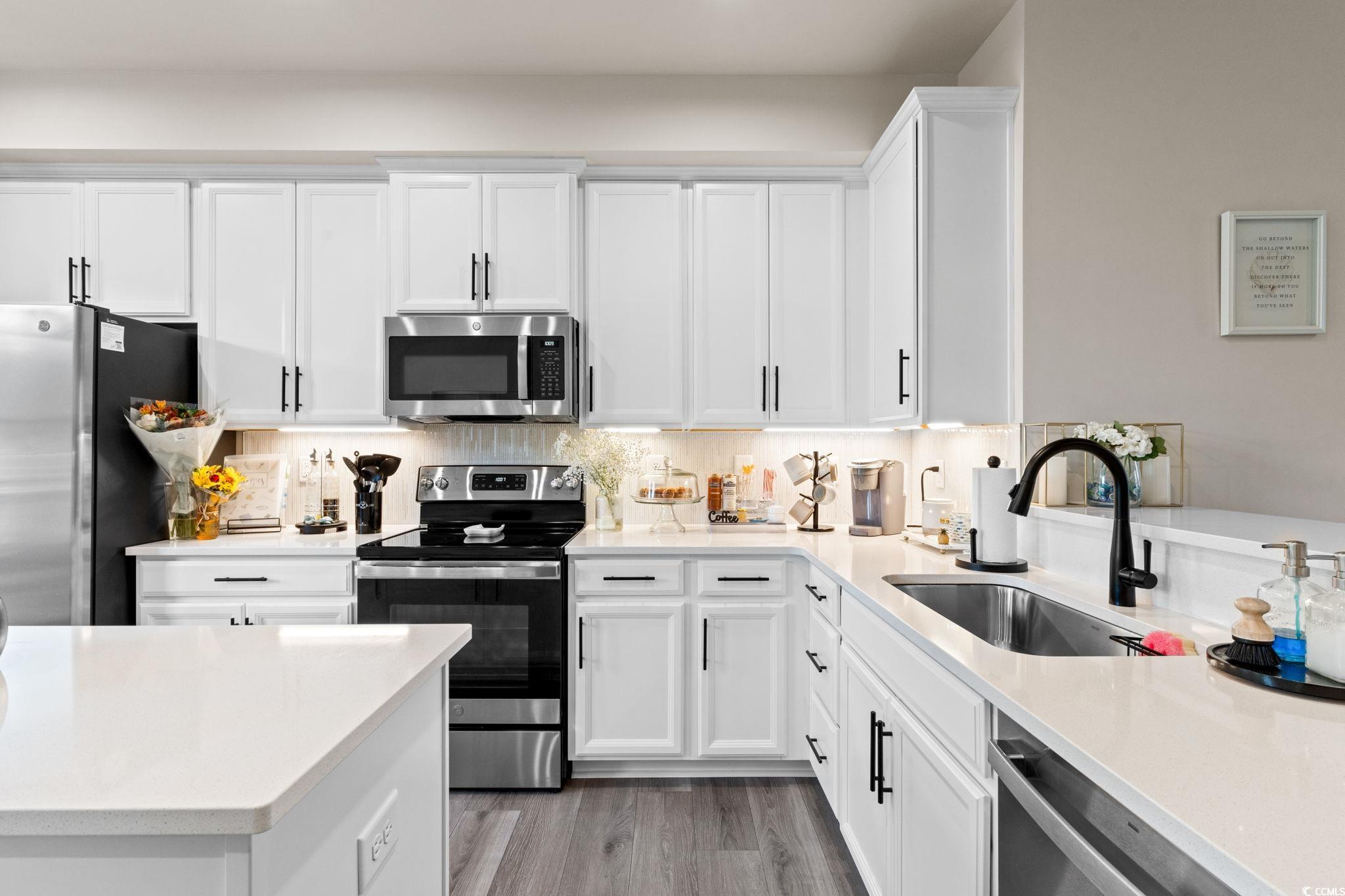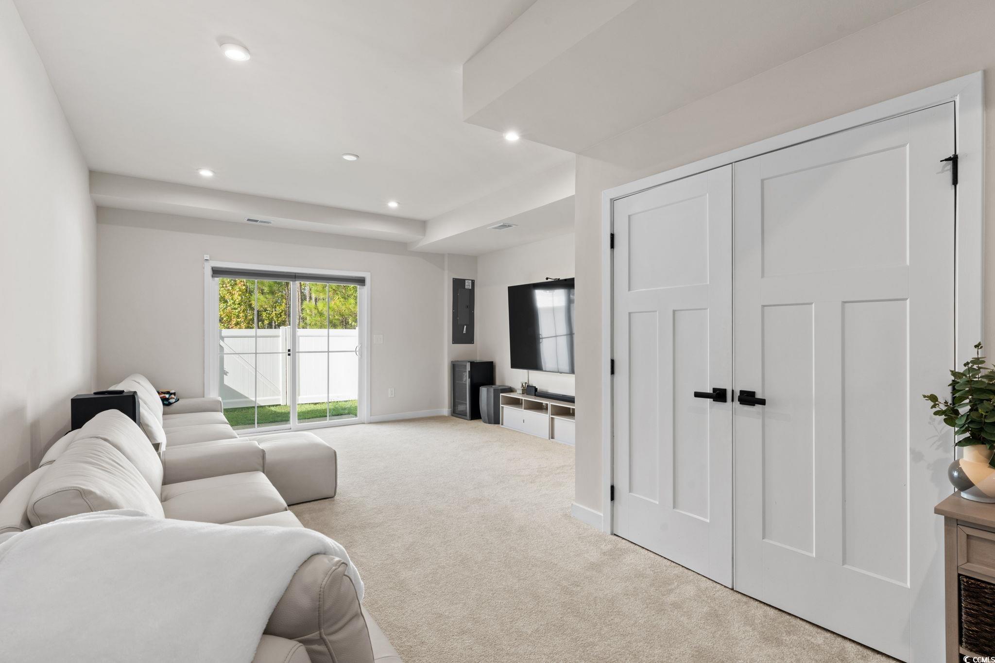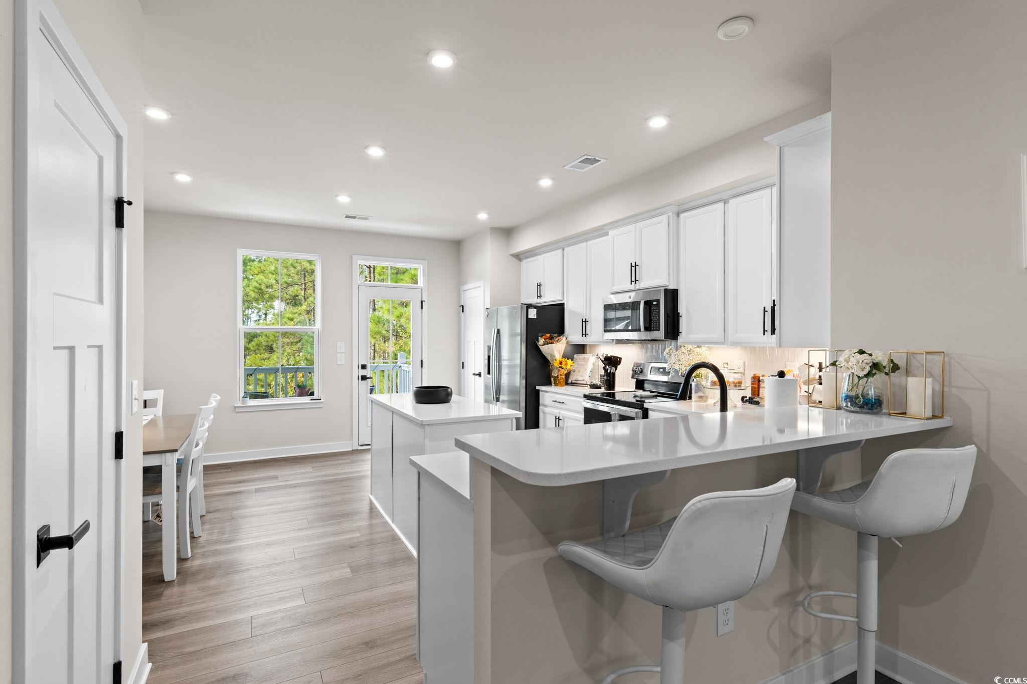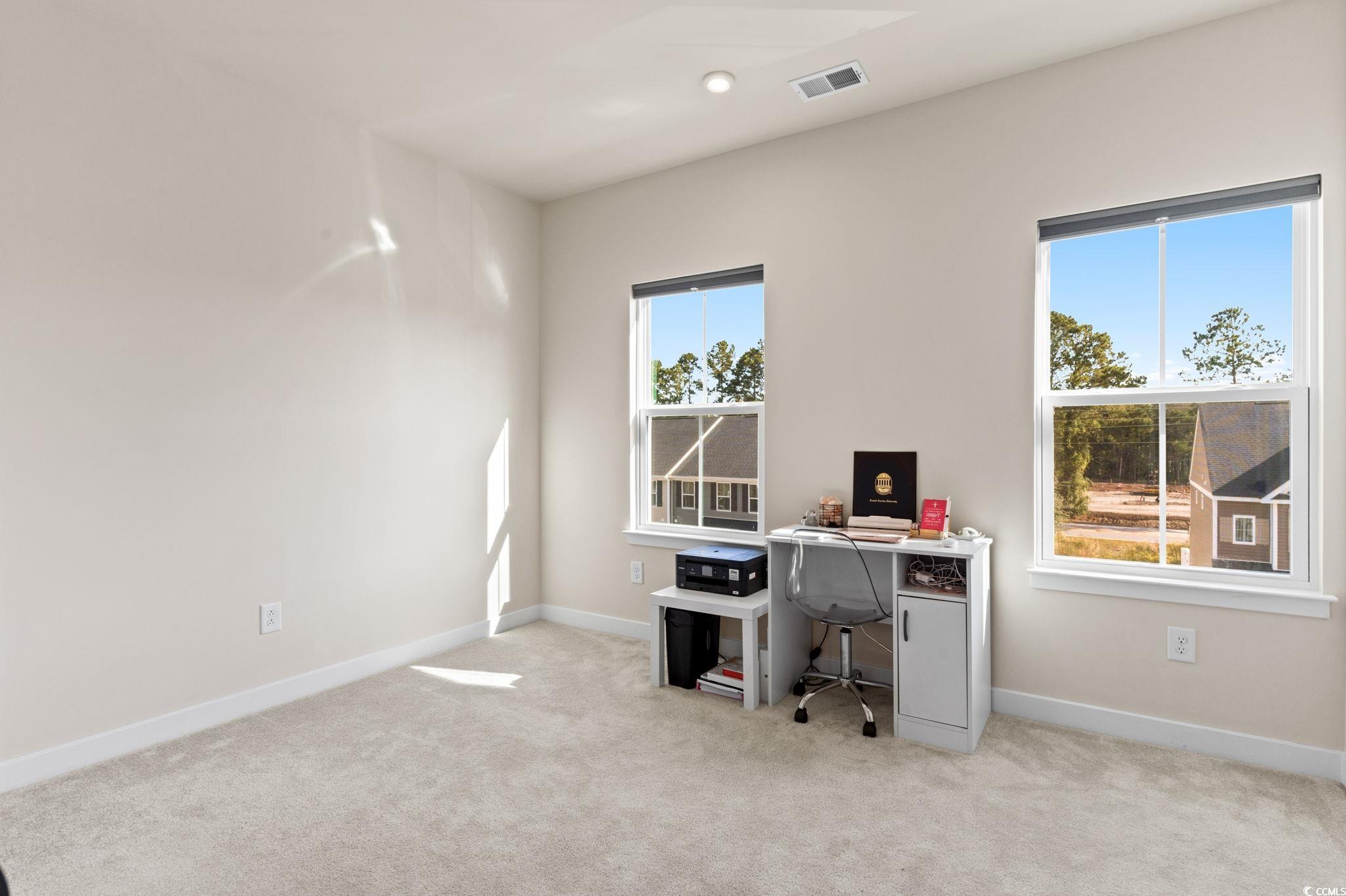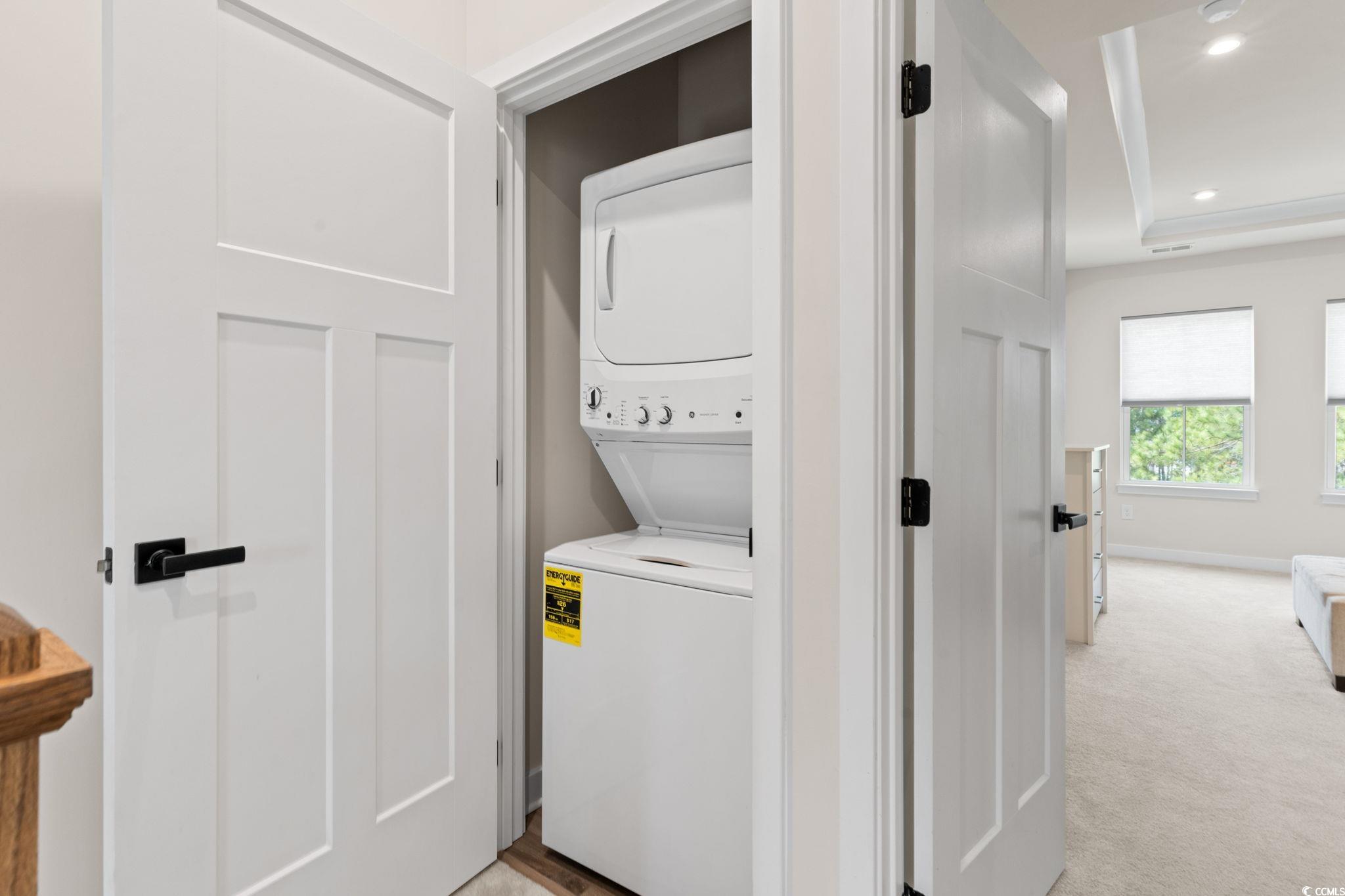 Welcome to 303 Golan Circle Unit D in Forest Pines, a modern 3-story townhome offering 3 bedrooms, 3.5 bathrooms, and nearly-new construction built in 2023! This move-in-ready home showcases luxury vinyl plank flooring, stainless steel appliances (including refrigerator), solid surface countertops, crown molding, and a tile backsplash for a sleek, polished look. Enjoy the open-concept layout with plenty of natural light, a spacious kitchen and dining area, and a private deck perfect for relaxing or entertaining. Each bedroom features its own full bath, including a large primary suite with a walk-in shower and generous closet space. The ground-level flex room opens to a rear patio and fenced backyard overlooking a wooded area, creating a peaceful and private retreat. Located near Arrowhead Golf Course, Tanger Outlets, Coastal Grand Mall, Myrtle Beach Airport, and just minutes to the beach, this home delivers modern coastal living at its finest. The HOA covers landscaping, exterior insurance, trash, and access to the community pool and clubhouse, offering true low-maintenance living in the heart of Myrtle Beach!