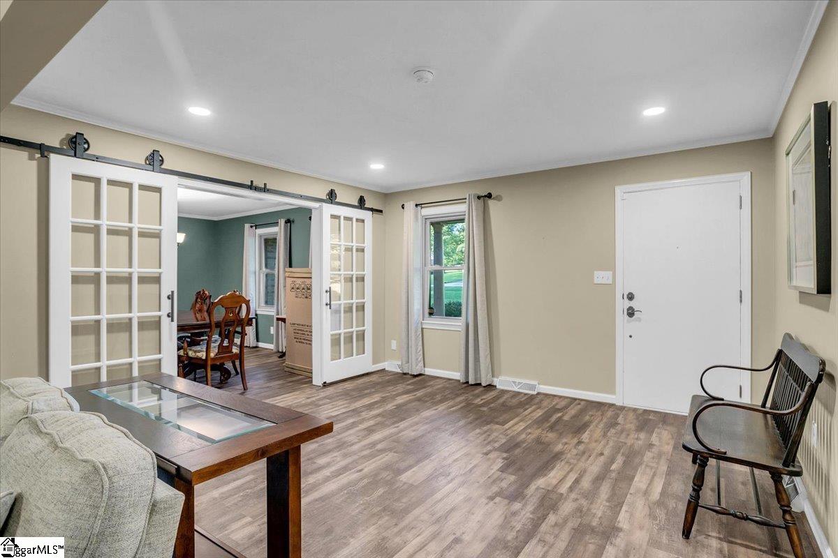 A beautiful 3-bedroom, 2-bathroom brick ranch situated on a private 1.56-acre lot in Laurens. This well-maintained home offers a peaceful setting and is conveniently located to town amenities. The property features an extra-wide lot backed by a private nature preserve, offering enhanced privacy. Enjoy cozying up with a good book or cup of coffee on your screened porch overlooking nature. The interior boasts a recently renovated kitchen that includes a wall-mounted oven, countertop electric stove, subway tile backsplash, and a unique, hidden pantry concealed behind custom shelving. A spacious, open family room with a wood-burning fireplace completes the main living areas. Additional features include a large, unfinished walk-out basement, providing endless potential for storage or expansion. The property also offers ample parking with both a dual carport and a detached two-car garage equipped with electricity.
