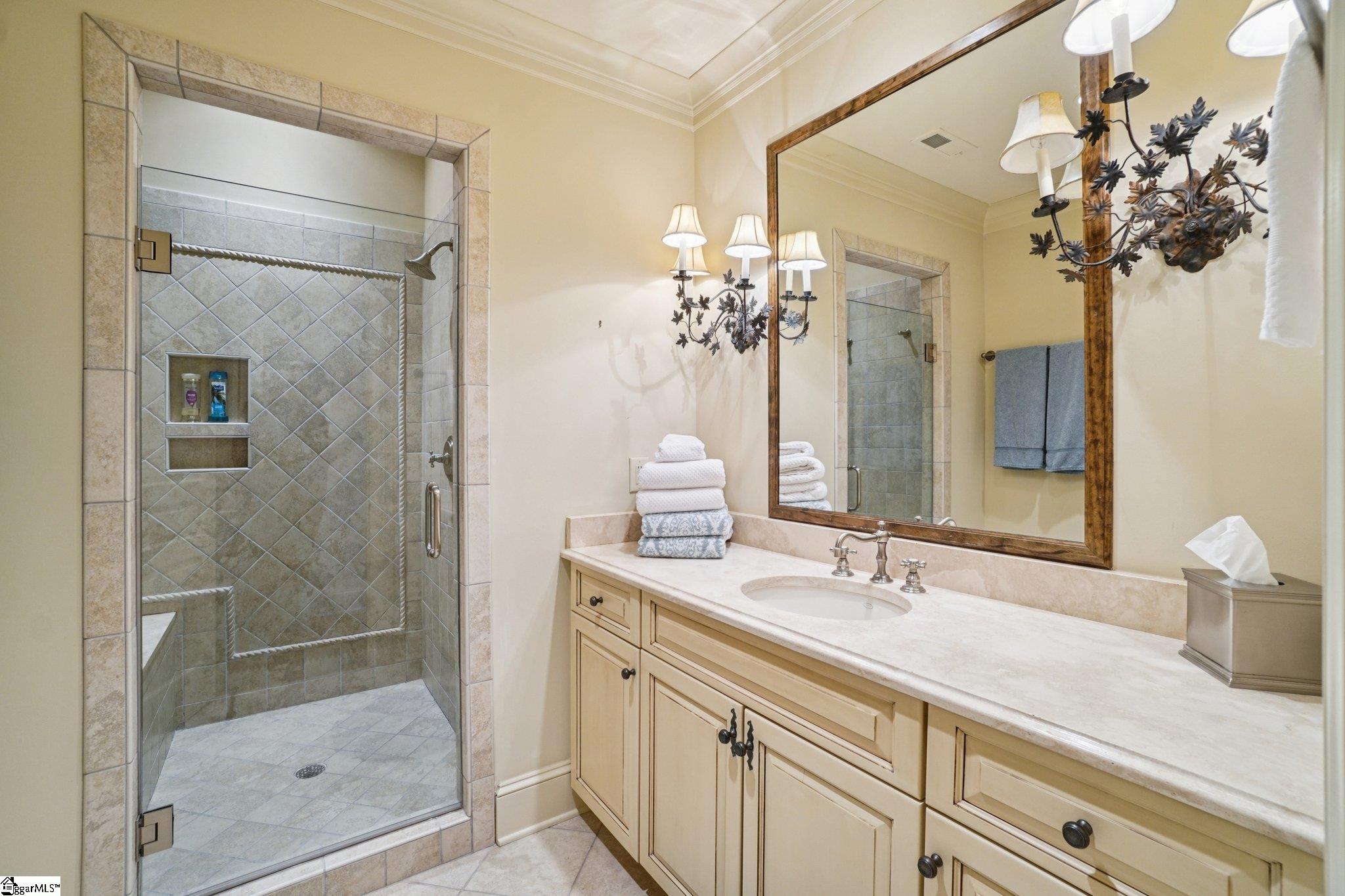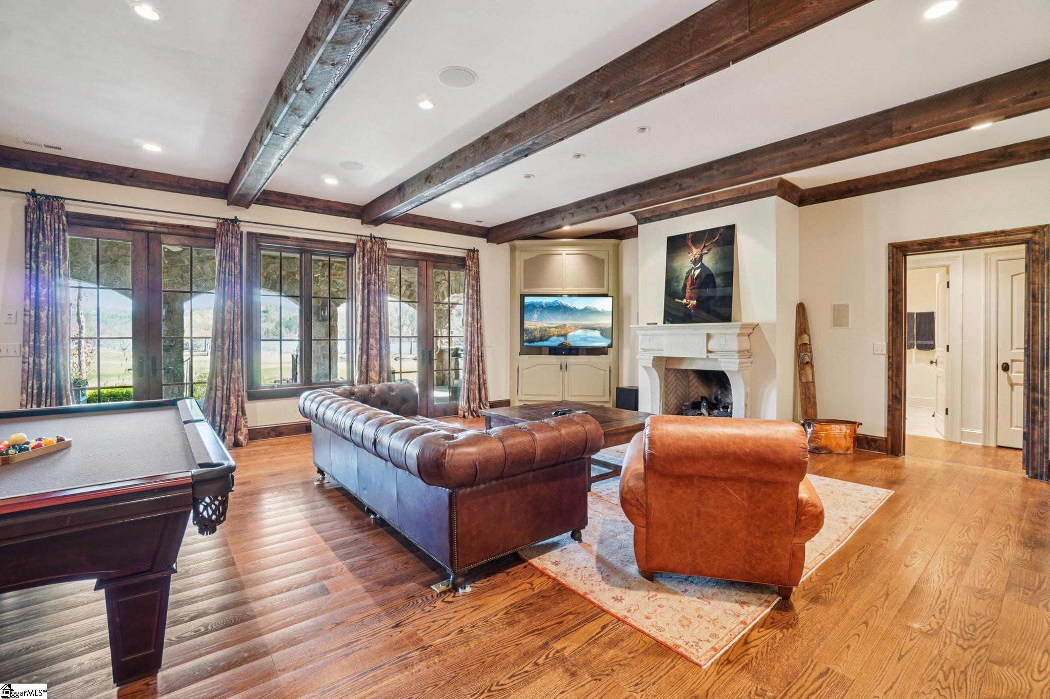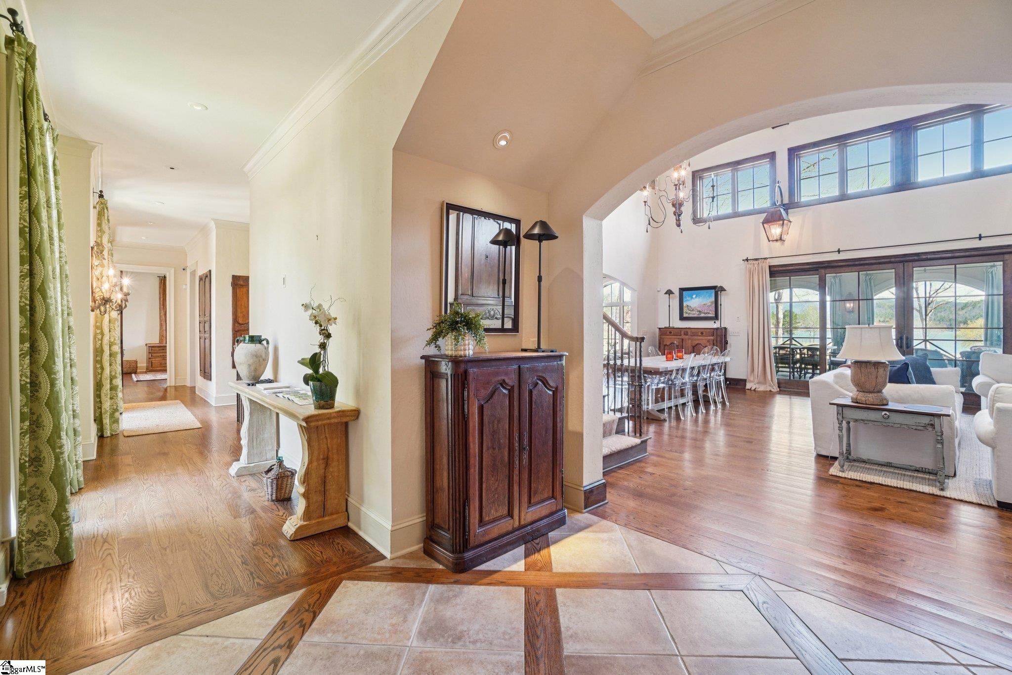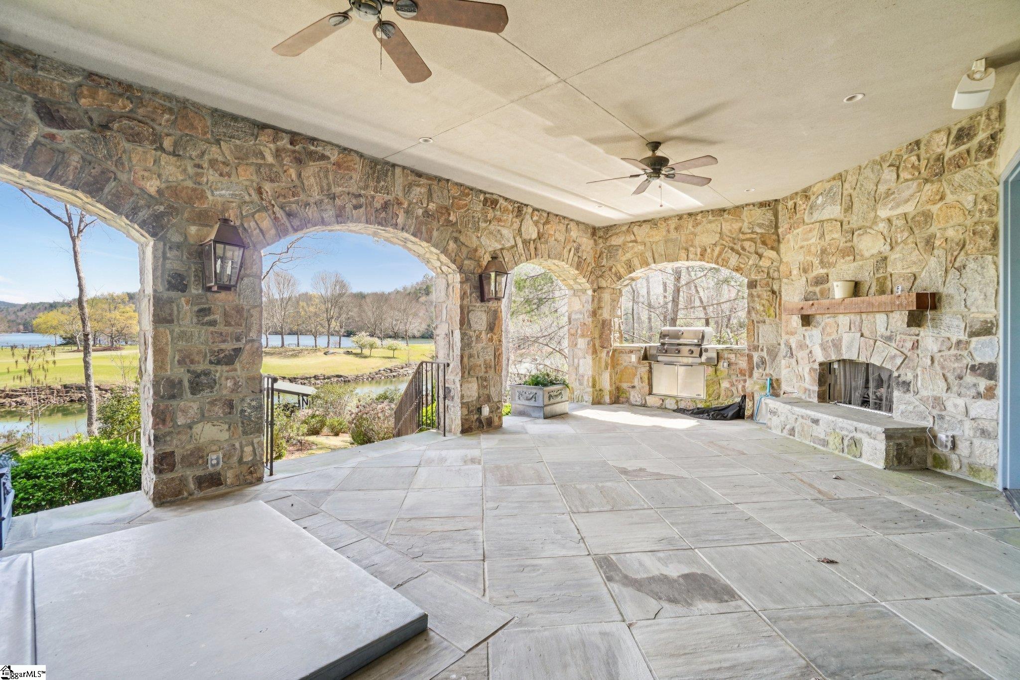 Elegance and exquisite taste are personified in this beautifully proportioned French Country lake home in an exclusive enclave of The Cliffs at keowee vineyards. Gentle topography and a plethora of high-canopied native trees frame the 9 bedroom home, served by 6 full bathrooms and one powder room. Views are multi-dimensional, including mountains, lake cove and channel, pristine state parkland, and the 4th green of the Tom Fazio golf course. The tranquil cove is just off the main channel, protecting boats and swimmers alike, whilst providing privacy. Set into the gracious stone façade, a handsome mahogany door opens into a contiguous living area, with beamed great room lit by Charleston lanterns, dining room, keeping room, and kitchen. Vaulted ceilings, clerestory windows, vast sliding doors to the screened outdoor living area, and a multitude of inner balconies and windows enhance the spacious atmosphere, while numerous European antique architectural elements add an essence of timelessness. The kitchen is flanked by the comfortable keeping room, and outfitted with a Dacor 6-burner gas range, double Dacor wall ovens, two apron farmhouse sinks, a walnut-topped island, and walk-in pantry. The generous screened porch readily accommodates dining and sitting areas on blue crab orchard stone, warmed by a gas-log limestone fireplace. In addition to four principally-sized suites are two darling double bedrooms, a charming bunk room at the lower level, and separate suite above the 3-car garage. The lake level media room opens to a blue flagstone patio delineated by zinc planters, with inset hot tub, grilling kitchen, and second outdoor fireplace. Also at this level are the bunk room, 9th bedroom, two full bathrooms, media room with billiards, a wet bar with ice machine, plenty of storage (including lake toy “garage”), and second laundry room with 3rd fridge and 2nd dishwasher. The home is professionally decorated, with sumptuous window treatments and thoughtful detailing throughout. Numerous impressive features include custom lighting fixtures (many of which are either antique or artisan-crafted from antiques), a home office with lake views, custom hand-wrought iron balusters, Grade 1 white oak flooring (a recent addition to the lower level), a two-slip boathouse, exterior gas lanterns, solid stone exterior, some 7,000 square feet of custom designed and engineered living space, and superlative artistic sensitivity, in both plan and execution. This beautifully designed and masterfully constructed home is a Cliffs at keowee vineyards icon with recent that bely the home’s early 2000’s construction.