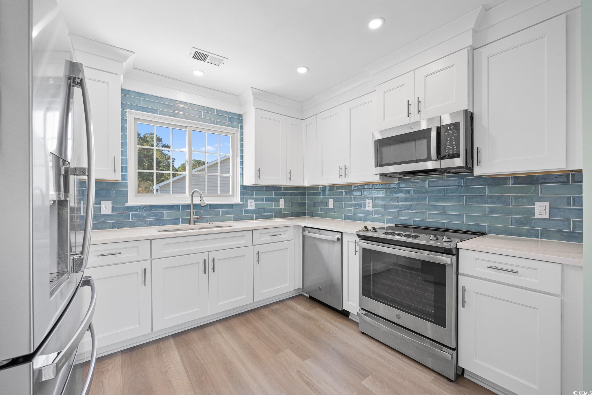 Pride of Ownership shows with this 3 bedroom, 2.5 bath remodeled and updated home in the Highly desirable community of Arrowhead in the Carolina Forest area. This home is on a very quiet and private cul-de-sac and will be your forever home. Updates include, Garage door opener, keyless entry, paint, 42" WHITE soft close kitchen cabinets and drawers with plenty of storage for all your cooking needs, crown molding, Backsplash, Beautiful Quartzite countertops, Stainless steel appliances, all electrical and plumbing fixtures, Luxury vinyl flooring, carpet in the bedrooms, Anderson windows and screens, sliding doors, window treatments, toilets and vanities. This home will not disappoint you and is well maintained. This open floor plan is what you're looking for. The living room has a cathedral ceiling and a large window that allows tons of natural light, Primary bedroom with 2 closets and bathroom on the first floor. Plenty of storage above the garage. The best part is outside with a large concrete patio that will have plenty of space for you to entertain, BBQ's, Holiday parties or just sit out back with a sneak peek of the number 5 hole of Arrowhead Country club. Patio furniture and BBQ grill, Wallart, large wall mounted TV and primary bedroom furniture, dryer and new washer will convey. Make sure your agent takes you to see the pool, pickleball and Tennis courts. Minutes to Hwy 501, Hwy 31. Arrowhead is centrally located to Hospitals, Pharmacy, Myrtle Beach airport 7 min away, Broadway at the beach, food markets, Fine dining, shopping, Tanger Outlet, Championship golf, Beautiful beaches of Myrtle beach 3.5 miles away and everything the Grand Strand Has to offer. Don't miss your forever home and make your appointment today.