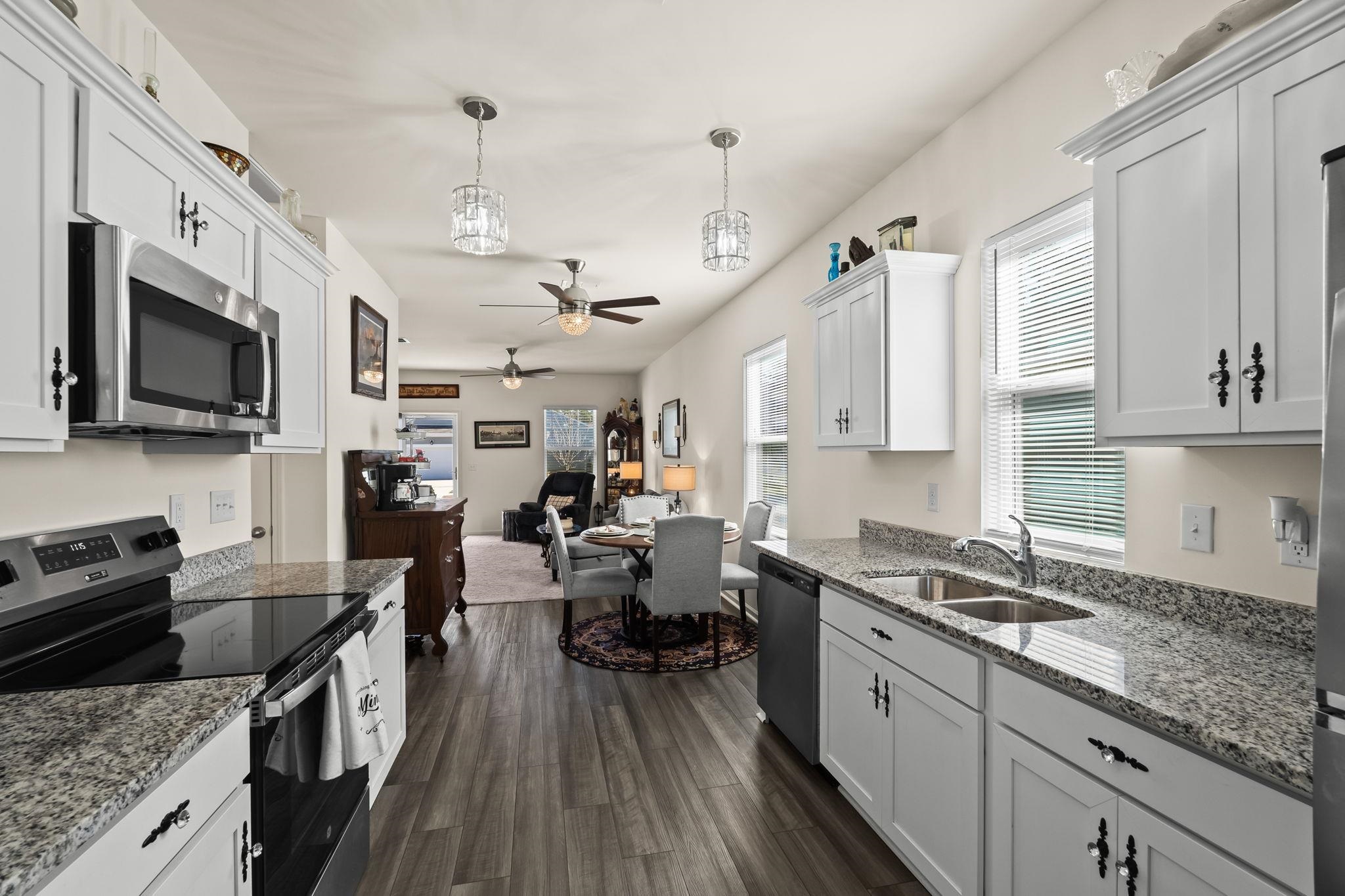 Affordable, move-in ready, and low maintenance—this home checks all the boxes. Built less than two years ago, this one-story 3-bedroom, 2-bath ranch offers the perfect blend of modern finishes and everyday convenience without the hefty price tag. The open-concept floor plan is ideal for easy living and entertaining, featuring a stylish kitchen with stainless steel GE appliances, granite countertops, upgraded white cabinetry, and seamless flow to a private covered patio. Thoughtful upgrades like enhanced hardware, lighting, and ceiling fans are found throughout, while both bathrooms shine with elegant quartz countertops. A full-size washer and dryer convey, making this home truly move-in ready. Conveniently located just minutes from downtown Conway with quick access to the entire Grand Strand via Routes 701 and 22—this is smart, affordable living at its best.