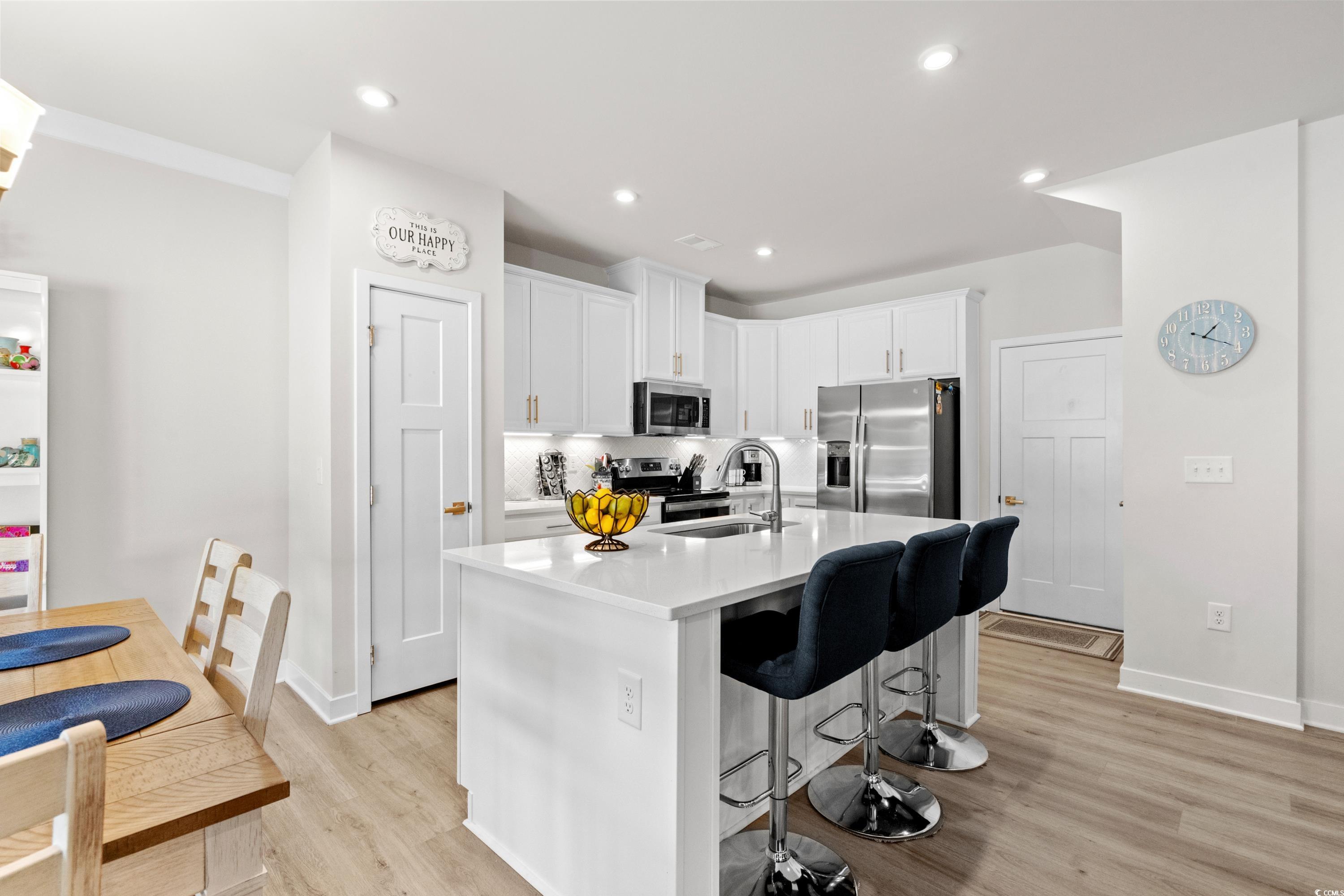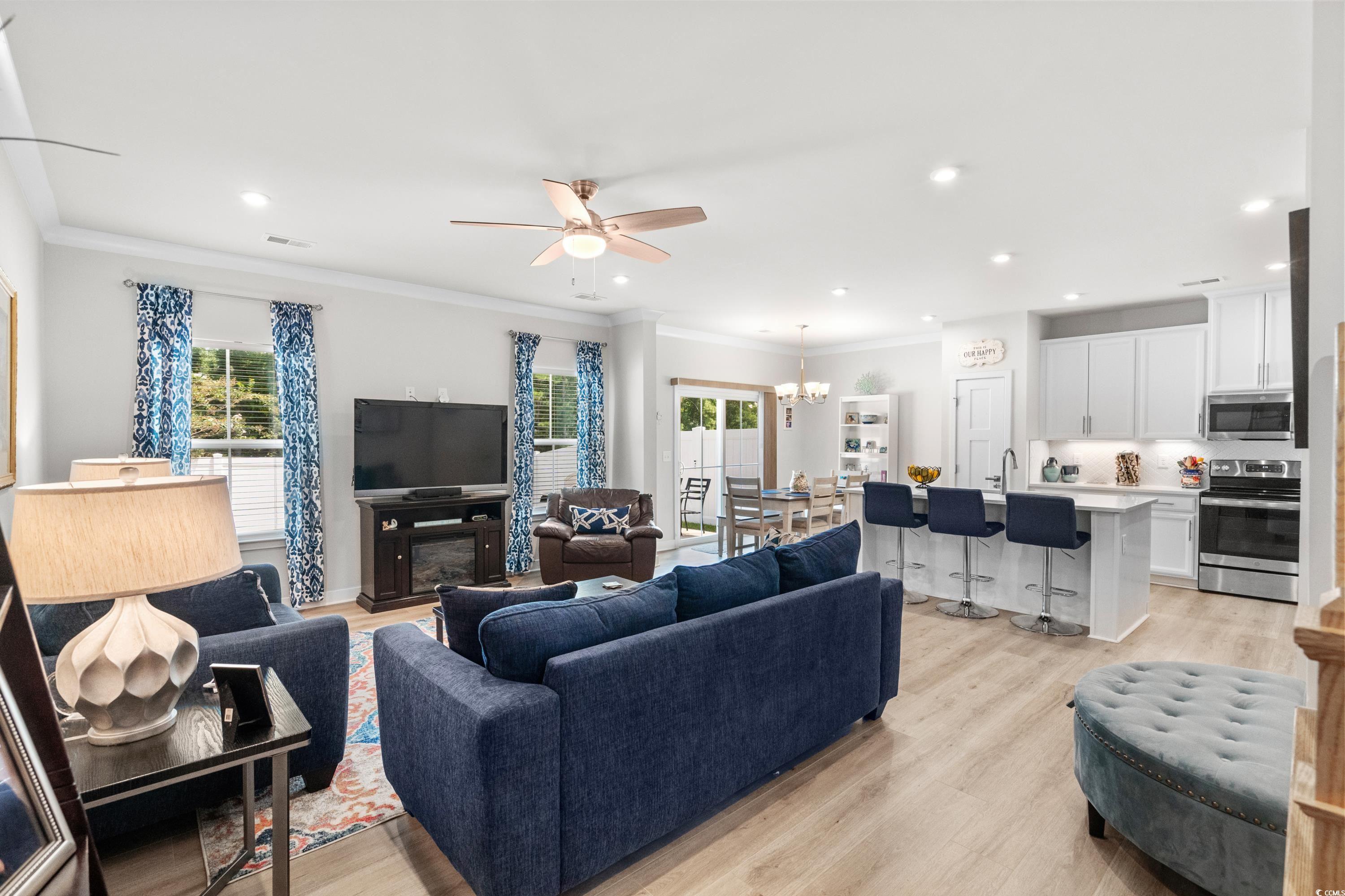Your "like new" Townhome with a 2-car garage and fully fenced yard is low on maintenance and high on style. This end unit is one of the few, highly sought after 2-story Rosecliff plans featuring an open floorplan, 3 bedrooms, 2.5 bathrooms, a two-car garage and a fully fenced private back yard. The Coastal Cottage interior finishes include easy care luxury vinyl plank flooring on the first floor, crown moldings, and craftsman style doors. The kitchen has upgraded cabinets, stainless steel appliances, tile back splash and quartz countertops. The large island is an ideal breakfast bar or gathering area. The laundry room is conveniently located on the second floor with the bedrooms and two full bathrooms. You'll appreciate that the primary bedroom has two large walk in closets and an ensuite bathroom. Near the neighborhood pool. The neighborhood is centrally located near Arrowhead Golf Course, Tanger Outlets, Coastal Grand Mall, and all the fun, food, recreation and entertainment of the Grand Strand.