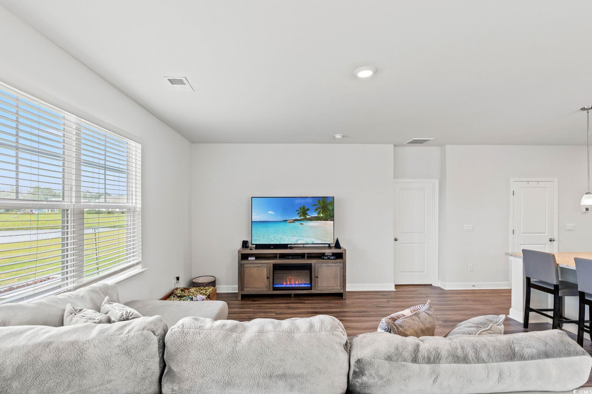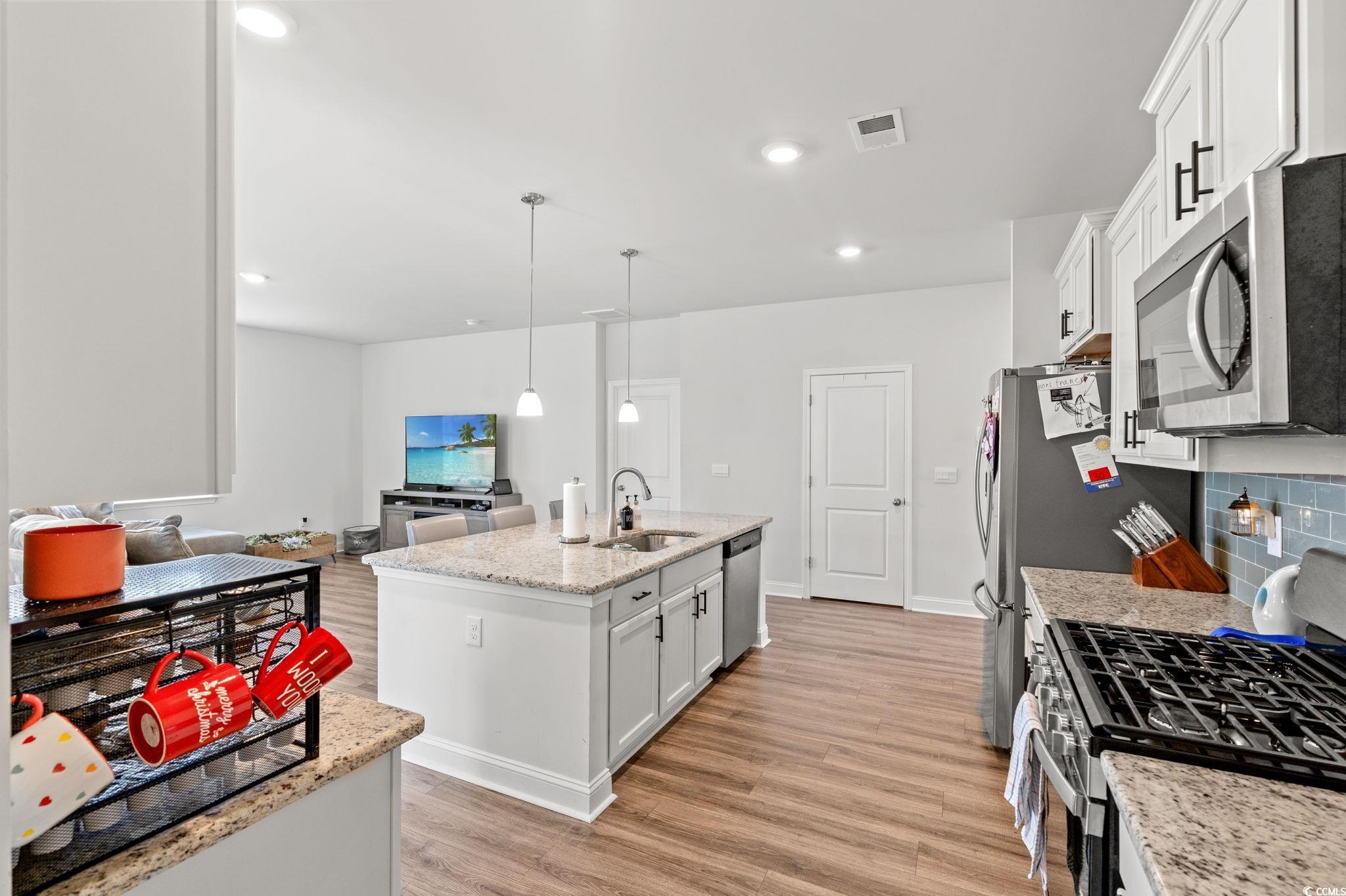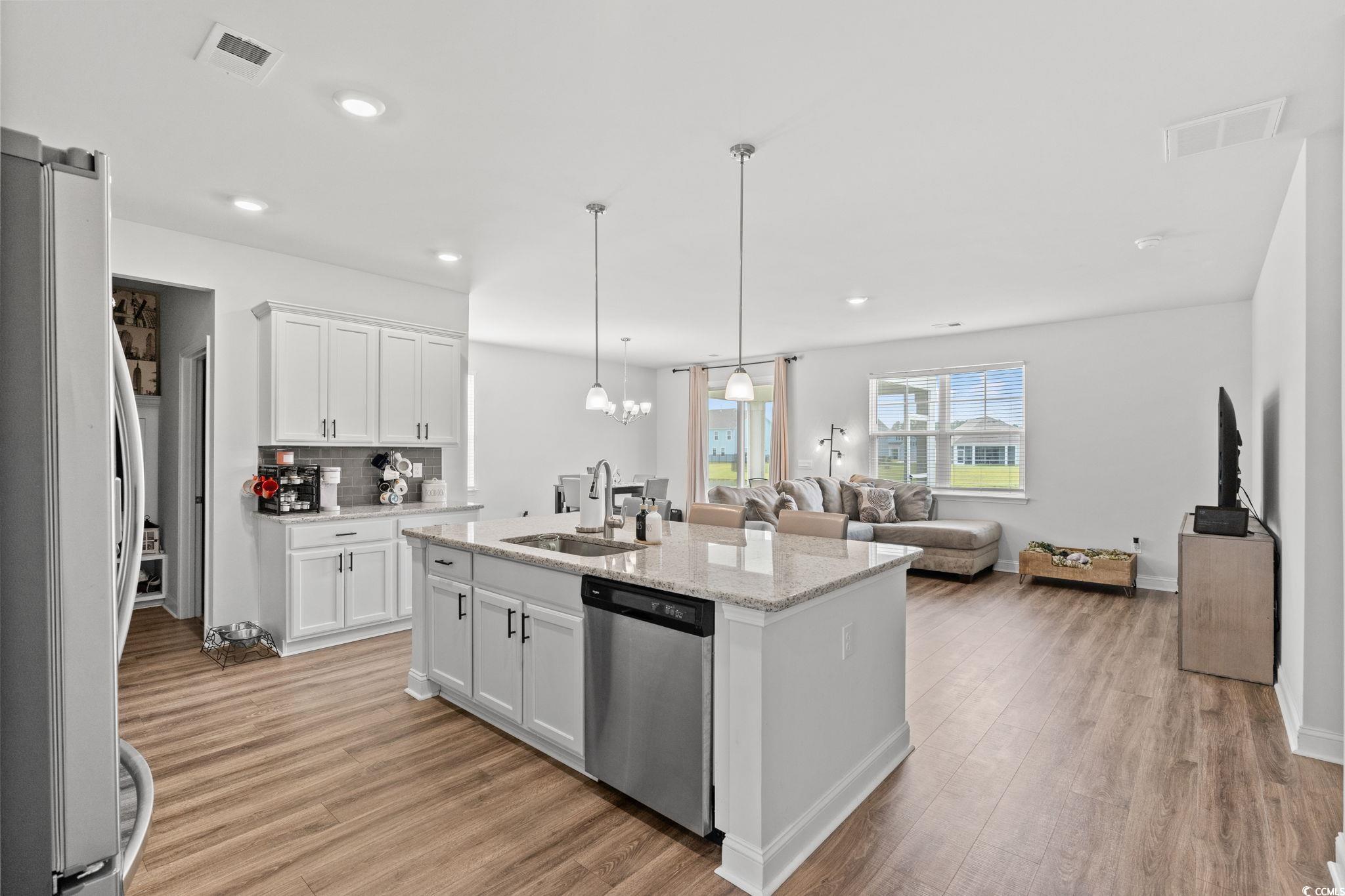 Welcome home to this beautiful open 4 bedroom, 2 1/2 bath home which is located in the very popular Lakes community in Myrtle Beach, South Carolina. Stacked stone elevation, inviting front porch, and 8 ft. entry door with glass. Beautiful wide plank laminate flooring flows through the foyer, kitchen, living room, and dining room with tile in the bathrooms and laundry room. The kitchen has granite countertops, tile backsplash, stainless Whirlpool appliance, walk-in pantry including a gas range with a large breakfast bar and dining nook. The oversized owners' suite is on the first floor with a walk in closet. The ensuite has double sinks and a walk-in tile shower. The other 3 nice size bedrooms and loft are on the second floor and share a full bathroom that has a tub/shower combo. The loft is perfect for another living area or office. Just minutes from the beach, golf courses, the Myrtle Beach Boardwalk, Sky Wheel, dining, entertaining, hospitals, shopping and the Myrtle Beach International Airport. The Lakes is a community that allows you to golf cart to the beach if you wish. Sliding glass doors off the dining area lead to the rear screen porch that overlooks the pond creating a seamless transition from indoor to outdoor living. Schedule your showing today! Square footages are approximate.