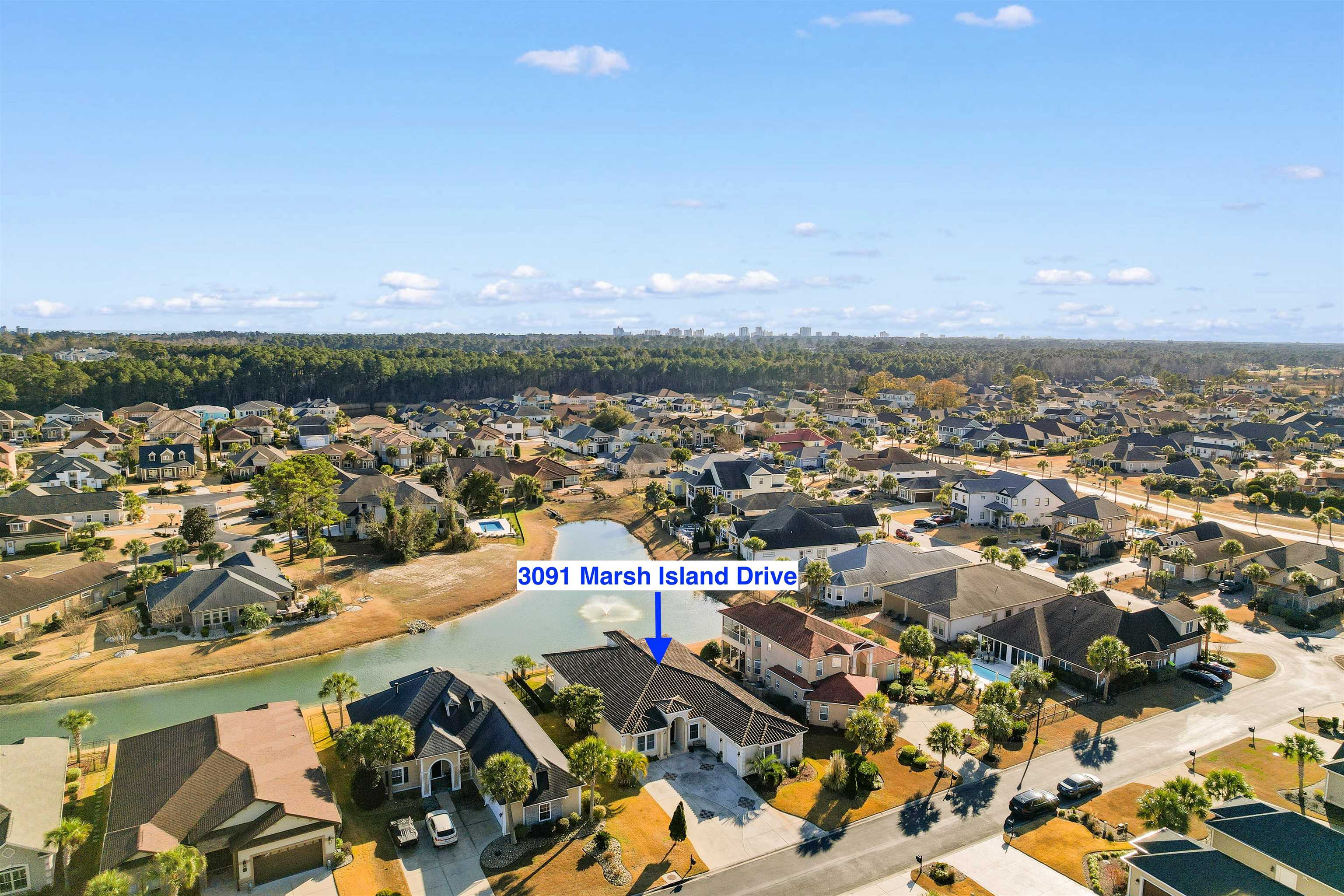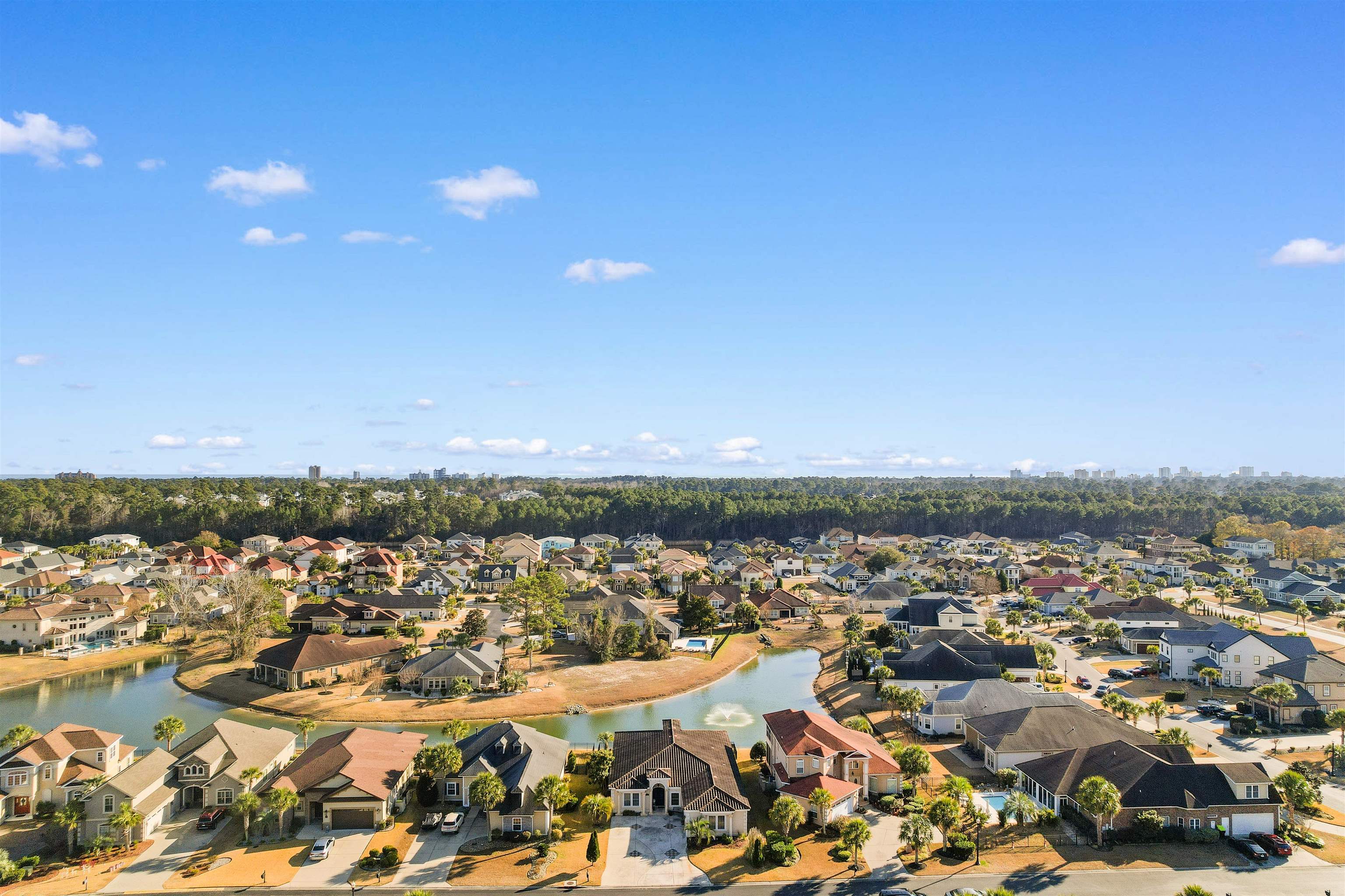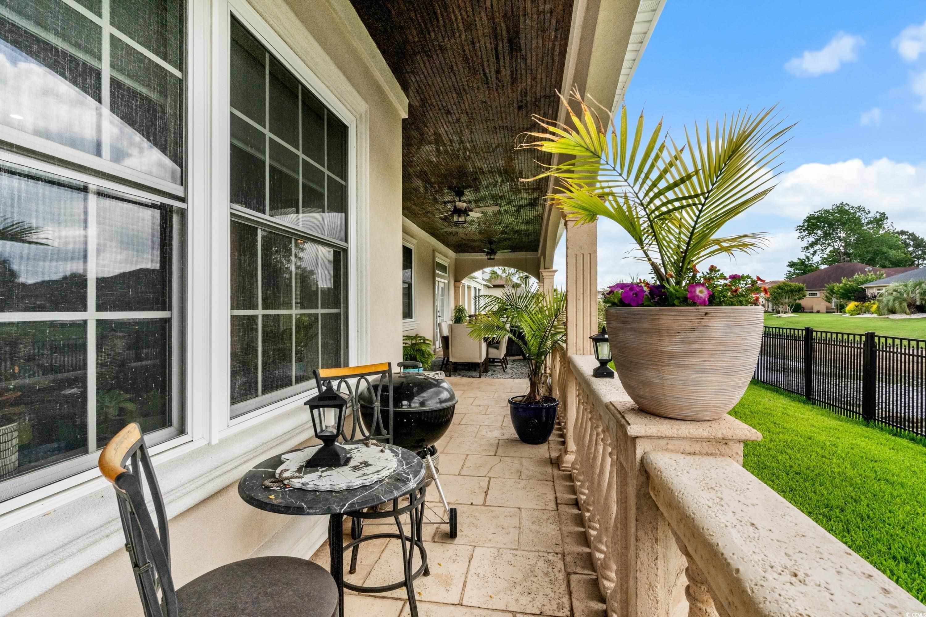 Located within the gated Intracoastal Waterway community of The Bluffs on the Waterway, this thoughtfully designed Mediterranean-style home sits on a scenic lakefront lot with tranquil fountain views. Custom built with ICF (Insulated Concrete Form) construction, a stucco exterior, and a Spanish tile roof, the home offers lasting quality, energy efficiency, and solid craftsmanship. Inside, the home features 4 bedrooms and 3 bathrooms with an open floor plan that feels both spacious and comfortable. Italian porcelain tile flows throughout the main living areas, while Brazilian Cherry hardwood floors add warmth to each bedroom. Two well-appointed primary suites are located on one side of the home, each offering generous closet space and private bathrooms with jetted tubs, custom tile showers, and double vanities. One of the suites opens directly to the covered patio, creating a seamless connection to the outdoors. The remaining two bedrooms are positioned on the opposite side of the home, providing flexibility for guests, family, or work-from-home needs. The kitchen is designed for both everyday living and entertaining, featuring custom cabinetry, granite countertops, a walk-in pantry, breakfast nook, and separate full-size refrigerator and freezer. Additional highlights include a private study, updated modern lighting throughout, an oversized living room with a custom fireplace and mantel, and a formal dining room conveniently located just off the main living area. French doors lead to a covered patio overlooking the lake and fountain—an ideal space for relaxing or entertaining. Outdoors, the fully fenced yard provides privacy and peace of mind and is beautifully landscaped with custom landscape lighting, enhancing the home’s curb appeal and creating a stunning evening ambiance—perfect for enjoying the serene lakefront setting day or night.The Bluffs on the Waterway is one of Myrtle Beach’s most sought-after communities, known for its privacy, natural beauty, and exceptional amenities. Residents enjoy gated security, a resort-style community pool, clubhouse, private boat storage, day docks with Intracoastal access, walking trails, and beautifully maintained common areas. Tucked away along the water yet centrally located, the neighborhood offers a rare balance of peaceful living and everyday convenience. Ideally situated in the Carolina Forest area, this home offers convenient access to top-rated schools, shopping, dining, grocery stores, medical facilities, and championship golf courses, all just minutes away. Despite its central location, the community maintains a quiet, private atmosphere. With easy access to major roadways, Myrtle Beach’s beaches, airport, and popular attractions are close at hand.