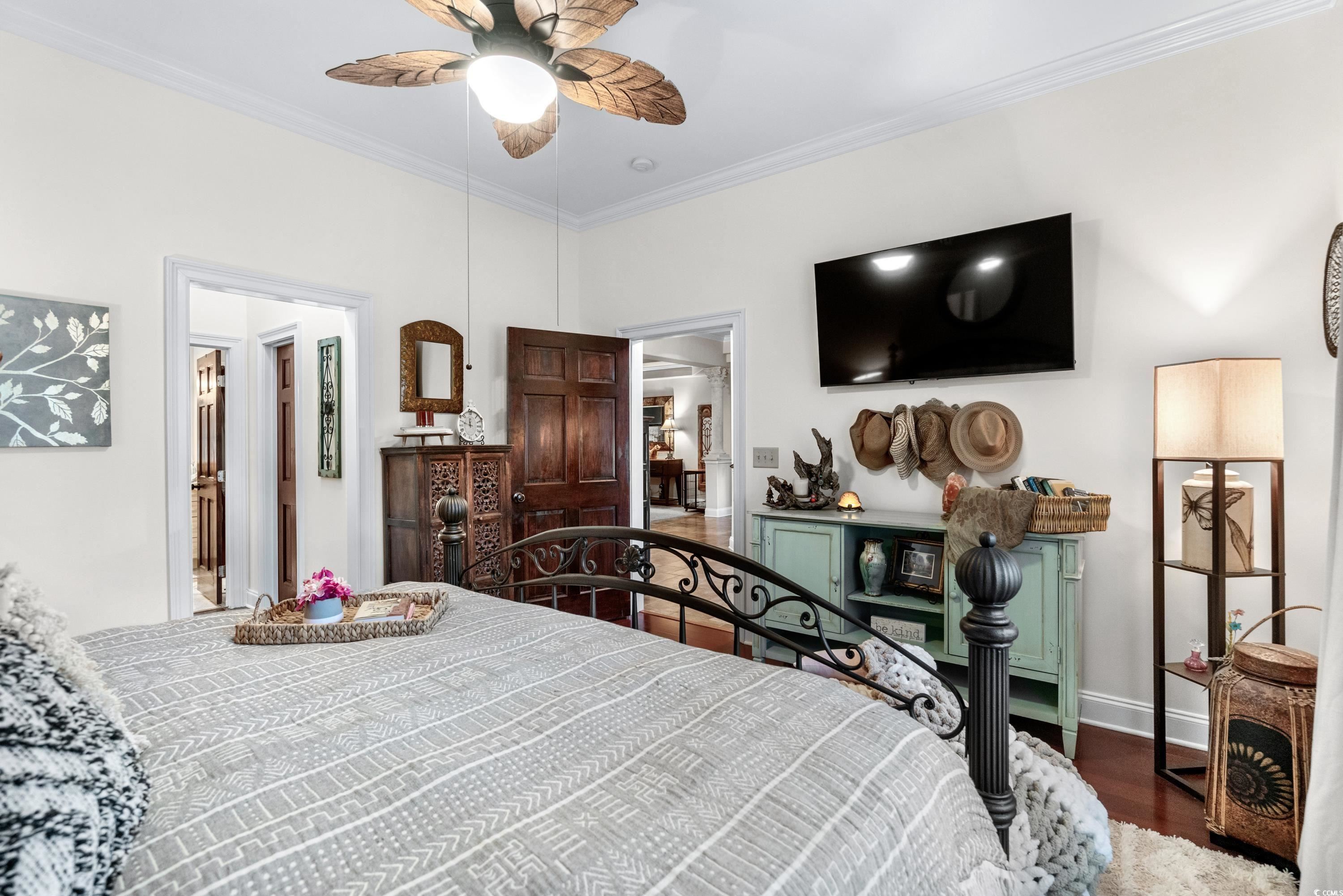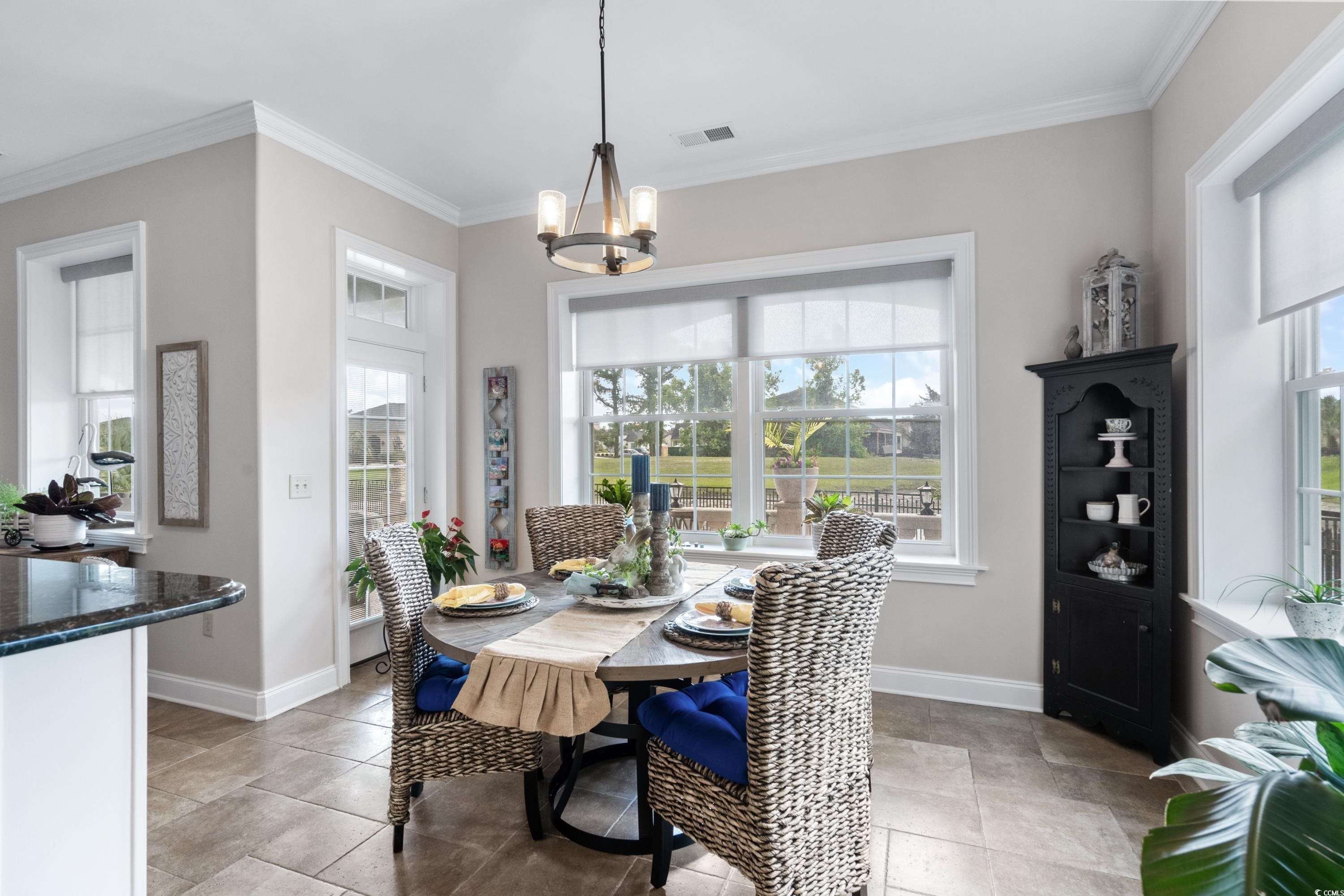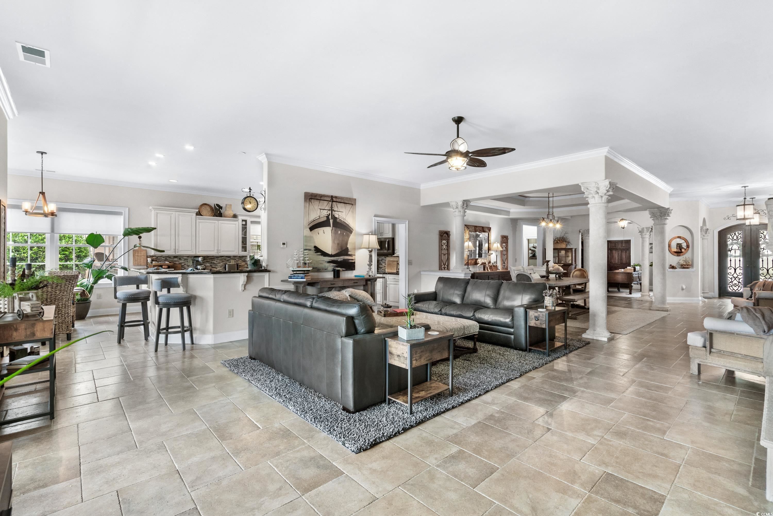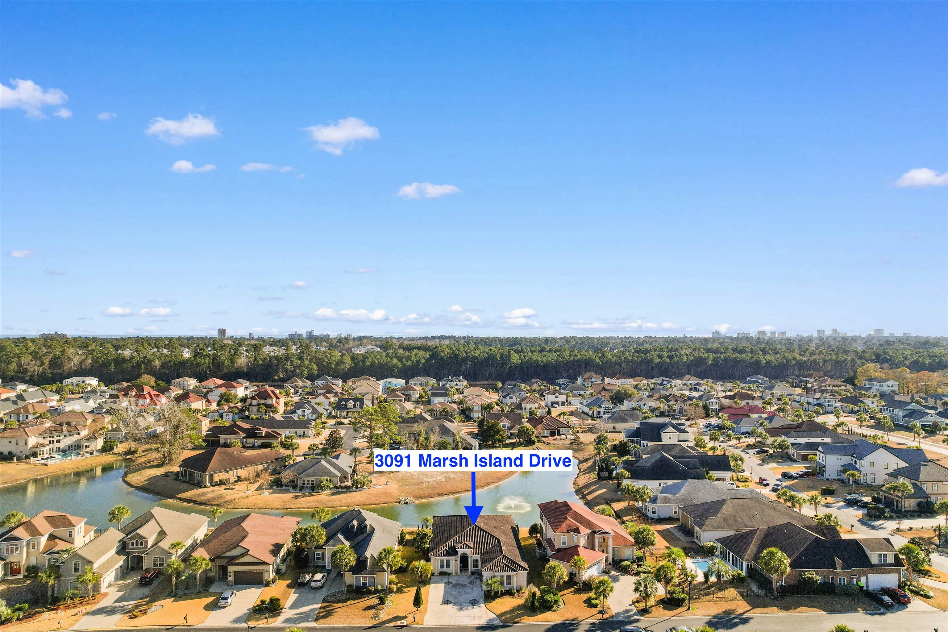 Located within the gated Intracoastal Waterway community of The Bluffs on the Waterway, this thoughtfully designed Mediterranean-style home sits on a scenic lakefront lot with tranquil fountain views. Custom built with ICF (Insulated Concrete Form) construction, a stucco exterior, and a Spanish tile roof, the home offers lasting quality, energy efficiency, and solid craftsmanship. Inside, the home features 4 bedrooms and 3 bathrooms with an open floor plan that feels both spacious and comfortable. Italian porcelain tile flows throughout the main living areas, while Brazilian Cherry hardwood floors add warmth to each bedroom. Two well-appointed primary suites are located on one side of the home, each offering generous closet space and private bathrooms with jetted tubs, custom tile showers, and double vanities. One of the suites opens directly to the covered patio, creating a seamless connection to the outdoors. The remaining two bedrooms are positioned on the opposite side of the home, providing flexibility for guests, family, or work-from-home needs. The kitchen is designed for both everyday living and entertaining, featuring custom cabinetry, granite countertops, a walk-in pantry, breakfast nook, and separate full-size refrigerator and freezer. Additional highlights include a private study, updated modern lighting throughout, an oversized living room with a custom fireplace and mantel, and a formal dining room conveniently located just off the main living area. French doors lead to a covered patio overlooking the lake and fountain—an ideal space for relaxing or entertaining. Outdoors, the fully fenced yard provides privacy and peace of mind and is beautifully landscaped with custom landscape lighting, enhancing the home’s curb appeal and creating a stunning evening ambiance—perfect for enjoying the serene lakefront setting day or night.The Bluffs on the Waterway is one of Myrtle Beach’s most sought-after communities, known for its privacy, natural beauty, and exceptional amenities. Residents enjoy gated security, a resort-style community pool, clubhouse, private boat storage, day docks with Intracoastal access, walking trails, and beautifully maintained common areas. Tucked away along the water yet centrally located, the neighborhood offers a rare balance of peaceful living and everyday convenience. Ideally situated in the Carolina Forest area, this home offers convenient access to top-rated schools, shopping, dining, grocery stores, medical facilities, and championship golf courses, all just minutes away. Despite its central location, the community maintains a quiet, private atmosphere. With easy access to major roadways, Myrtle Beach’s beaches, airport, and popular attractions are close at hand.
