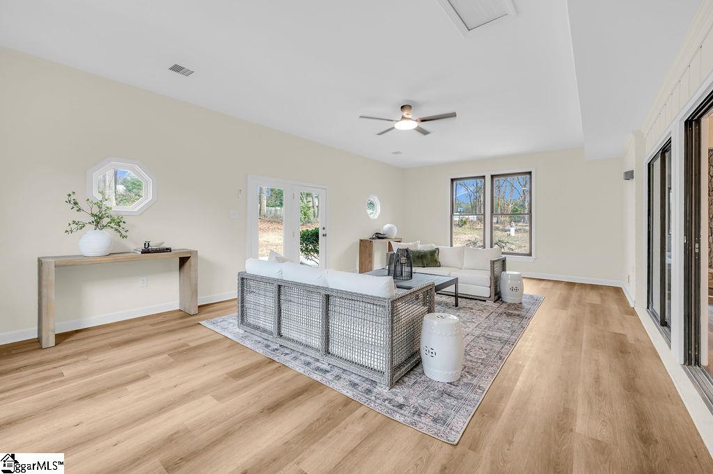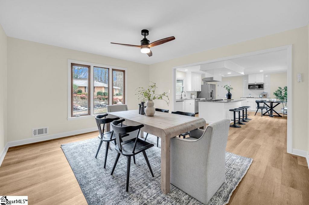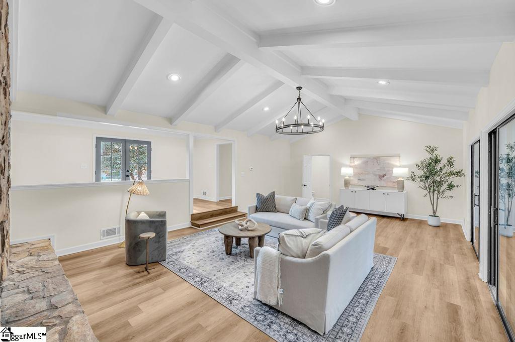 This Calhoun Lakes ranch home blends modern updates with inviting warmth and character. Sitting on a 0.68-acre fenced lot, just minutes from downtown Spartanburg, this home delivers comfort, style, and everyday livability. From the moment you arrive, the home’s curb appeal stands out with a beautiful front porch, landscaped steps, and a striking stone-accented entry that sets the tone for what’s inside. The great room welcomes you with a vaulted ceiling, exposed beams, a stunning wood-burning fireplace, and a warm stone feature wall that continues into the foyer, creating an immediate sense of character and cohesion. Light fills the living spaces through numerous windows, enhancing the open, airy feel. The great room flows naturally into the family room through wide sliding glass doors, creating a connected layout while still allowing each space to serve its own purpose. The family room opens directly to the patio, extending the living area outdoors. The kitchen is both bright and functional with white cabinetry, warm-toned LVP flooring, granite countertops, and a central island with seating. A spacious breakfast area includes a built-in microwave with counter cabinetry, while the dining room offers generous space and abundant natural light. The home features four bedrooms and two and a half bathrooms, thoughtfully arranged for comfort and flexibility. The primary suite includes two walk-in closets, double vanities, and a beautifully finished shower. All bedrooms feature large windows, and the fourth bedroom could easily serve as a home office. A large laundry room with cabinetry and counter space, along with a sizable hallway linen closet, adds to the home’s practical design. A two-car attached garage features a polystyrene-injected door designed to improve insulation and overall comfort. The expansive, fenced backyard offers room to relax, play, or accommodate pets. Recent improvements include a serviced and tuned HVAC system, along with a newly sealed crawl space and a new dehumidifier, adding to the home’s comfort and efficiency. With no HOA and a location just 12 minutes from downtown Spartanburg, this home offers a truly move-in-ready feel in the established Calhoun Lakes community.