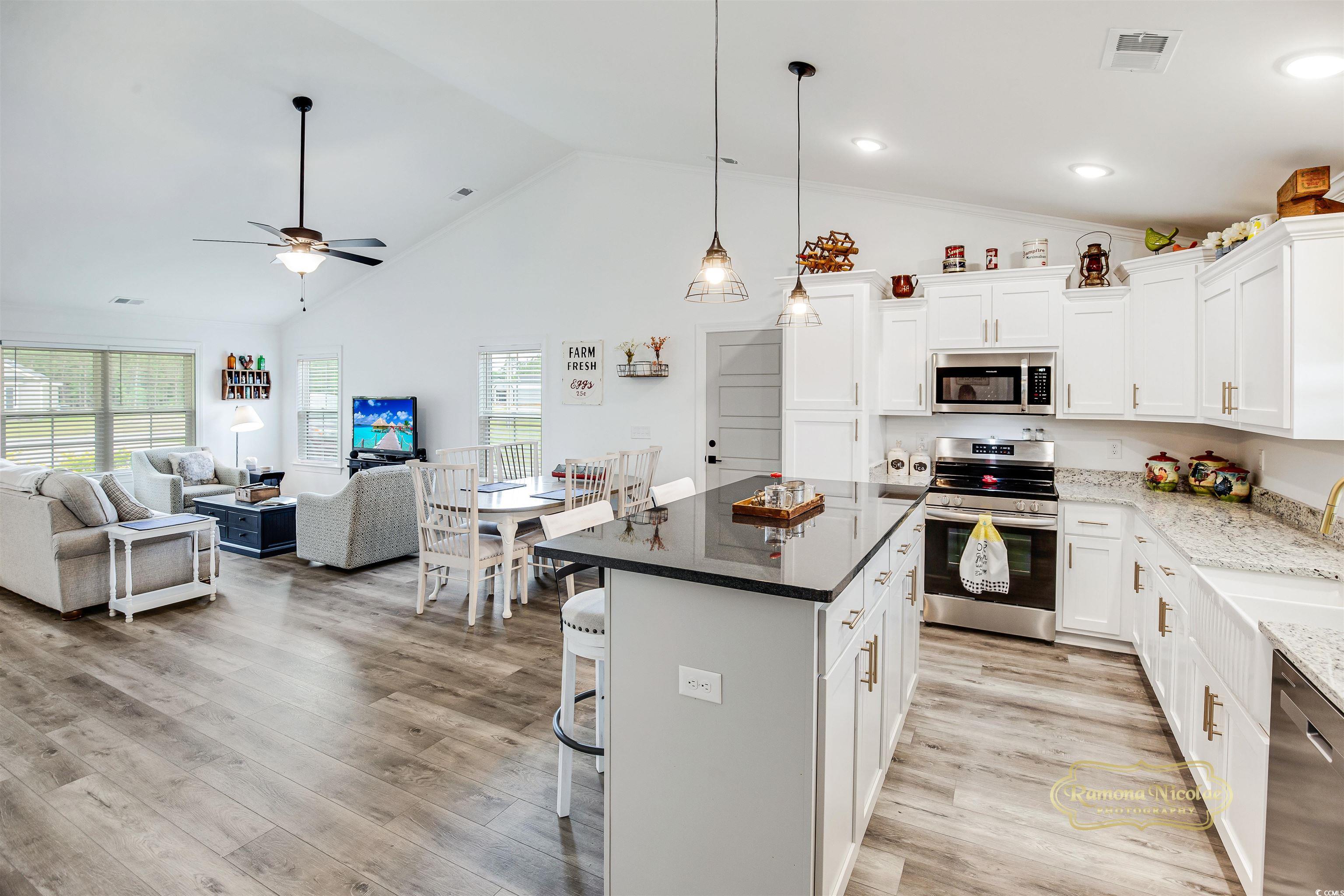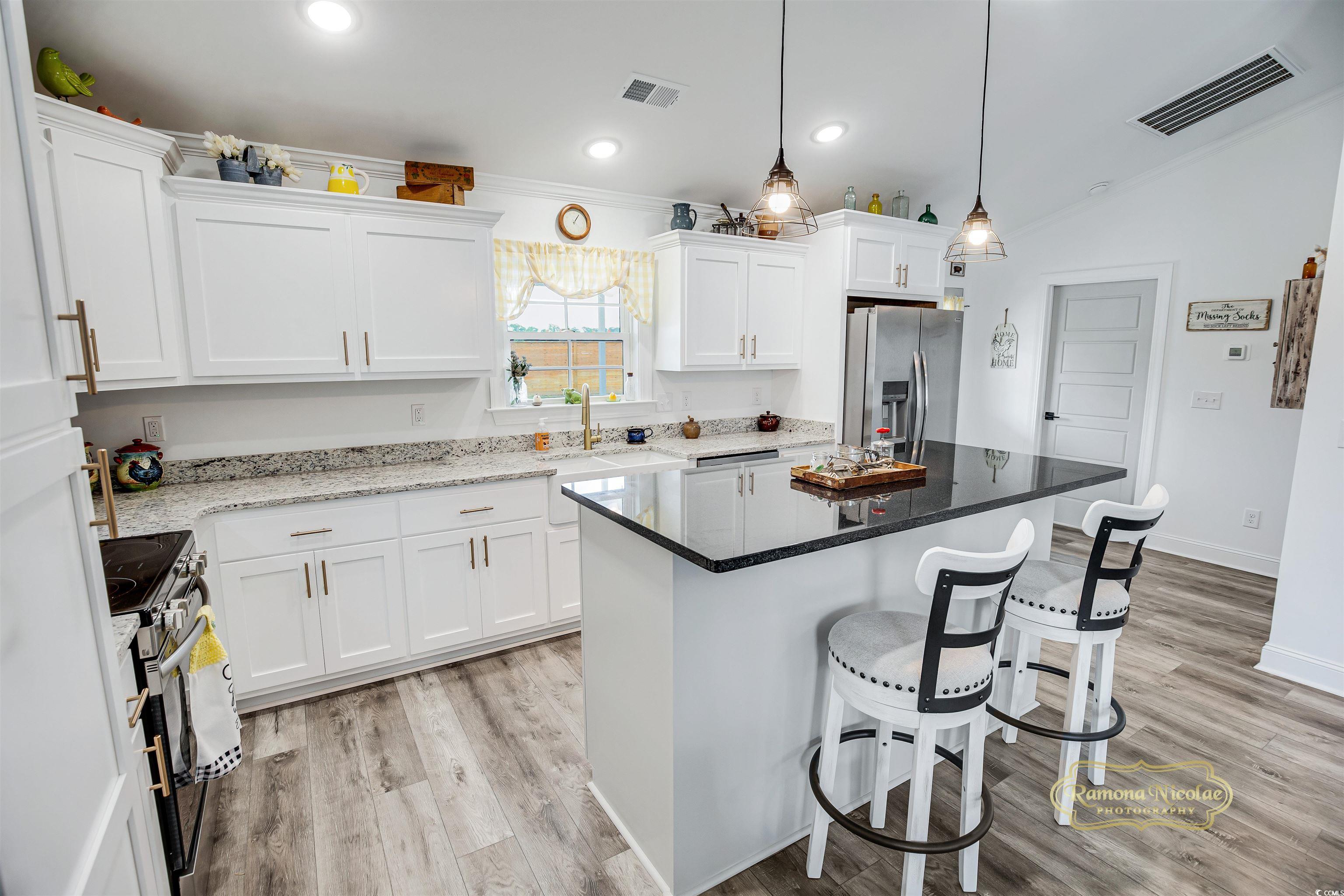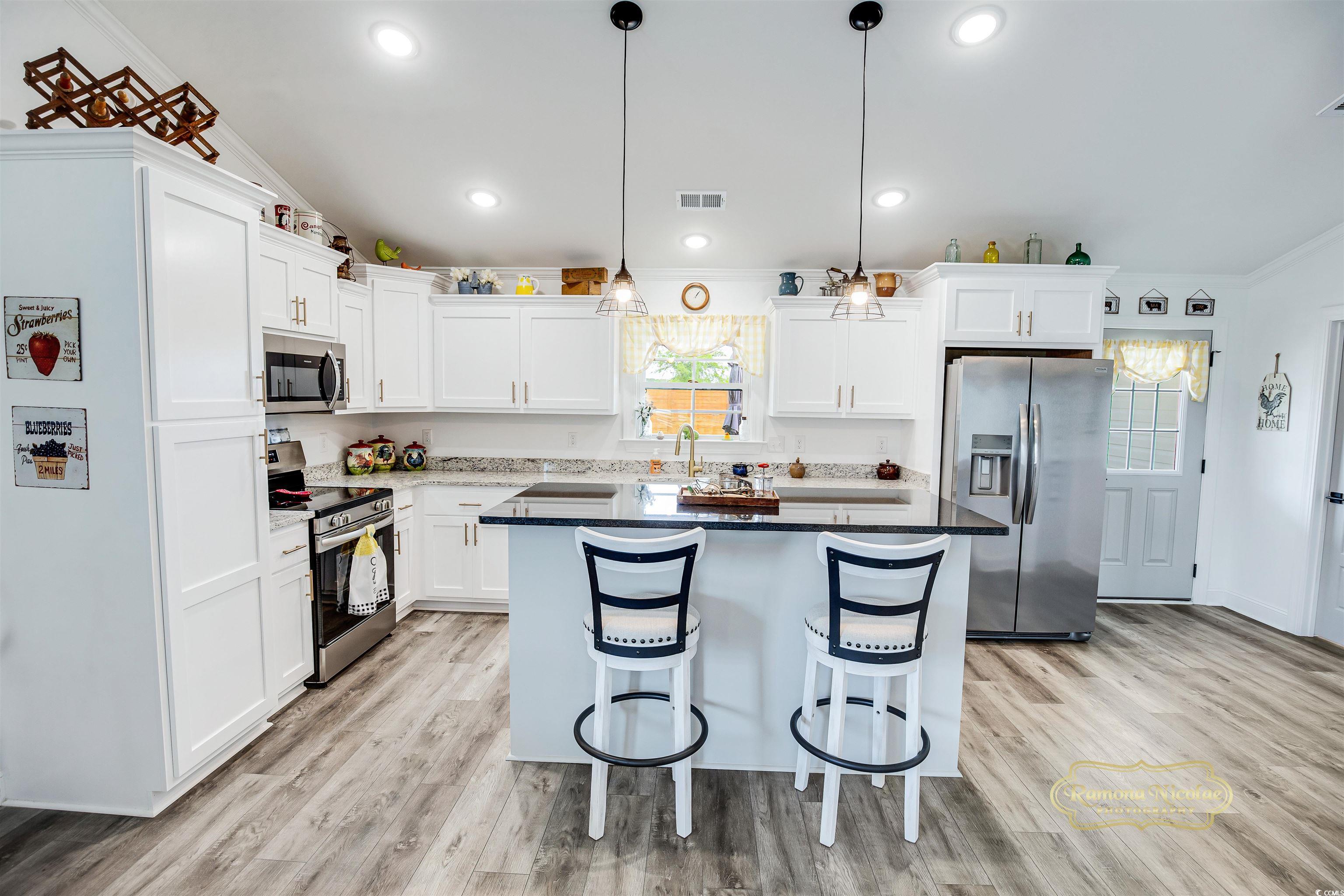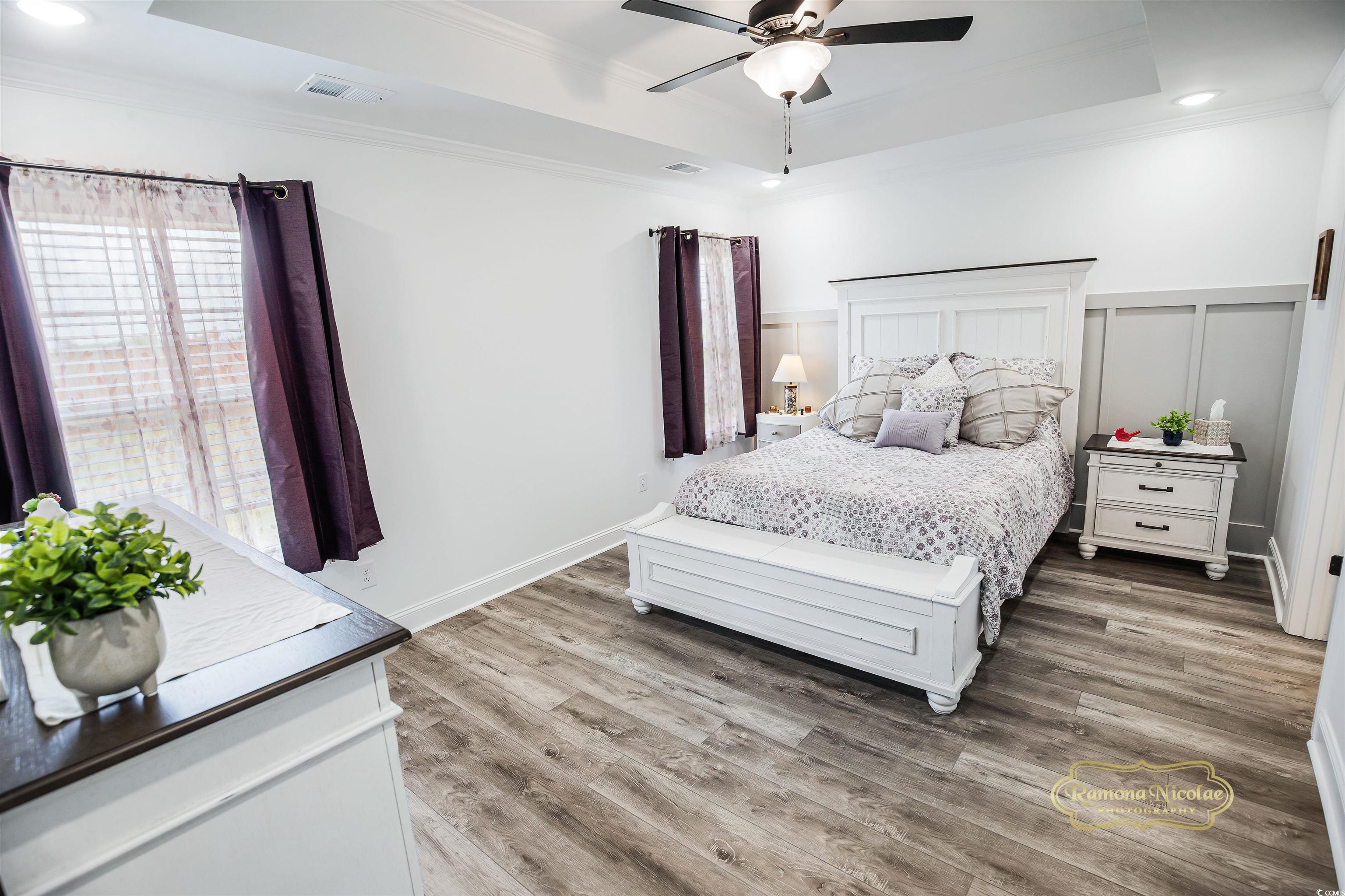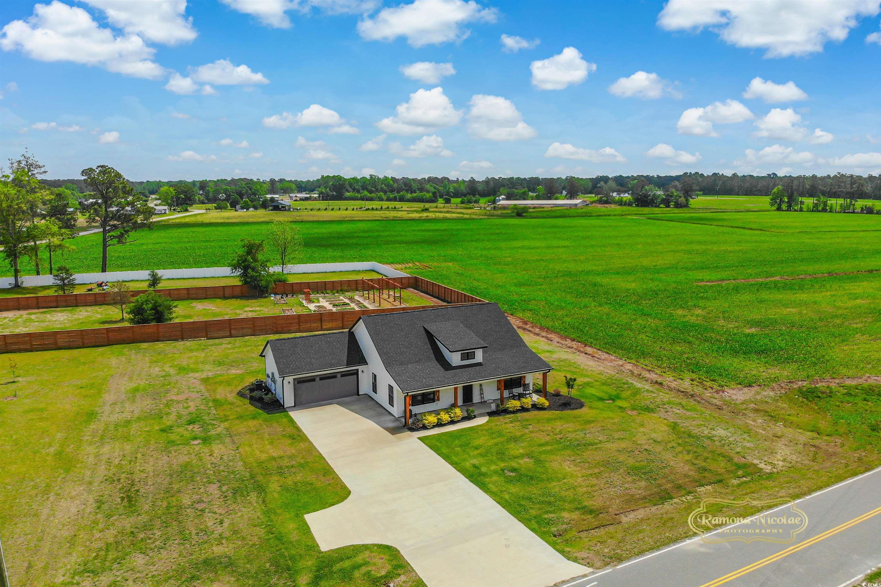 This lovely new farmhouse style offers a 2-car attached garage, 3-bedrooms and 2 baths and is GORGEOUS! Everything is new! As you drive up, the area is picturesque. This half acre lot sits next to a beautiful field. You can melt your cares away with this little slice of heaven! Enter the front porch great for the rockers and lemonade. This isn't your ordinary build, the style was very thoughtful with high ceilings in the foyer. Crown molding adorns the home, and luxury vinyl flooring throughout, 5 panel doors, granite countertops in the kitchen and bathrooms are only some of the details. Attention chef: enjoy your counterspace, farm sink and plenty of cabinets. The primary bedroom has an accent wall with wainscoting, tray ceiling with recessed lighting, and a large walk-in closet. The primary suite also offers a tile walk in shower with insets. Outside upgrades include lawn sprinkler system and gutters/downspouts. The back screened in porch is wonderful to enjoy the cool evenings and maybe dinner and a sunset. In addition to its beauty and no HOA and not in a flood zone, makes this a "10"! Seller is motivated. **24 min to Riverwalk, 40 min to beach, 18 min to Hwy 22, 10 min to Hwy 9, 25 min to Walmart.