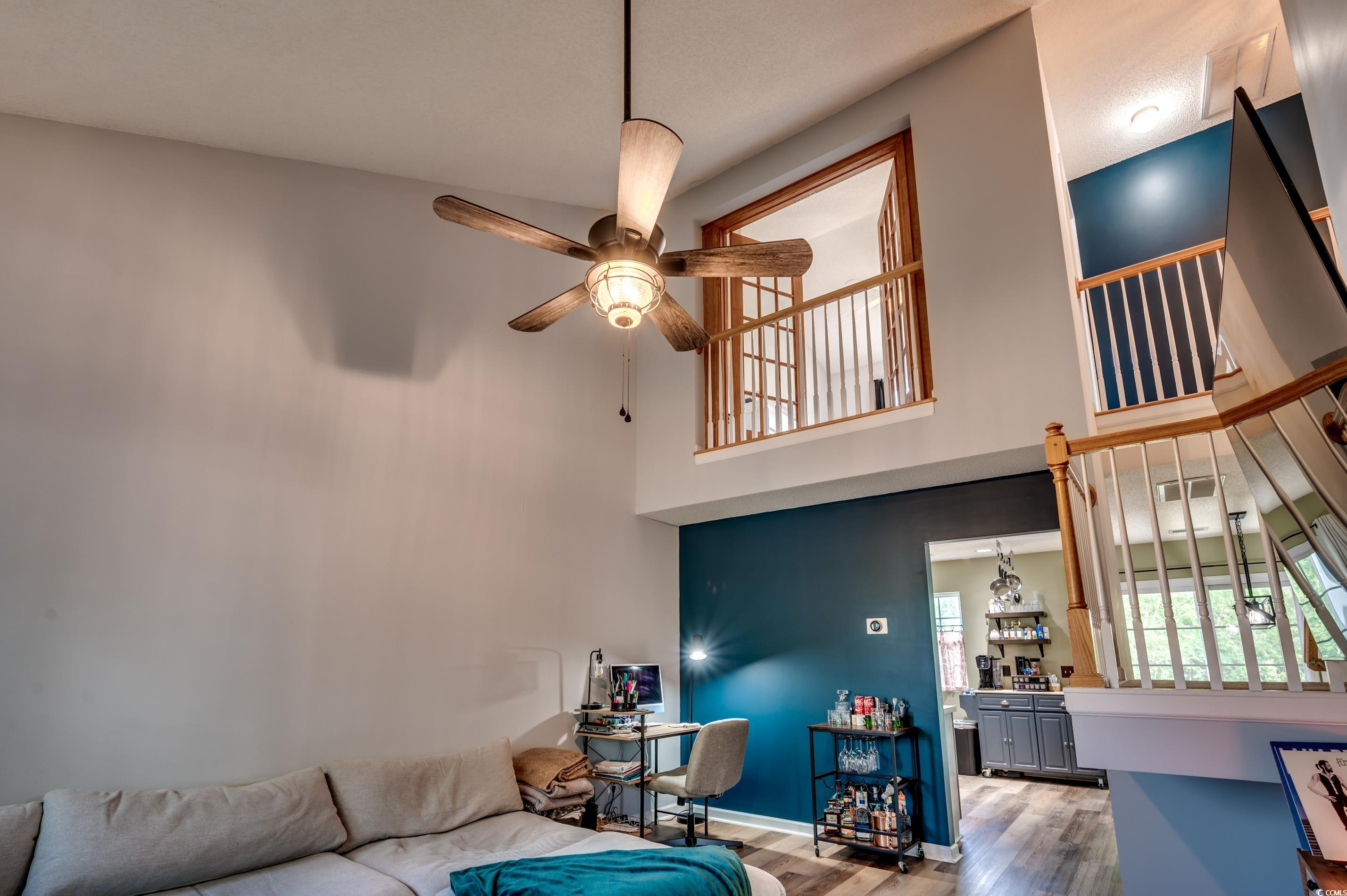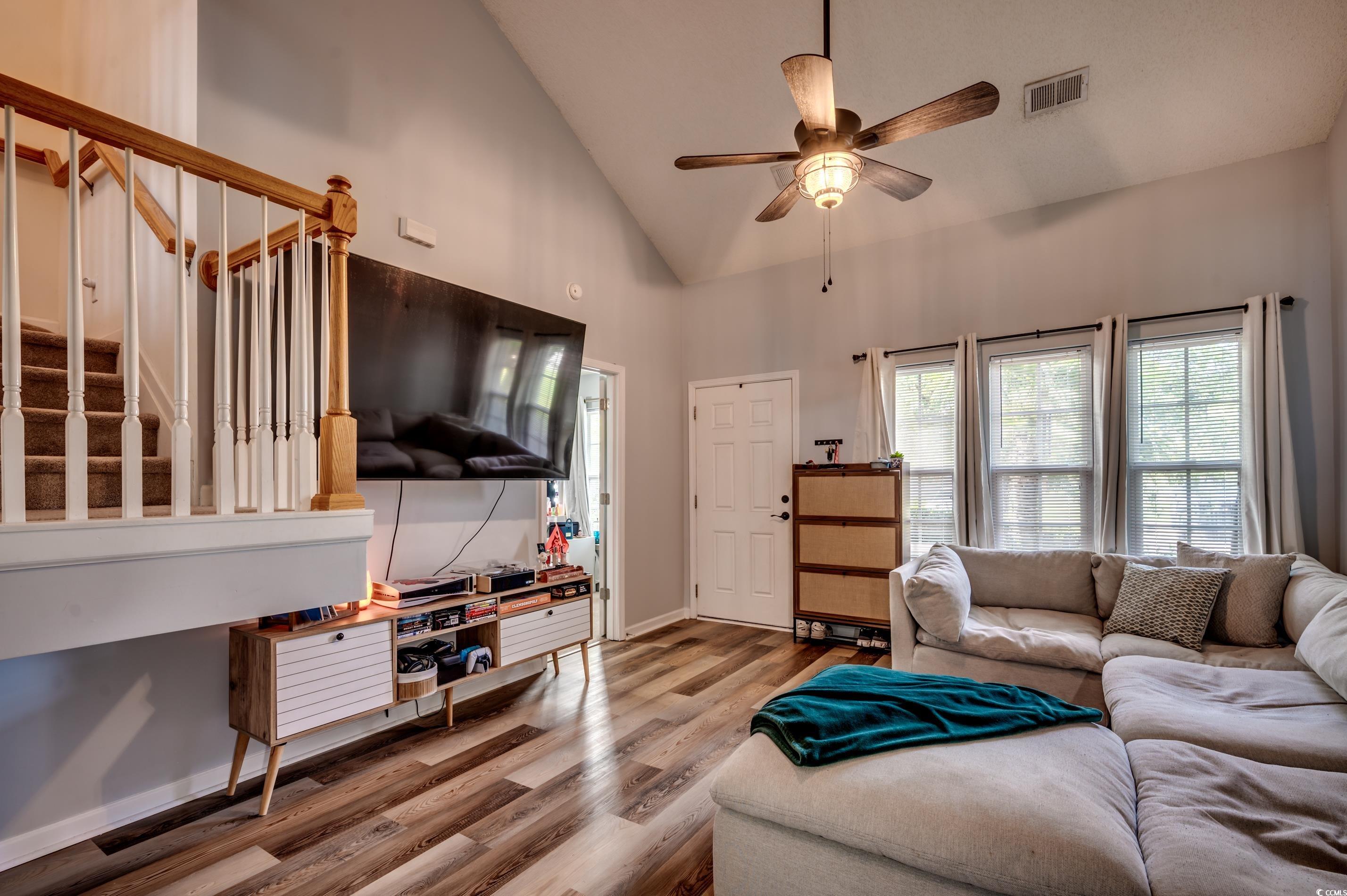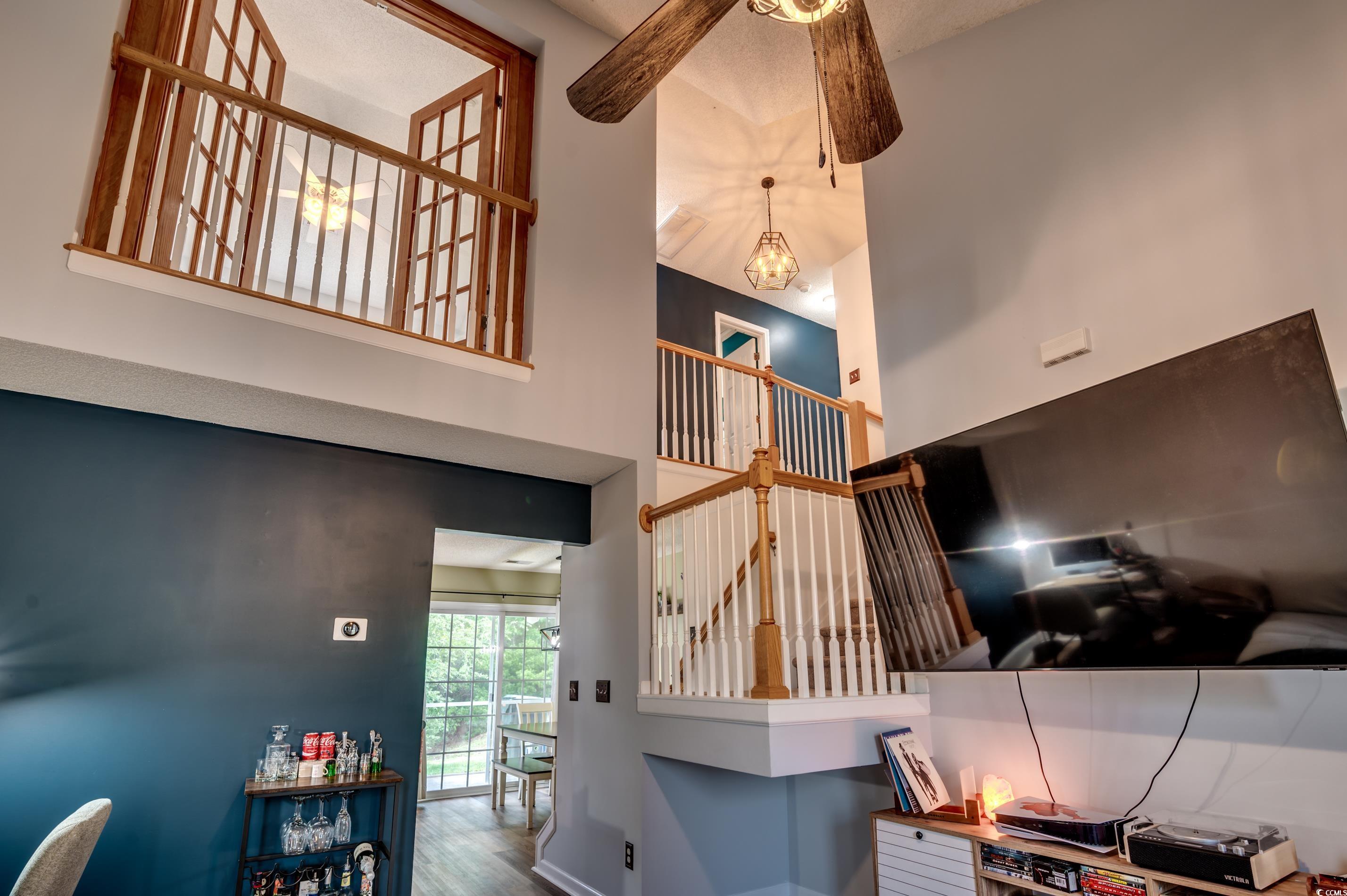 A rare opportunity to own this 3 bedroom, 2.5 bath end unit townhome nestled and tucked away in a tranquil setting of Midtown Village! Step inside to discover high vaulted ceilings that create a bright and open living area situated conveniently next to your first floor master bedroom with ensuite bathroom. Heading into the kitchen equipped with a pantry, you will trendy stainless steel appliances and a breakfast bar perfectly situated to start your mornings or prepare your meals throughout the day. Upstairs is bedroom number two that boasts a walk in closet and elegant French doors that open to overlook the living area, adding architectural charm and flexibility for use as an office or guest room. Looking out the window, you can also catch beautiful views of the pond out back. Down the hall, in between bedroom three you will find a full bathroom with a tub/shower combo. Back through the kitchen is your screened in porch ideal for relaxing or entertaining while enjoying the serene pond views along with added privacy and ample surrounding green space. The porch also includes extra storage space for your convenience. Recent major updates include a new HVAC system installed in 2024. This nearly maintenance free townhome is in a highly desirable location, located within 10 minutes from local schools and the charm of historic downtown Conway! Square footage is approximate and not guaranteed. Buyer is responsible for verification.