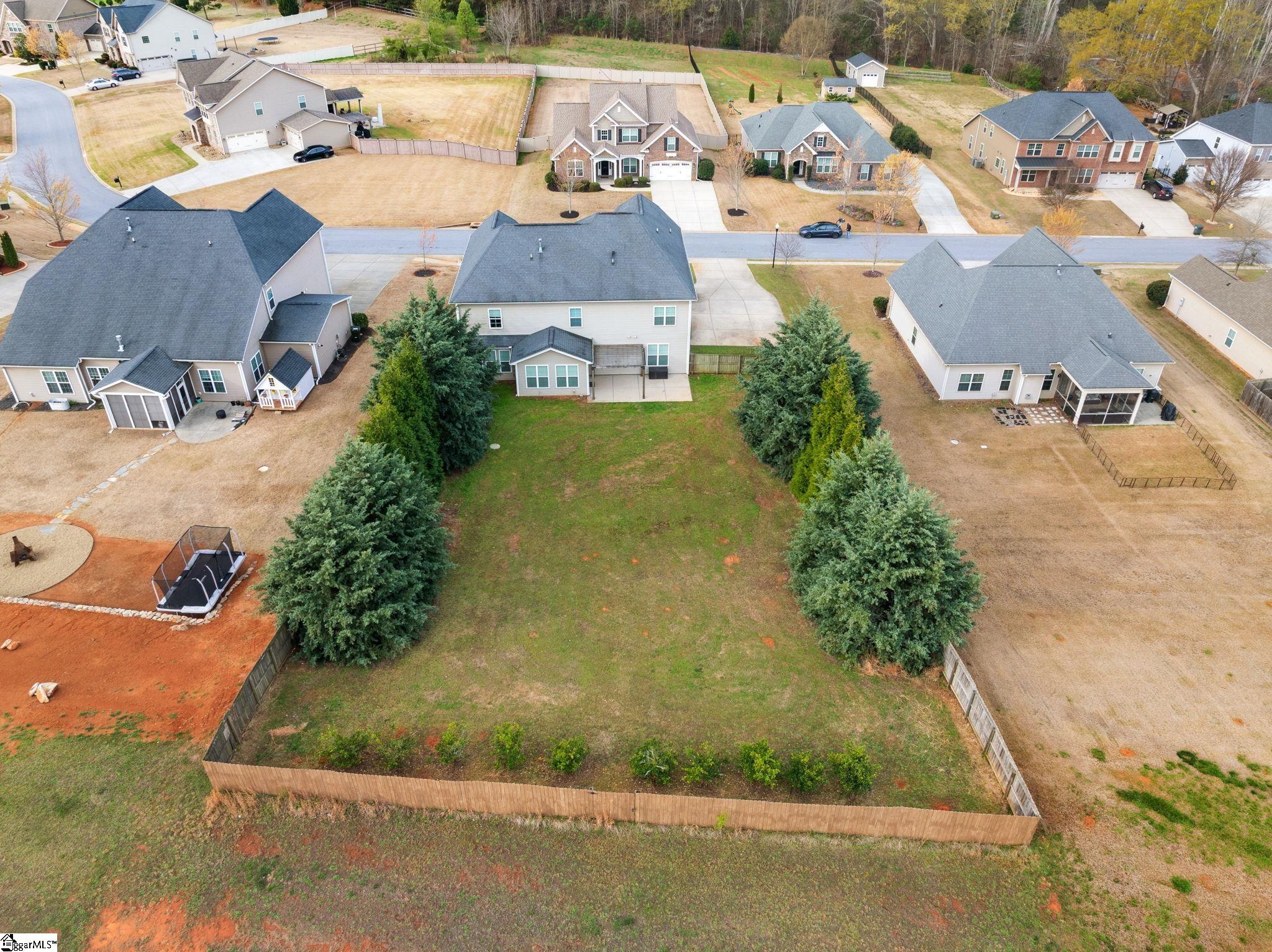 Welcome to the highly desirable Coachman Plantation community, ideally zoned for Rudolph Gordon Elementary and Middle Schools, as well as the new Fountain Inn High School. Situated on an expansive .67-acre lot, this property offers exceptional privacy with a fully fenced backyard and mature trees lining both sides. The current fenced backyard represents only a portion of the property—per GIS mapping, the lot extends significantly beyond the existing fence line, offering a rare opportunity to expand outdoor living spaces, add a pool, or simply enjoy additional privacy and usable land. Inside, you are welcomed by a private home office with French doors and a formal living or dining room accented by elegant, coffered ceilings. The spacious kitchen is designed for both everyday living and entertaining, featuring abundant counter space, a large breakfast area, and seamless flow into the great room, where a gas fireplace is thoughtfully positioned to allow for flexible furniture placement and design. A bright and inviting sunroom expands the living space and opens to the outdoor patio with pergola, creating the perfect setting for relaxing or hosting guests. The main level also includes a private bedroom with a full bath and large closet, ideal for guests or multi-generational living. A convenient half bath and mudroom area are located just off the garage. Upstairs, wood plank stairs lead to a generous landing that is perfect for a reading nook or additional workspace, along with a catwalk overlooking the foyer. The bonus room features a charming window seat, offering a cozy retreat. Two secondary bedrooms share a spacious bath with dual vanities and a separate water closet. An additional bedroom offers generous space and oversized closets, while abundant storage can be found throughout the home. The primary suite is a true retreat, complete with a sitting area, three closets, dual vanities, a separate shower, and a Roman garden tub. Located within walking distance to neighborhood amenities and set in one of the area’s most sought-after communities, this home offers the perfect blend of space, function, and lifestyle.