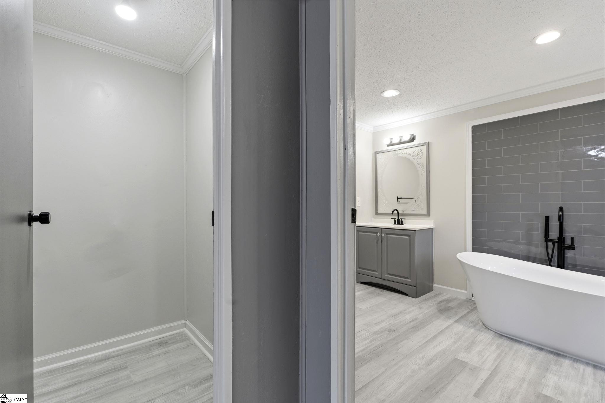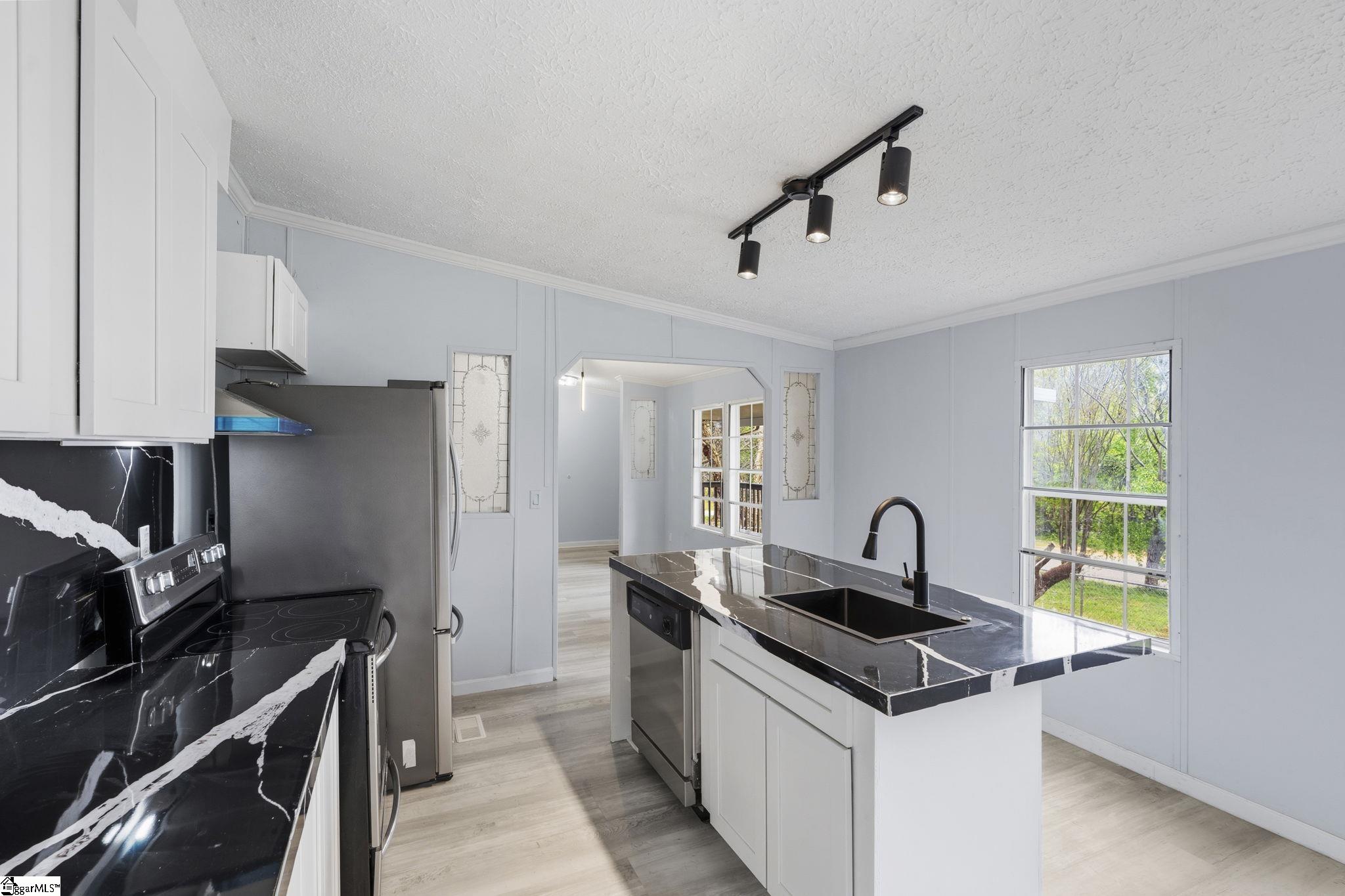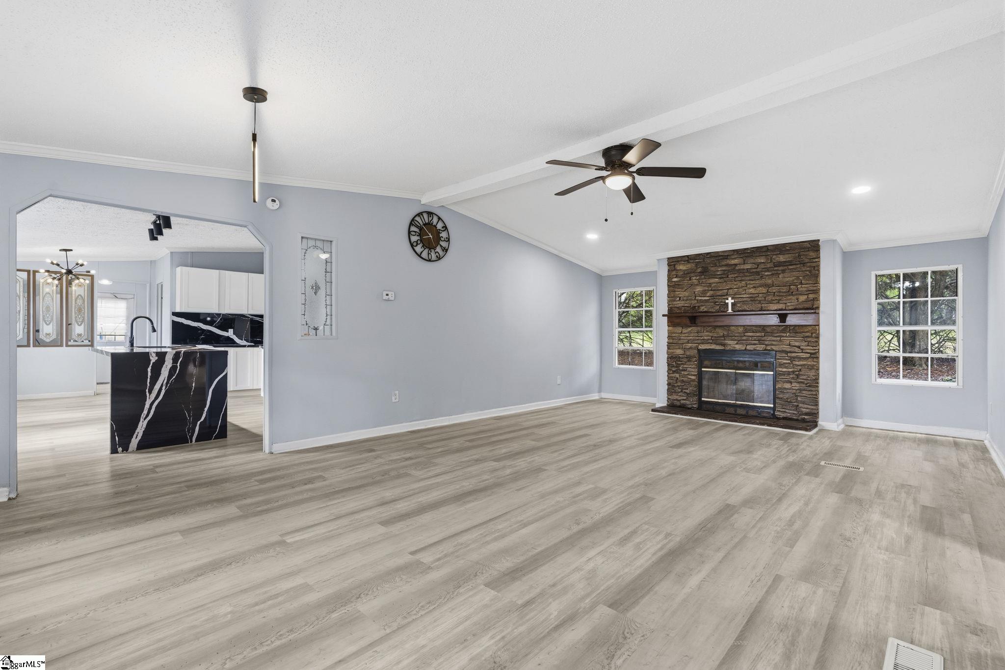 What is not to love? Remodeled home on a corner lot in Wellford, and homeownership can be yours! From the oversized private lot to the new luxury vinyl plank floors, you will love spending time in this peaceful home. The front yard features a covered deck that is perfect for relaxing rain or shine, plus a fenced area around the front porch that is ideal for letting your dog out with ease. Inside, the large living room welcomes you with vaulted ceilings and a floor to ceiling stone fireplace that really sets the tone. The kitchen brings the wow factor with stunning black waterfall countertops, new stainless steel appliances including a refrigerator that conveys, an upscale hood, walk in pantry, new sink and faucet, and plenty of workspace. The split floor plan offers a private primary suite with LED recessed lighting, his and hers walk in closets, and an upgraded bath featuring a freestanding tub, accent wall, separate vanities, and a separate shower. The secondary bedrooms are conveniently connected by a shared bathroom. You will also find a large laundry room, and the washer and dryer convey with the home. Outside, there are plenty of storage options including an outbuilding and a one and a half car garage with full power. You will not believe how peaceful and easy this home is to live in, and for added peace of mind, a brand new roof tops it all off.