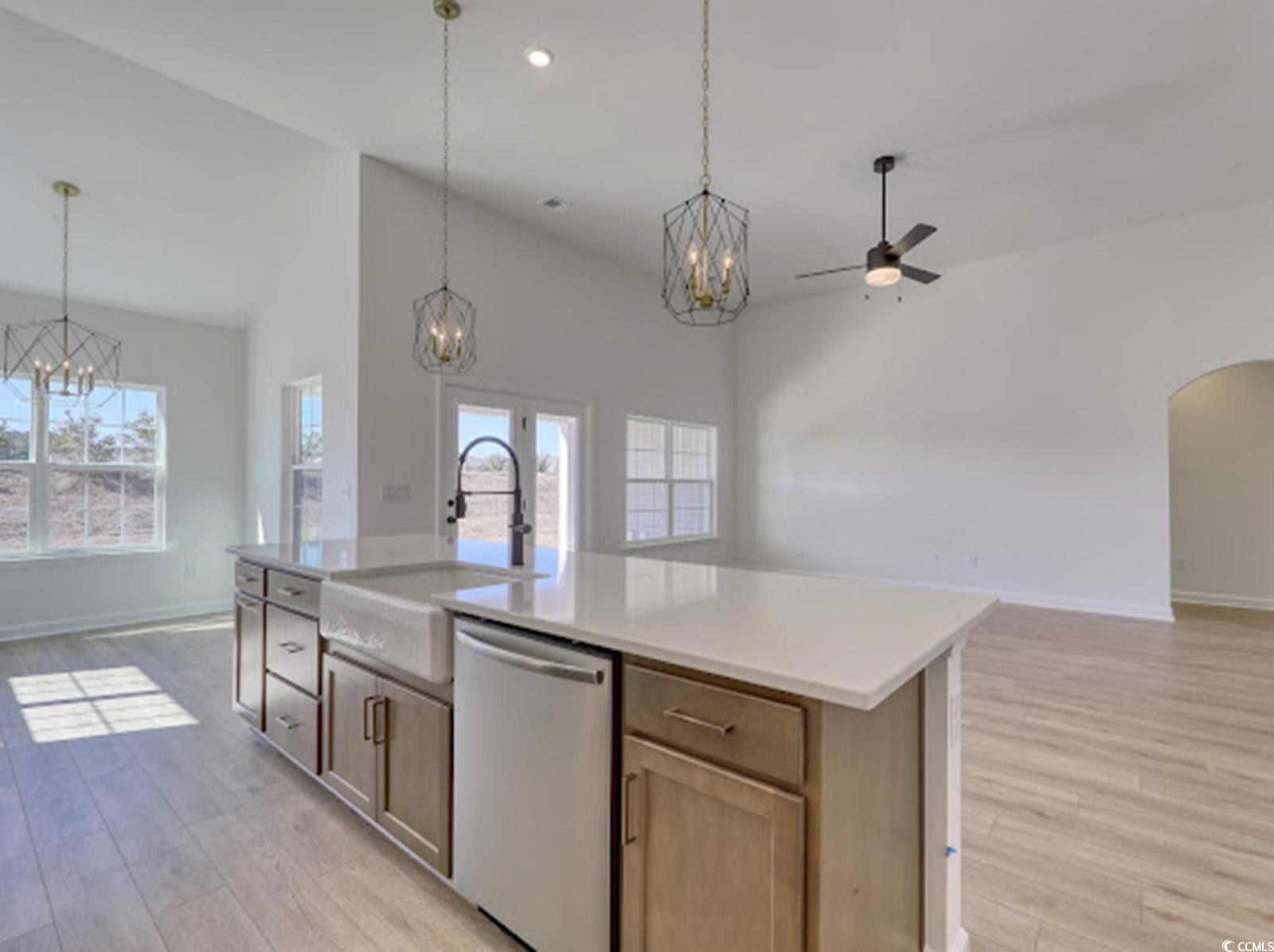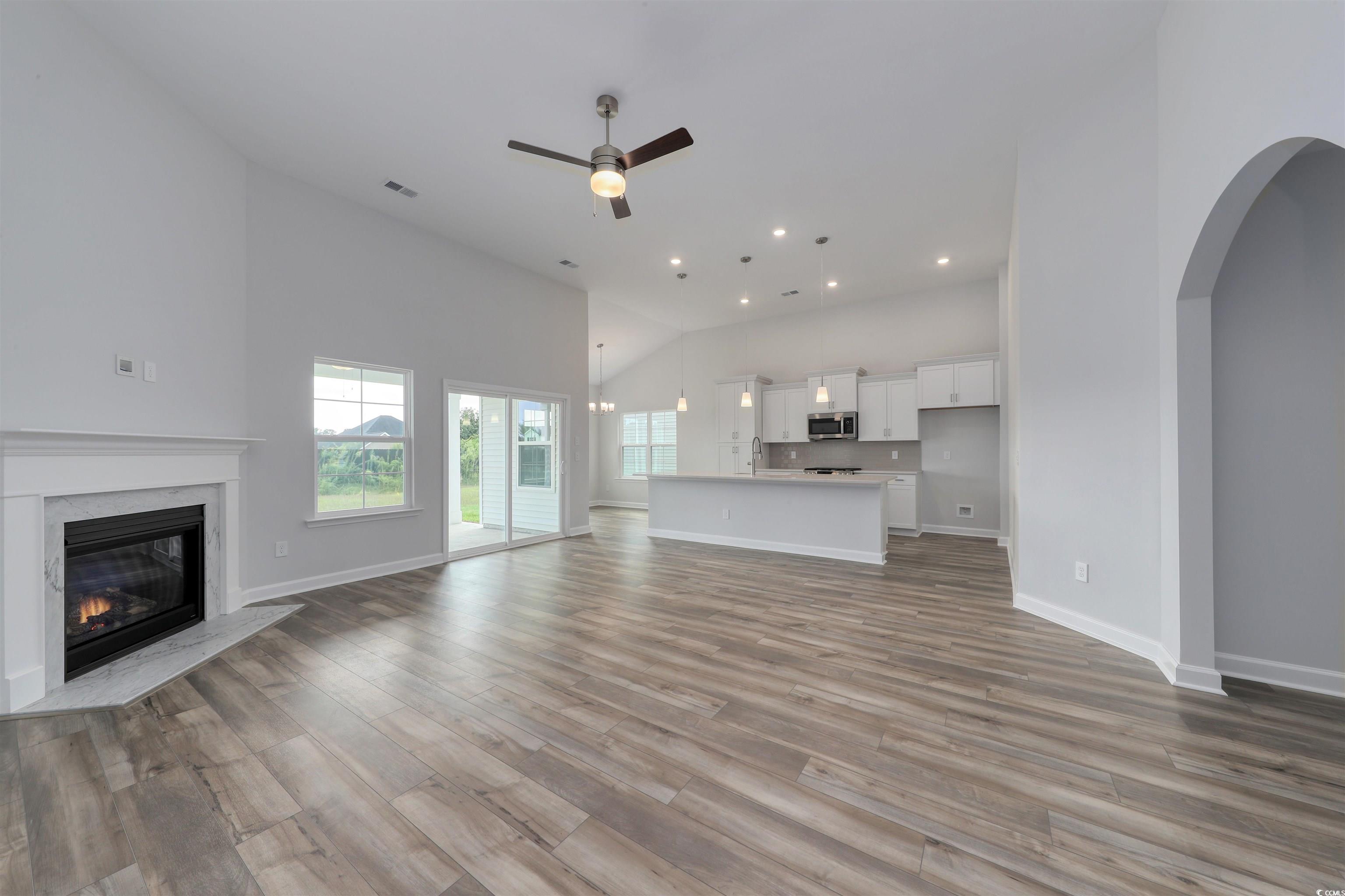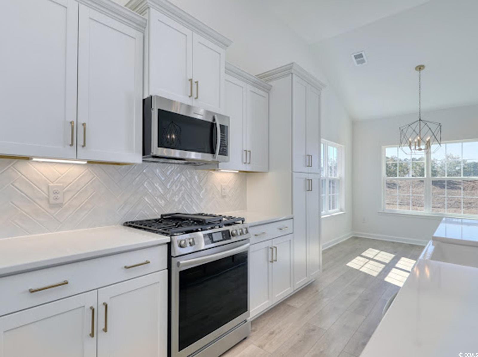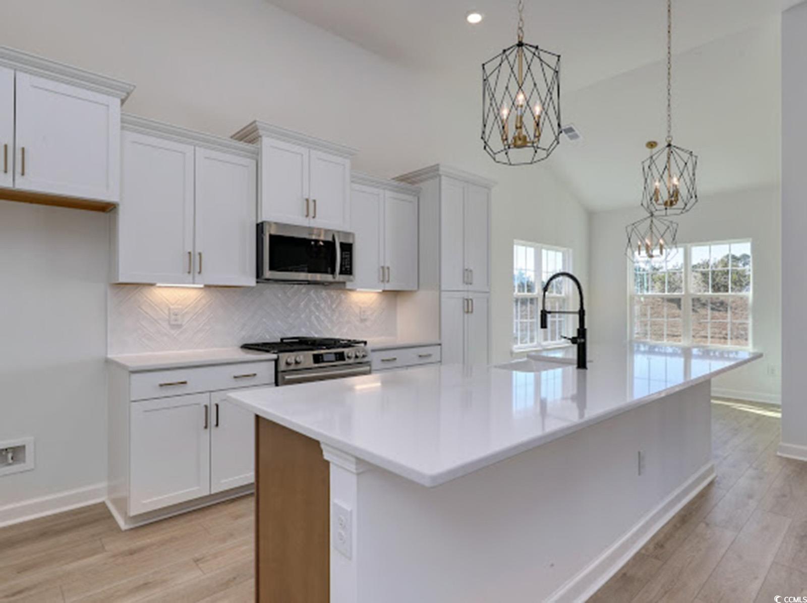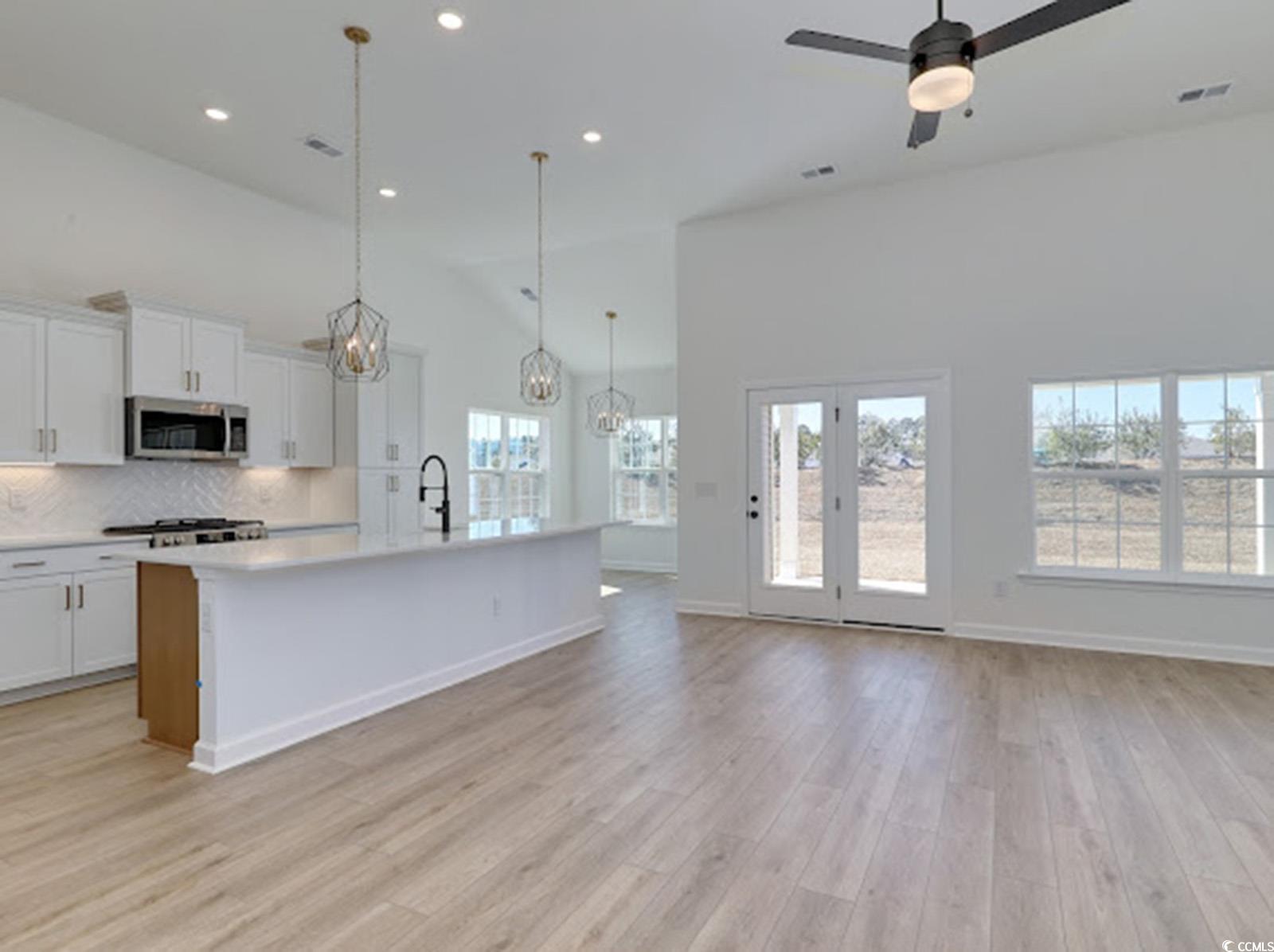 Gorgeous foyer with judges paneling and arches. Upon entering the family room feel the space created with the high ceilings which flow to the open kitchen! Your primary bedroom will have a 10 ft ceiling. Along with the large rear covered patio, you'll feel like you're living in a much larger home! The kitchen boasts quartz countertops, stainless steel undermount sink, gas GE profile range, upgraded white cabinetry with soft close & dovetail drawers, tile backsplash, and the super pantry cabinet. Butler's pantry too! The primary suite bath will include raised double bowl vanity with quartz, 60" x 60" tiled shower with frameless glass enclosure, linen and a generous walk-in closet. Gutters at the entrance and full yard irrigation. Luxury vinyl plank flooring in all living areas and primary bedroom, and carpet in bedrooms 2 and 3. Smart home automation is also included! Our 1-2-10 year warranty will give you peace of mind. Superior energy efficient construction includes 15 SEER HVAC and R-38 ceiling insulation. Photo's shown are of similar home - colors/options will vary.