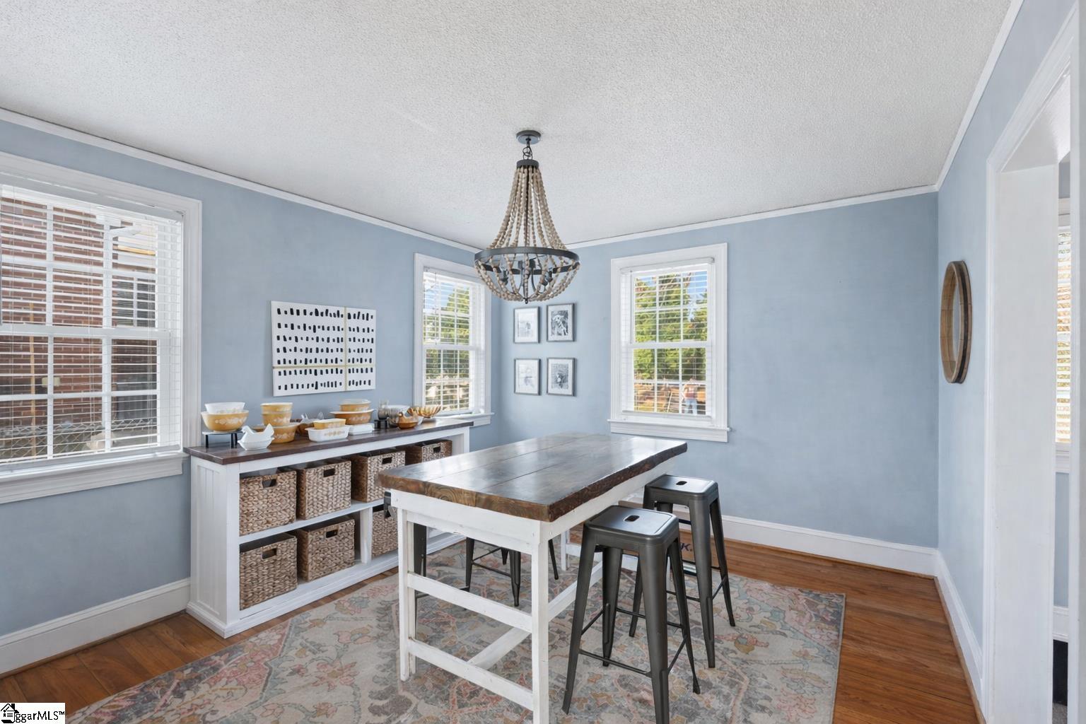Don’t miss the opportunity to own this charming 3-bedroom, 1-bath historic ranch nestled in a well-established neighborhood just minutes from downtown Spartanburg, shopping, dining, grocery stores, and convenient access to Interstates I-85 and I-26. Situated on a spacious lot with a large backyard, this home offers both character and modern updates in a highly desirable location. Inside, you’ll find beautiful hardwood floors that flow throughout most of the home, adding warmth and timeless appeal. The expansive living room serves as the heart of the home and features a classic fireplace with historic molding, complemented by gas logs for modern comfort. The light-filled dining room offers excellent space for entertaining and includes a coat closet while providing easy access to the walk-in laundry room and entry to the kitchen. The updated kitchen features granite countertops, an undermount sink, smooth-top range, built-in microwave, dishwasher, pantry, refrigerator and the perfect nook for a bistro table, making it both functional and inviting. From the kitchen, step outside to a covered stoop overlooking the spacious fenced backyard, ideal for relaxing or entertaining. The full bathroom has been tastefully updated with a new vanity, medicine cabinet mirror, and ceramic tile flooring. Down the hall, you’ll find three spacious bedrooms, each with ceiling fans and the same beautiful hardwood flooring found throughout the home. This property blends historic character with thoughtful modern updates, including original glass doorknobs, newer windows, updated interior and exterior paint, granite countertops, gas log fireplace, a roof installed in 2020, and an HVAC system that is less than a year old (June 2025). Lovingly maintained, this home has been a true treasure for its current owners and is ready to welcome its next chapter. Some photos are digitally enhanced and virtually staged.