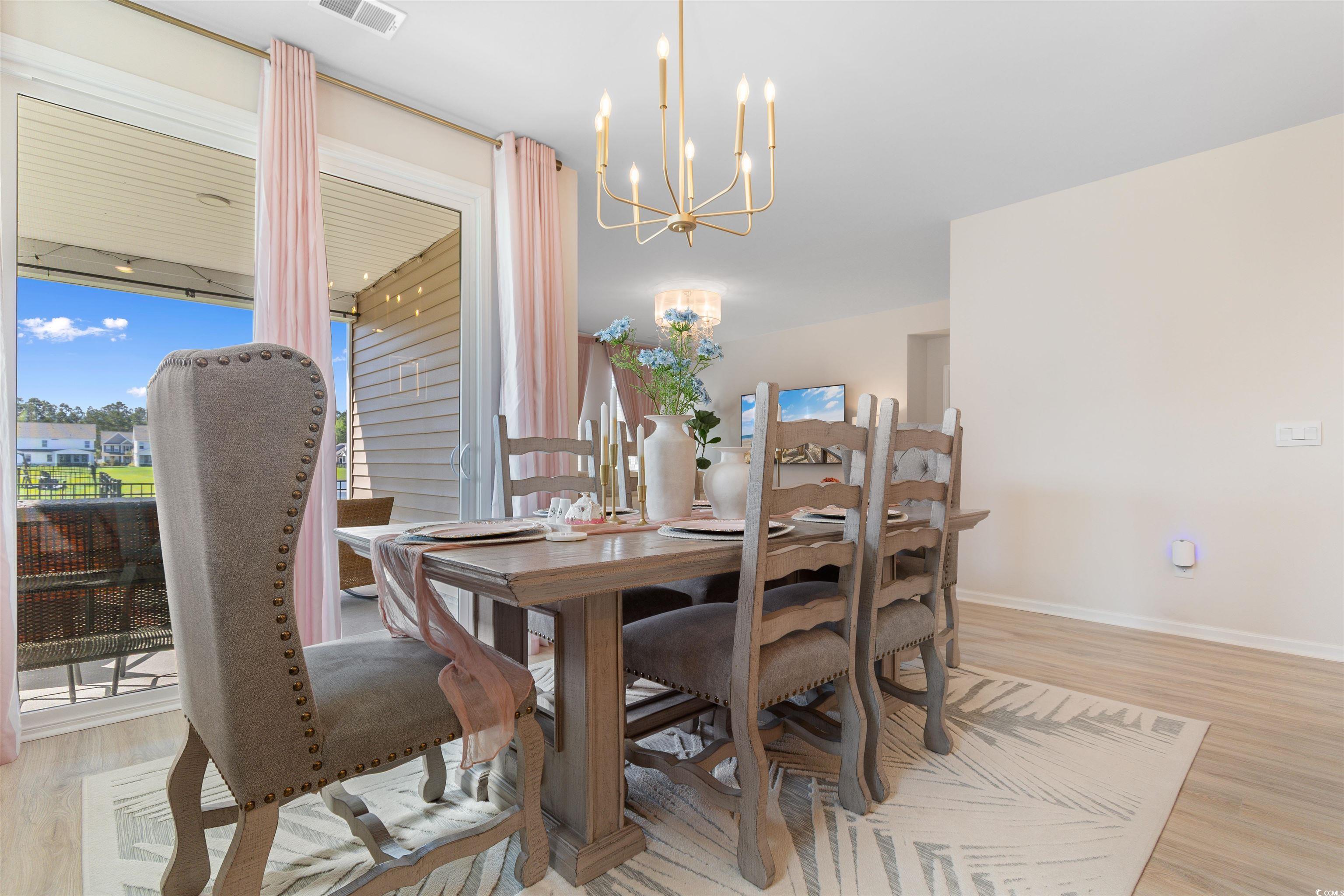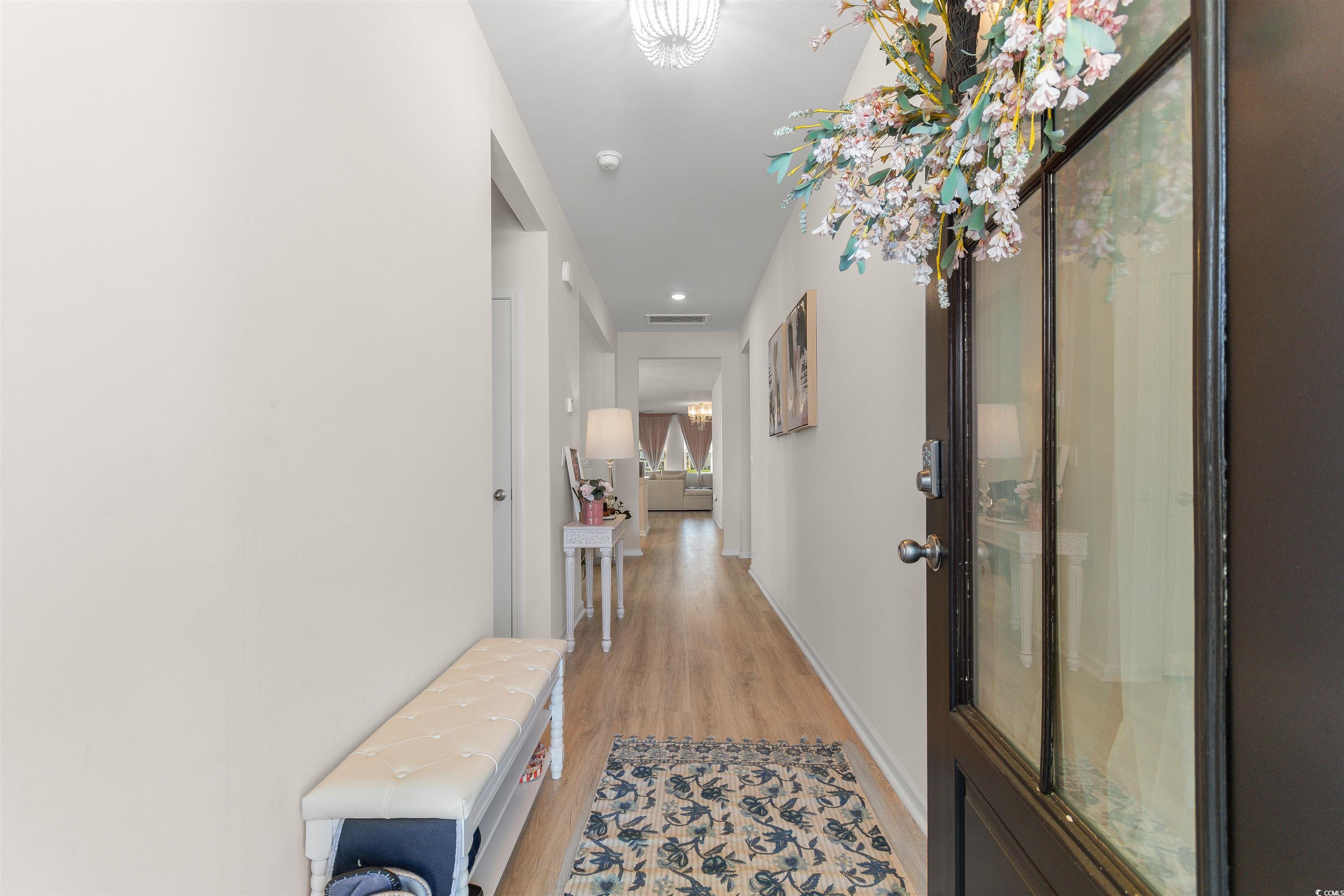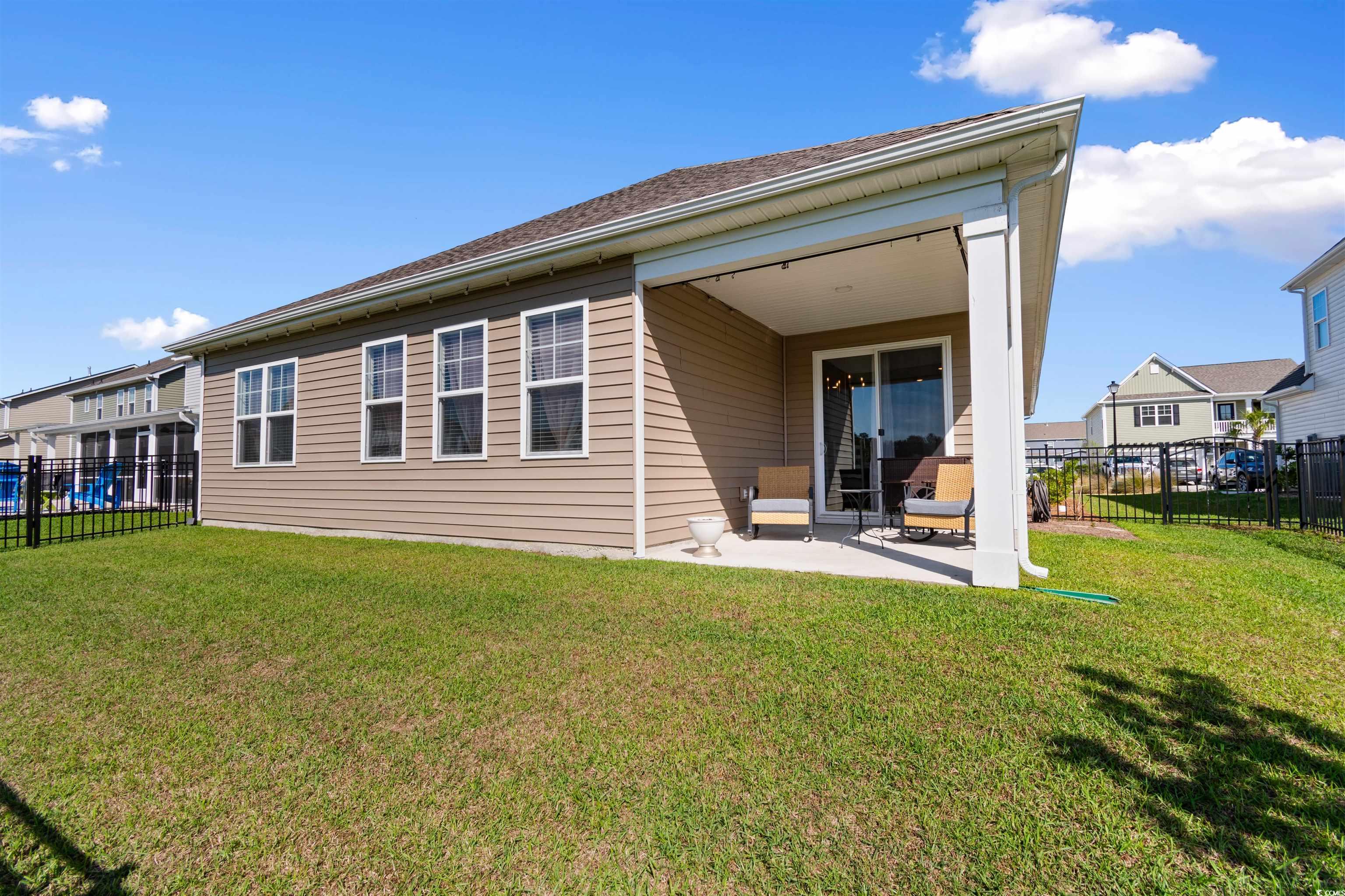 Step into this stunning, one-level home just 5.3 miles from the Surfside Beach Pier! Thoughtfully designed with elegance and comfort in mind, this 3-bedroom, 2-bathroom property features a flexible bonus room—perfect for a home office, formal dining room, or creative space. The current owners enjoy it as a cozy library. From the charming rocking chair front porch to the classy modern fixtures and designer touches throughout, this home is equal parts stylish and functional. The open-concept layout offers a seamless flow between the living, dining, and kitchen areas—perfect for both entertaining and everyday living. The kitchen is a true showpiece with crisp white cabinetry, quartz countertops, stainless steel appliances, a gas stove, pantry, and a designer tile backsplash that adds texture and visual interest. Chic gold knobs and pulls complete the look with a touch of glam. The split-bedroom floor plan offers privacy and comfort. The spacious primary suite is tucked at the back of the home with serene pond views, and features a walk-in shower, dual sinks, and a custom closet that feels like a boutique showroom. Two additional bedrooms are located at the front of the home and share a well-appointed hall bath. Laminate wood flooring runs throughout the main living areas, adding warmth and elegance. Step outside to your covered back porch and enjoy tranquil water views from the fenced-in yard—perfect for morning coffee or unwinding at the end of the day. Additional highlights include a 2-car garage and a dedicated laundry room making this home truly move-in ready. Located in one of the area's most desirable communities, residents enjoy resort-style amenities including two sparkling pools (one zero-entry), pickleball court, two fitness centers, multiple playgrounds, a fishing pond, and a spacious clubhouse. Conveniently close to shopping, dining, Murrells Inlet Marsh Walk, and Surfside area beaches. Don’t miss your chance to own this exceptional home—schedule your private showing today!