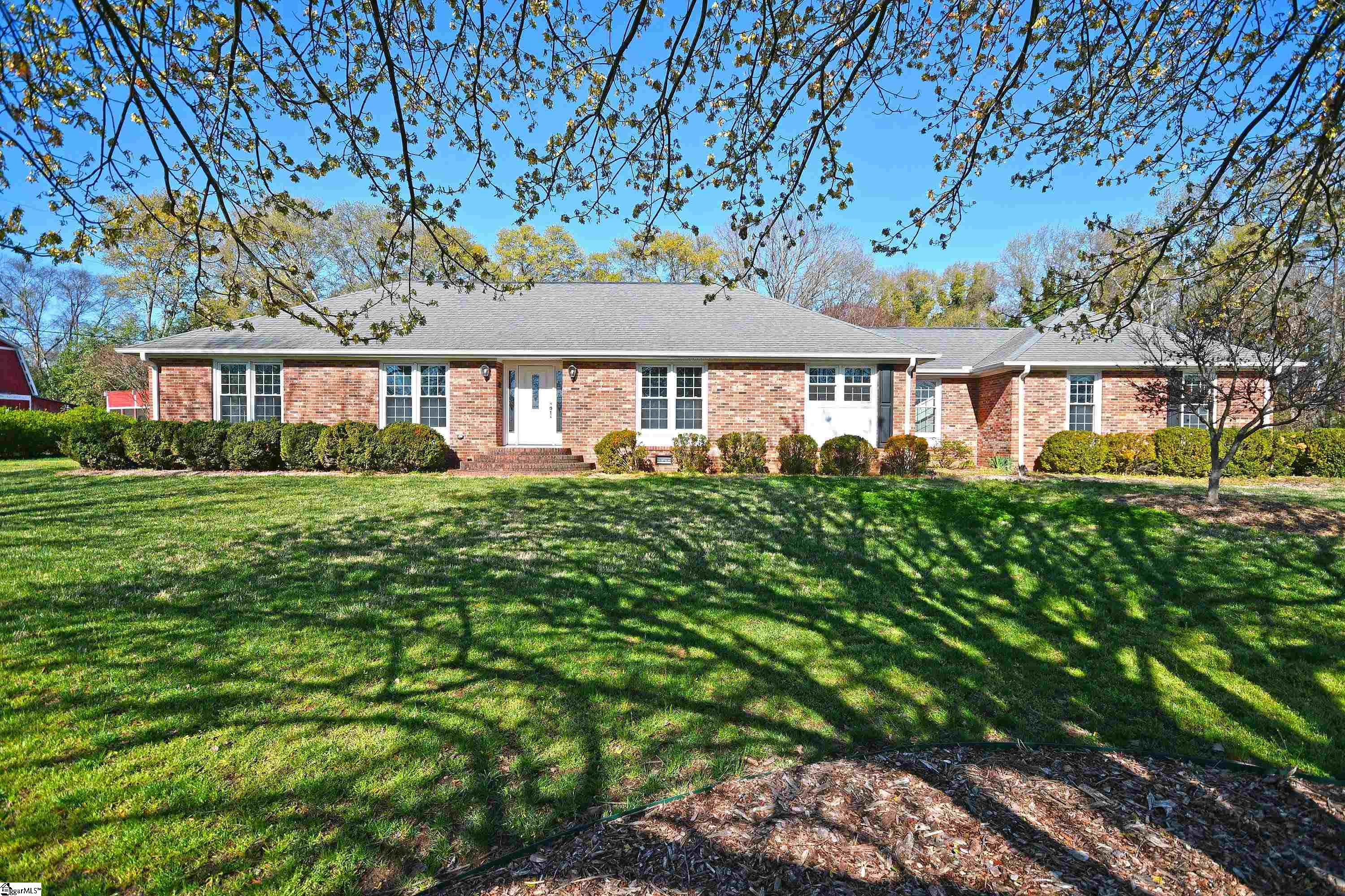Discover the perfect blend of modern updates and peaceful country living in this beautifully remodeled ranch situated on 2+ acres on the Eastside of Greenville SC. This ranch was completely remodeled in 2022-23 with an open kitchen, dining and living room area that leads out to a huge 600 square foot screened in porch ideal for entertaining with family and friends. The fully renovated kitchen boasts a large center island, quartz countertops, custom cabinetry which flows into the dining area and living room with a cozy gas fireplace. Step out thru the double doors onto the huge screened in porch complete with hot tub/spa that is perfect for year round relaxation. The owner's suite provides a serene retreat with a beautifully updated spa-style bathroom complete with a roll-in shower. A private side door leads out to the spa area. 2 additional bedrooms offer ideal flexibility for family, guests, home office or hobby space. The attached finished 20x22 FLEX space with separate entry + 1/2 bath creates a versatile space for an office , home schooling, salon, dance or karate studio, or multigenerational living. The ample 11x10 Laundry area with custom cabinetry and full sized sink + 2nd refrigerator/freezer space has raised built in platforms for full size front load washer dryer. The outdoor entertainer will be in heaven with the 600 sq foot screened in porch overlooking the private back yard with mature landscaping leading out to the large trex decking grilling porch with gas hookup and room for multiple grills leading to a ramp down to the paved driveway. The huge detached 537 sq ft garage/workshop + 883 sq ft storage space offer endless opportunities for the hobbyist, mechanic, woodworker, car collector etc Despite the peaceful country feel this home is just minutes from GSP International Airport, Interstate 85, Pelham Medical Center, Five Forks shopping and quaint downtown Greer. You can be in downtown Greenville for the incredible restaurants, festivals and shopping in 20 minutes. If you have been looking for a move-in ready home with space to spread out, entertain and enjoy the outdoors, this jewel checks all of the boxes!