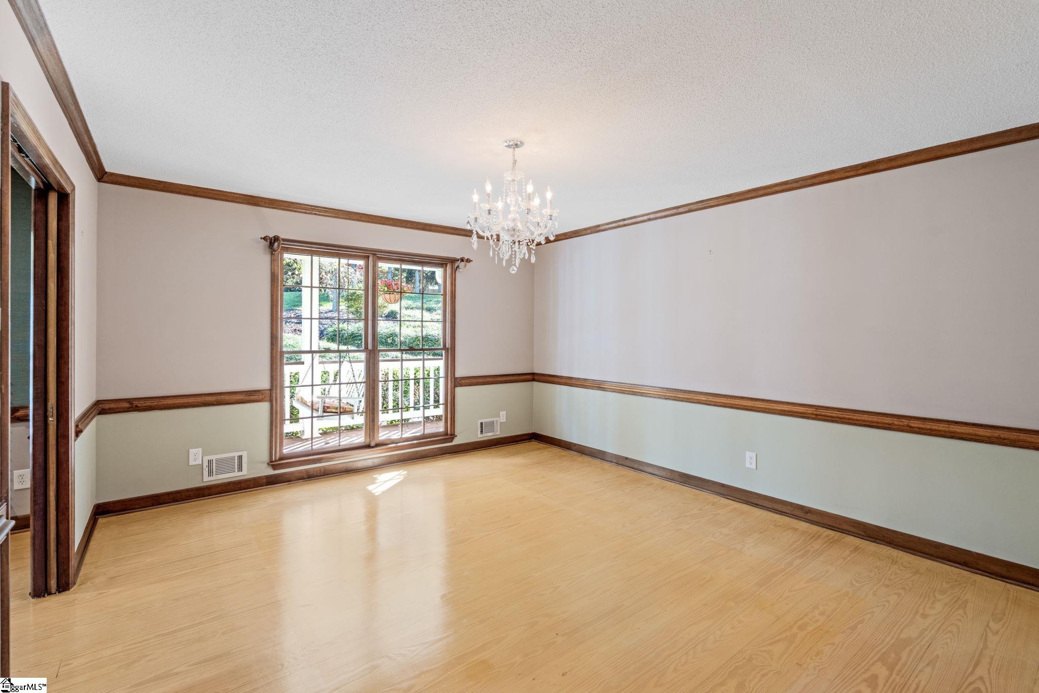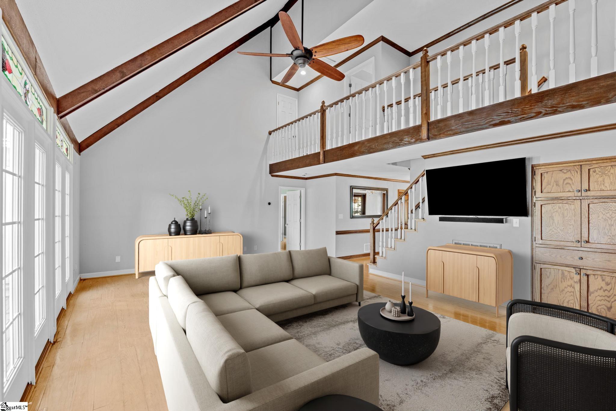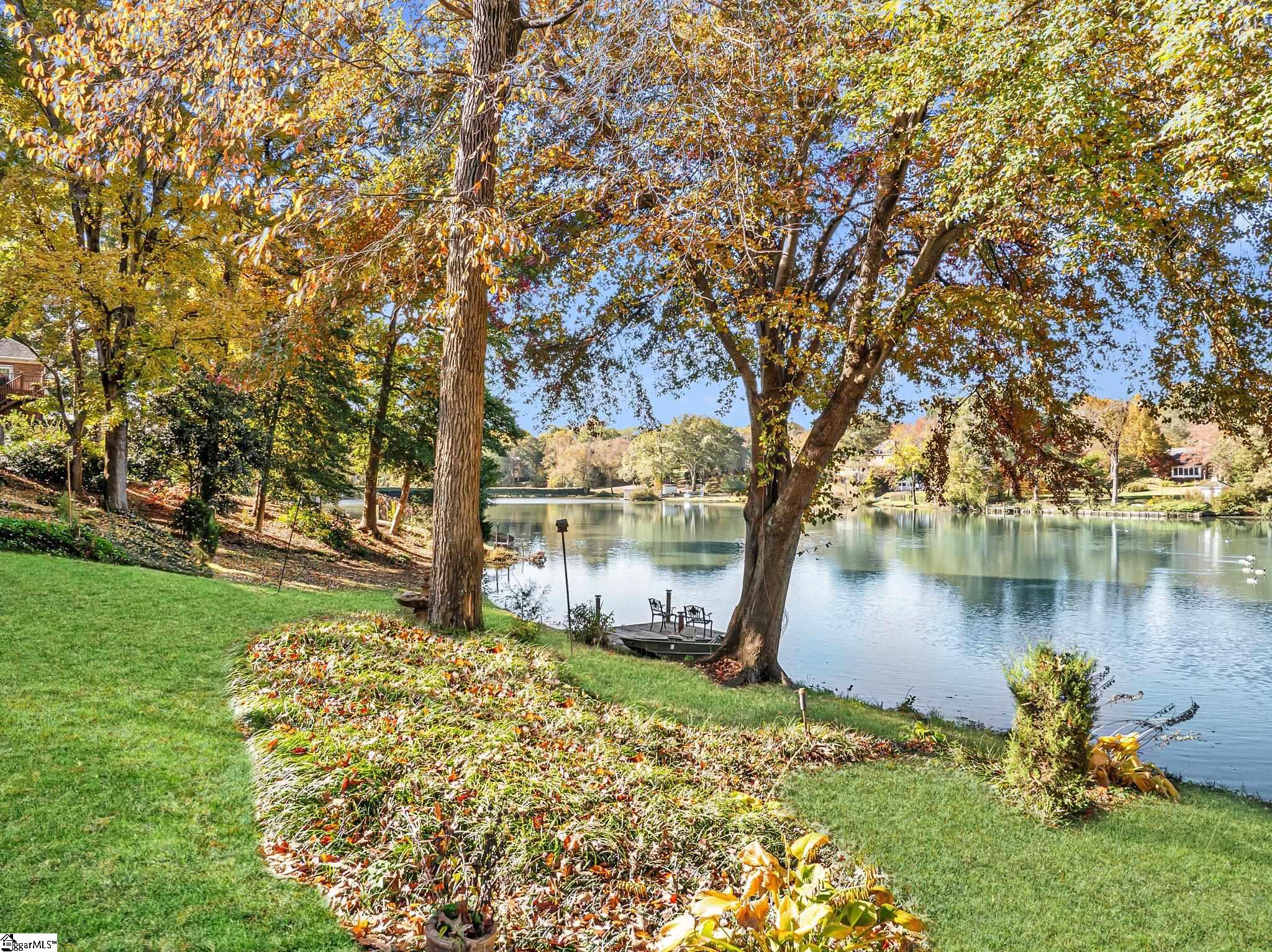 Exclusive lakefront living reaches new heights in this stunning Cape Cod residence—an exceptional blend of timeless character, refined craftsmanship, and serene waterfront beauty. Perfectly positioned for privacy, the 4-bedroom, 3-bath home (owner's suite and additional bedroom on the main) offers sweeping lake views from nearly every room and includes its own private dock on the exclusive neighborhood lake, reserved only for 26 lakefront homeowners. The elegant front porch welcomes guests into the foyer, where light-stained, wide-plank pine hardwood floors flow throughout the main level. Just off the entry, a sophisticated home office features custom built-ins, storage closets, dual pocket doors for privacy, and abundant natural light. The formal dining room exudes classic charm with detailed chair molding and a seamless transition into the gourmet kitchen—complete with a gas range and vent hood, built-in oven and microwave, granite countertops, white subway and decorative tile backsplash, and a functional island, a custom spice rack and additional cabinet storage with custom stained glass cabinets. A charming eat-in nook with banquette seating overlooks the tranquil lake, creating the perfect setting for morning coffee or casual gatherings and offering additional storage space found in the built-ins. The impressive living room showcases soaring beamed ceilings, a two-story exposed brick wood-burning fireplace, and a wet bar—opening through stained-glass French doors to an expansive deck that captures breathtaking lake views. The owner’s suite is a true retreat, featuring a private fireplace, a serene sunroom, and a luxurious ensuite with separate dual vanities, a soaking tub, a renovated glass-enclosed shower, and a generous walk-in closet. A main-floor guest suite offers comfort and privacy with multiple closets and a full bath, while upstairs, two additional bedrooms with new carpet share a thoughtfully designed bath with separation from vanity and shower area. Exceptional storage abounds throughout, including two spacious walk-in attics that can easily be converted into additional living areas, a large pantry and laundry room with a built-in drain, and walk-in storage adjacent to the garage. Even the crawlspace and under-deck areas offer ample room for organization. Enjoy the best of outdoor living from your expansive deck or private dock, where you can take in the peaceful beauty of the water each day. With its unmatched setting, meticulous attention to detail, and rarity on the market—available for only the second time since construction—this home delivers the ultimate lakefront lifestyle that defines elegance and exclusivity. Londonderry comprises 330 residences and is designed for community and recreation. Neighborhood amenities include a baseball field for both organized games and casual play, tennis, pickleball, and basketball courts for active lifestyles, a playground and park, and access to the scenic North Tyger River, offering opportunities for fishing, nature walks, and peaceful views. Additional info: Buyers will appreciate that sellers have replaced the downstairs condensing unit in 2024, the Upstairs furnace replaced in 2022, the downstairs furnace in 2020, the gas line and gas logs added to the owner's suite in 2023, gas water heater replaced in 2025. Lawn and yard are irrigated by the lake water and Sellers replaced irrigation pump in 2023!