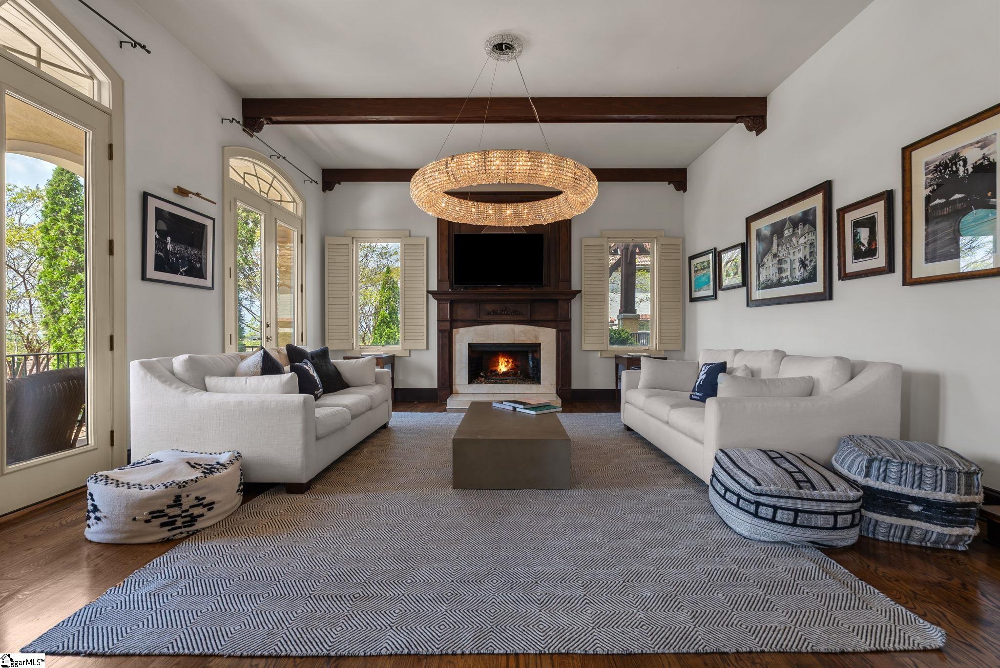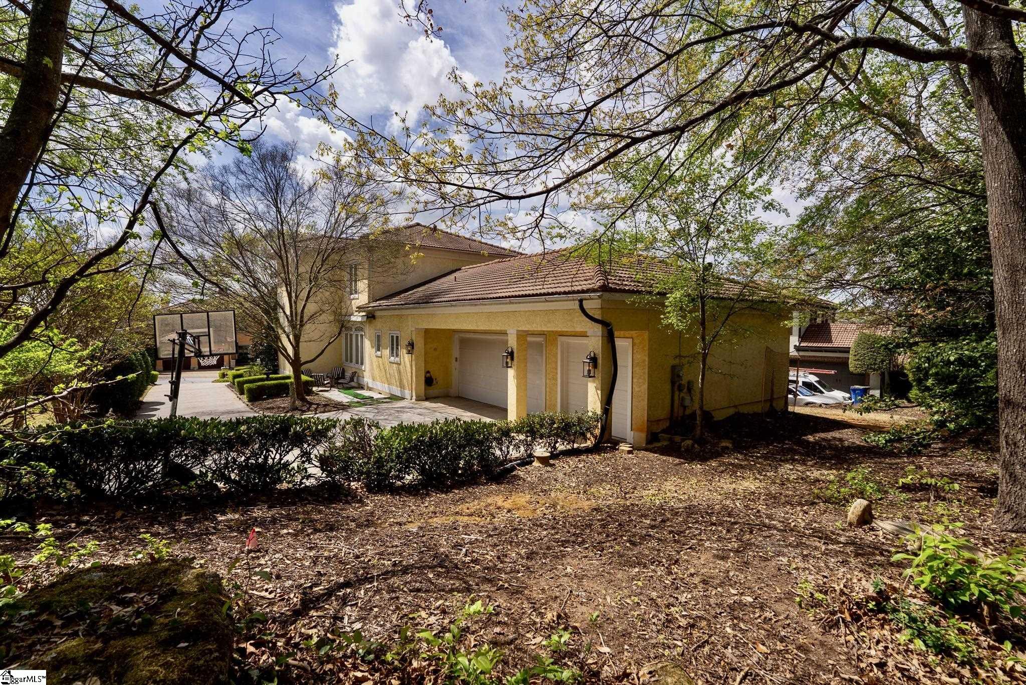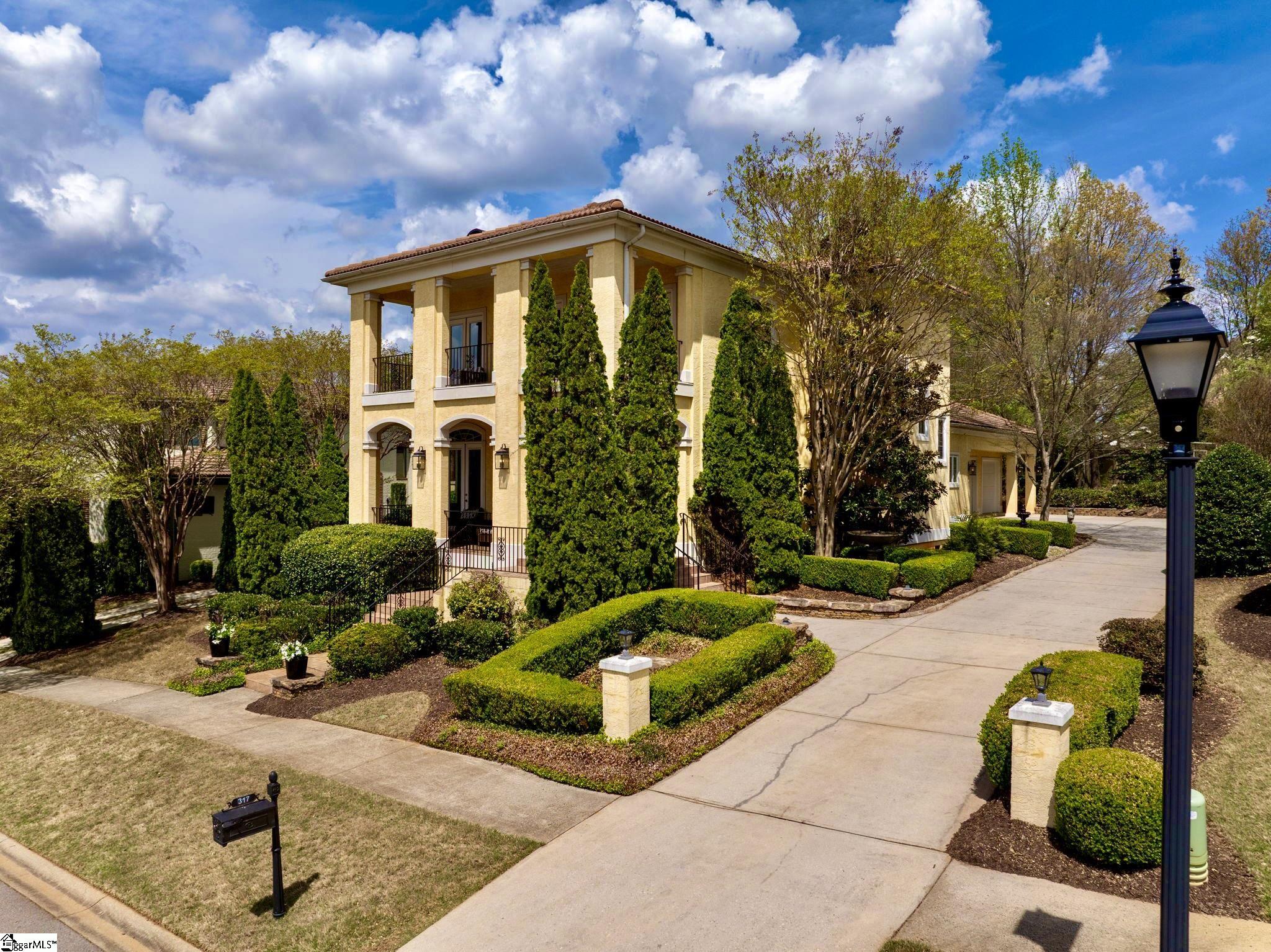 Welcome to Italy in Greenville SC! Sitting on the highest peak in Villaggio di Montebello, 317 Sorono offers stunning MOUNTAIN AND CITY VIEWS, Italian architectural appointments and year-round indoor/outdoor living on FOUR large patios. Upon entering, the great room wows with a grand fireplace, tall ceilings and wood-beams plus French doors that invite in the view. Follow the oversized archways into the dining room that comfortably seats 12 and flows seamlessly out to the 600-sf open patio with pergola and 200-sf covered patio, also accessible from the kitchen and primary suite. Cook Italian favorites in the well-appointed kitchen featuring double ovens, two sinks, an oversized island that seats four and an eat-in dining space, currently used as a keeping room. The main floor primary suite does not disappoint, offering nearly 400 sf and French doors opening to the patio, en-suite with dual vanities, barreled ceiling over the tub, a separate shower and water closet plus a large walk-in closet with closet system. Steps away is the large laundry room with cabinet storage and a half bathroom. Follow the hardwoods upstairs to the OVERSIZED 500 sf bonus room, celebrating the mountain view and wall of French doors inviting you out to the covered porch, ideal for morning coffee or an evening cocktail. Two large bedrooms, each with a walk-in closet and their own full bathroom, complete the second level. Situated on a ¼ acre flat lot, this property HAS A BACKYARD which is a rare find in Villaggio and can easily be fenced and sodded, is ripe for a garden or hot tub. Another desirable feature is the large 3-car, side entry garage! This beautiful home is in Montebello, an established amenity-rich community with a newly renovated club house, tennis/pickleball court, pool, playground, lakes for fishing, bocce ball court and several pocket parks. This neighborhood is active and social with weekly, monthly, and annual events for neighbors to connect. All this minutes from downtown Greenville, Swamp Rabbit Trail, Travelers Rest and Furman University.
