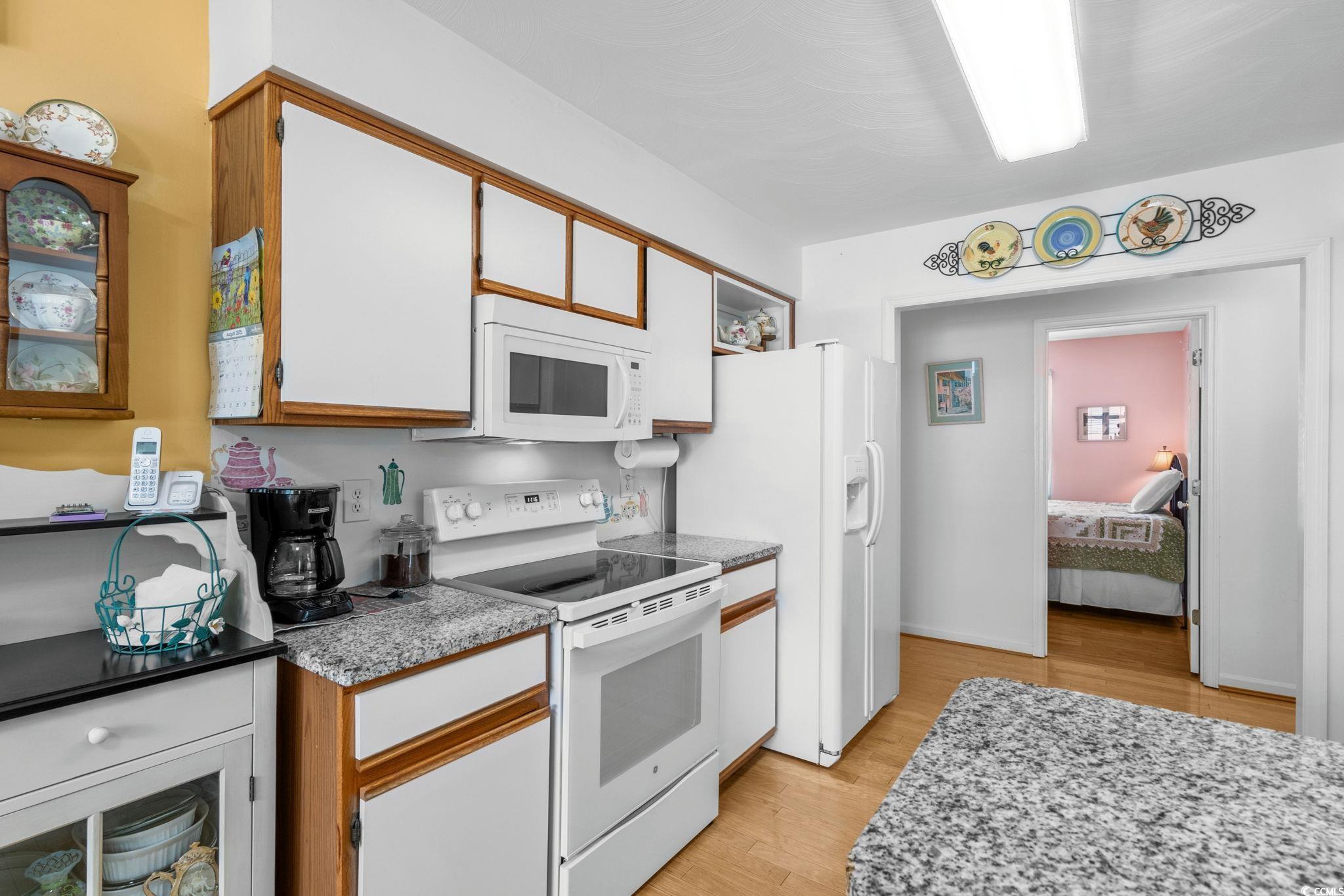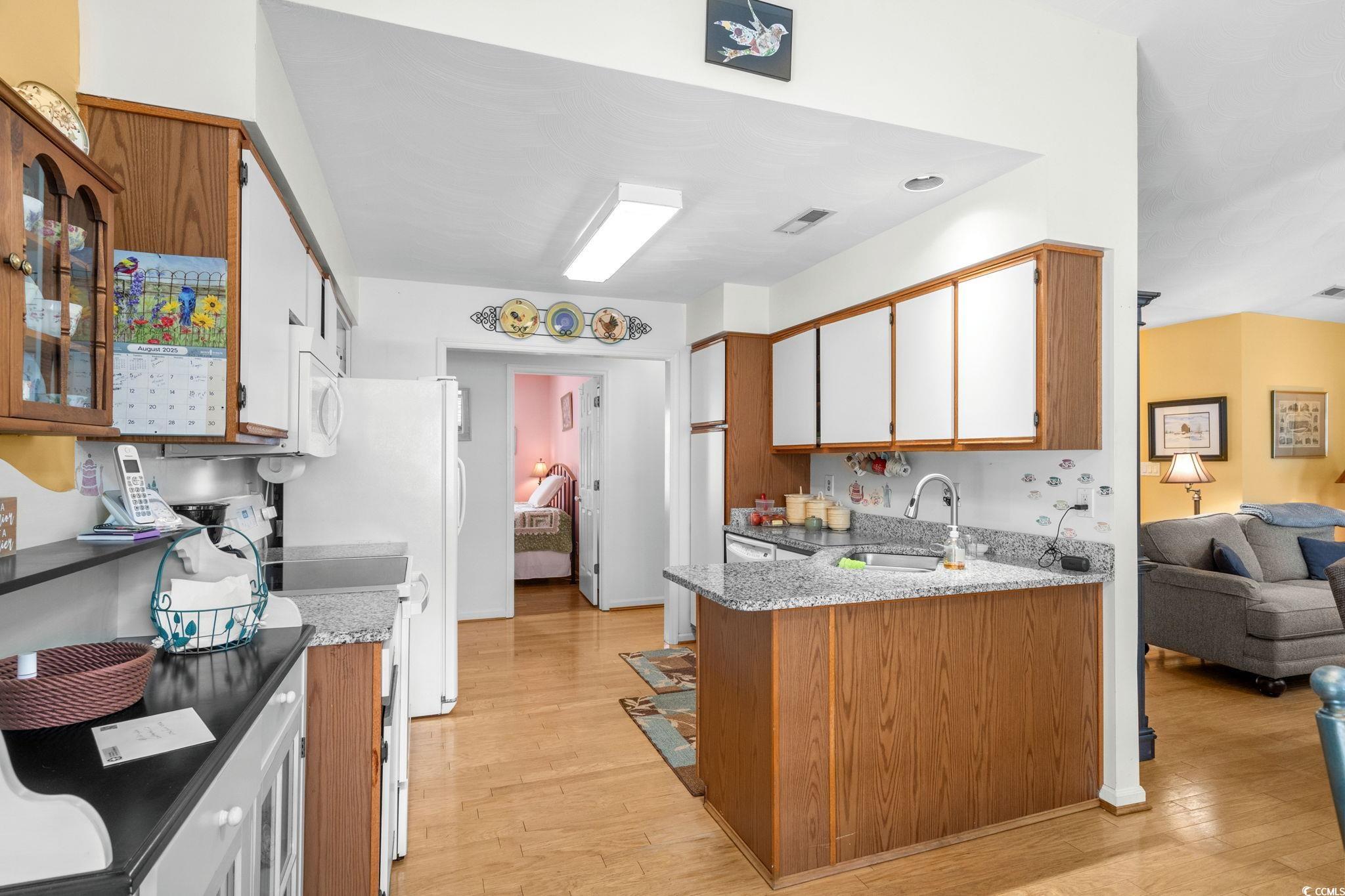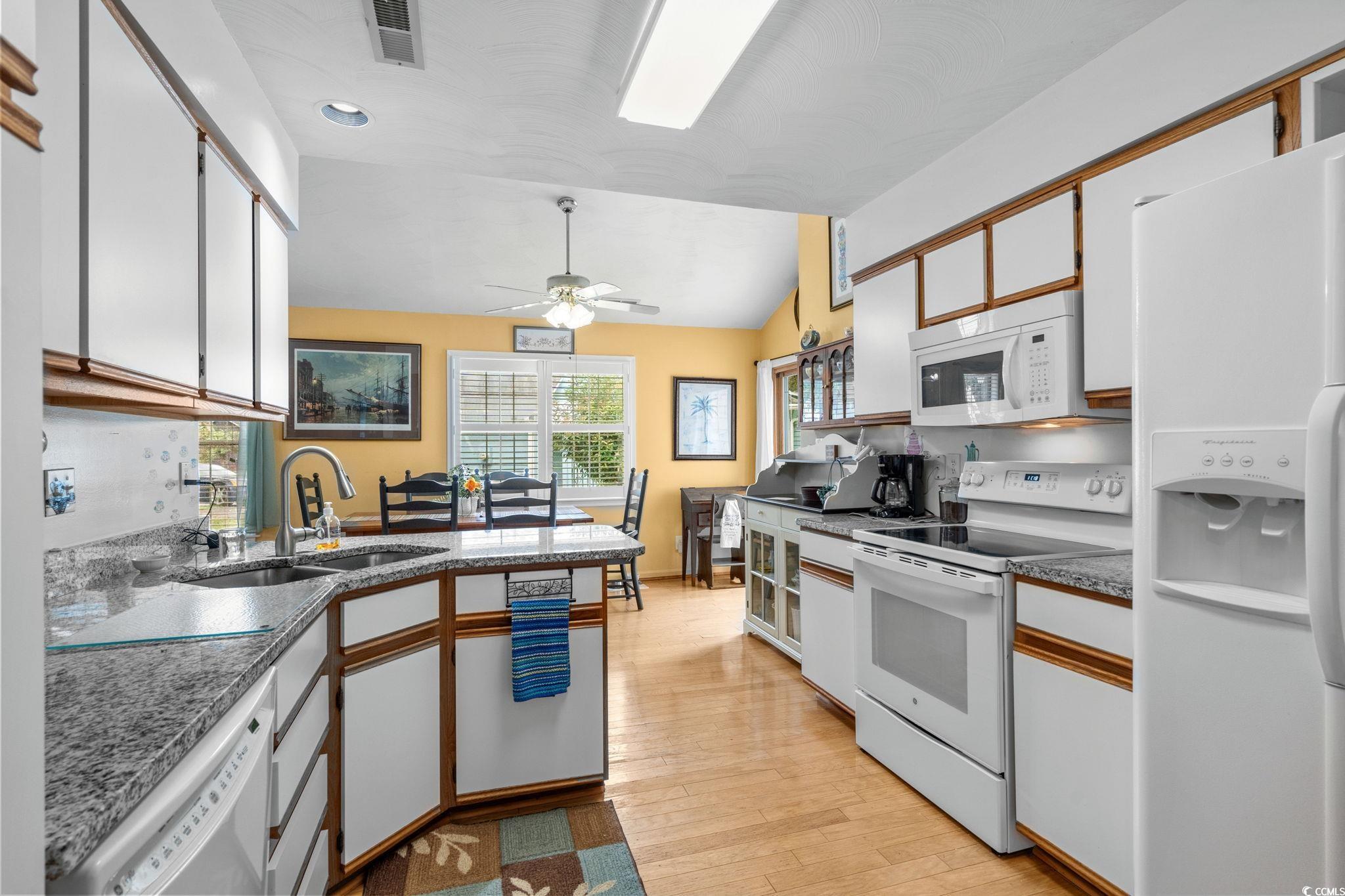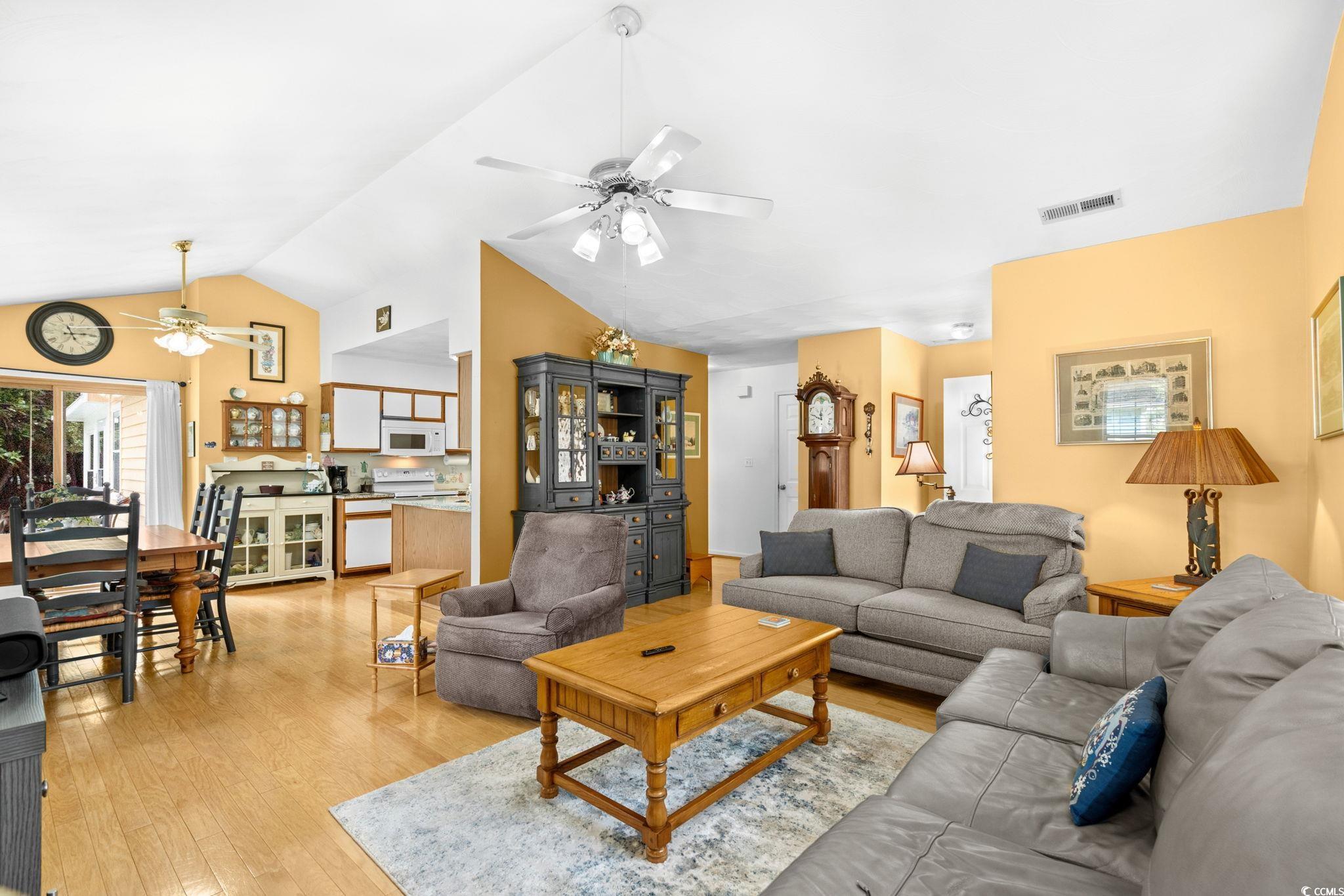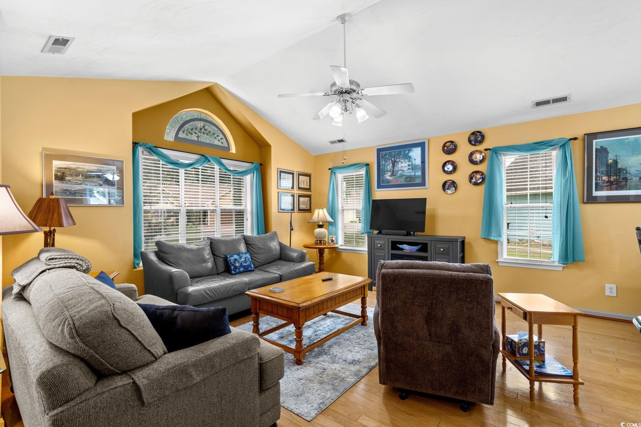 Charming coastal cottage in The Preserve, Little River! This cheerful 3BR/2BA home has a versatile third room that’s perfect as a guest bedroom, home office, or den. A wide driveway and single-car garage welcome you home, while mature trees and a large, green yard create a peaceful setting. Inside, vaulted ceilings and an arched picture window flood the living area with natural light. Easy-care wood flooring carries through the open living/dining space to an efficient kitchen with granite counters, breakfast bar seating, and crisp white appliances. The primary suite features a roomy walk-in closet; a second bedroom and full bath are nearby, plus the flexible third room for whatever you need. Enjoy year-round living in the bright Carolina room overlooking the backyard, then step out to the extended patio—complete with retractable awning—for effortless outdoor dining and grilling. A generous storage shed keeps tools, beach gear, or hobbies neatly tucked away, and the indoor laundry area offers extra shelving and cabinet space. The home also comes with the added bonus that is includes a whole home propane generator! Never worry about having the rigght power to keep things up and running! Tucked on a large lot in an established, tree-lined neighborhood, this home puts you minutes from marinas, golf, waterfront dining, and the beaches of the Grand Strand. Low-maintenance exterior, comfortable layout, and terrific outdoor spaces—everything you want for relaxed coastal living in Little River.