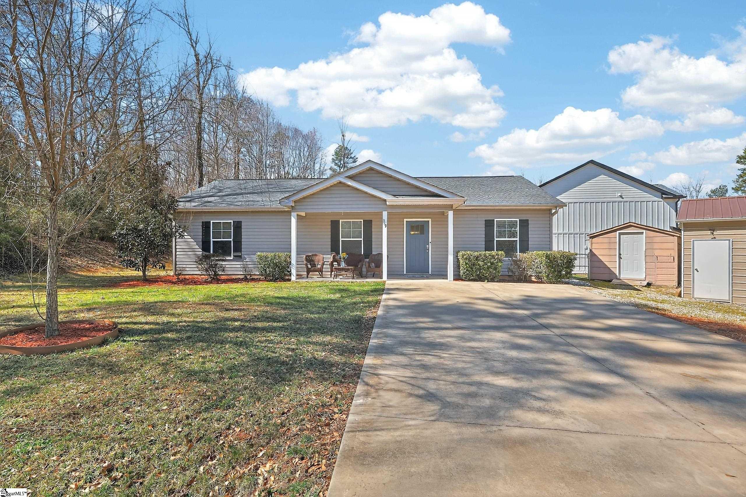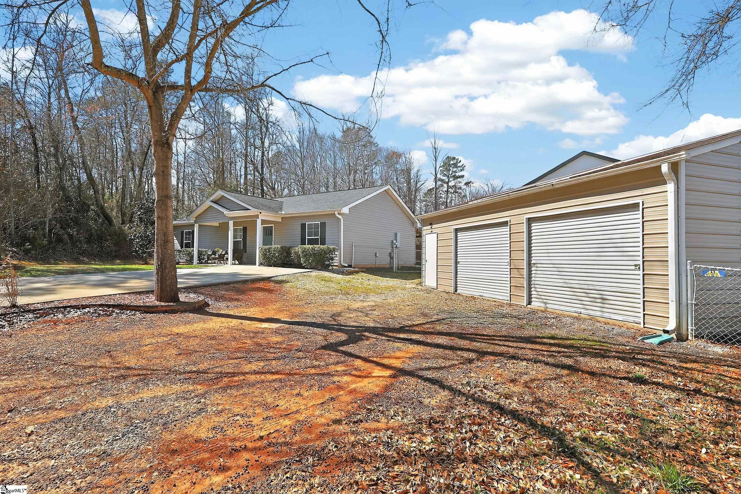 Step into this thoughtfully designed 3 bedroom, 2 bathroom bungalow, perfectly suited for anyone seeking easy, single-level living. The moment you enter, you’ll notice the soaring ceilings and open layout, creating a spacious and welcoming atmosphere that feels both airy and cozy. Imagine preparing meals in the upgraded kitchen, where granite counters shimmer beneath bright lighting and an expansive island invites you to spread out your favorite recipes. The deep stainless-steel sink makes clean-up a breeze, while the pantry’s pull-out shelves keep your groceries organized and accessible. The gas range with convection and air fryer options lets you experiment with delicious meals, and there’s room for a dining table just steps away, so you can chat with guests while cooking or enjoy a quiet breakfast. Both the front and back porches are covered, providing comfortable spots to unwind no matter what the weather. Picture yourself sipping coffee in the morning sun on the front porch, or hosting dinner outside on the back porch as a gentle breeze rustles the leaves. The fenced yard is a haven for pets, letting them roam freely while you watch from your favorite chair. For evenings or gatherings, the open fire deck in the spacious backyard is perfect for roasting marshmallows or sharing stories under the stars. The property includes a massive 2½ stall metal garage with concrete flooring and electric service; ideal for hobbyists, entrepreneurs, or anyone needing extra workspace. The remodeled storage shed has transformed into a comfortable office, complete with insulated walls, carpeting, electricity, and a window air conditioner. Whether you work from home or need a creative retreat, this space adapts to your needs. Enjoy the freedom of no HOA fees and the convenience of being just 15 minutes from downtown Greenville or Travelers Rest, with shopping, dining, and entertainment options nearby. This home presents a blend of modern amenities, inviting spaces, and a peaceful lifestyle, ready for you to make it your own.