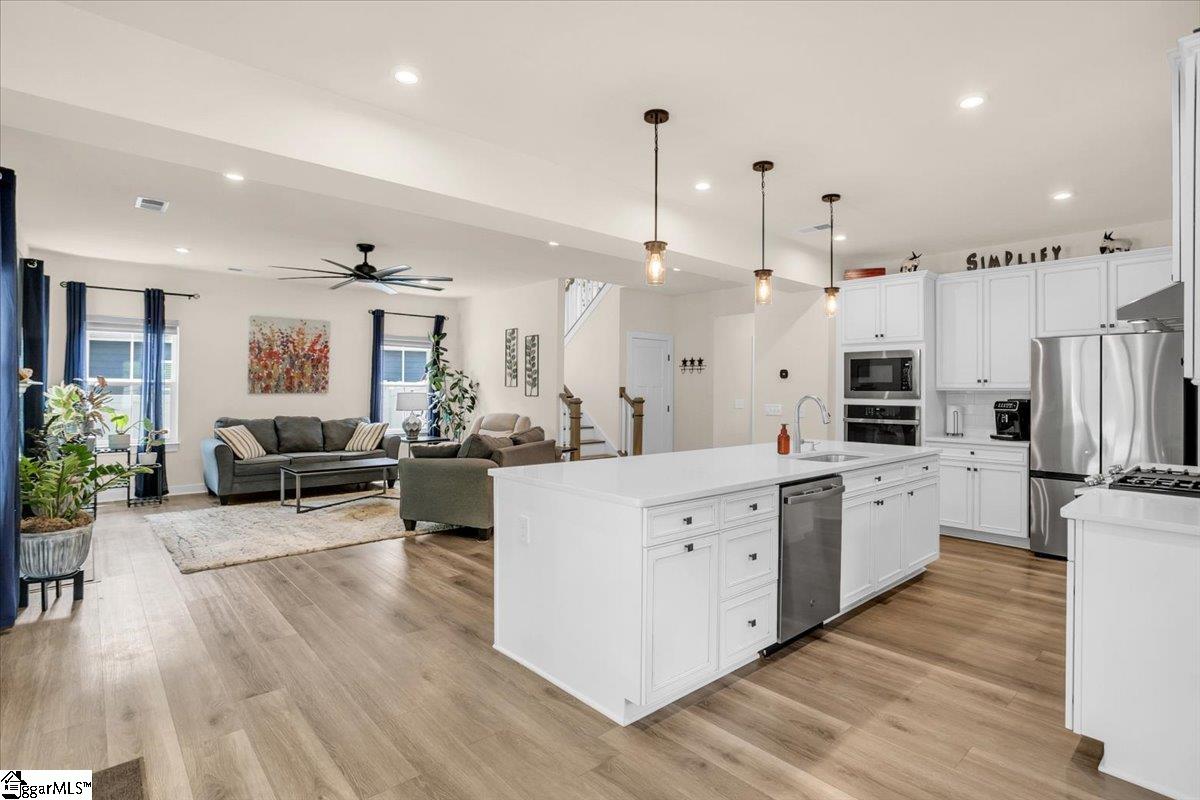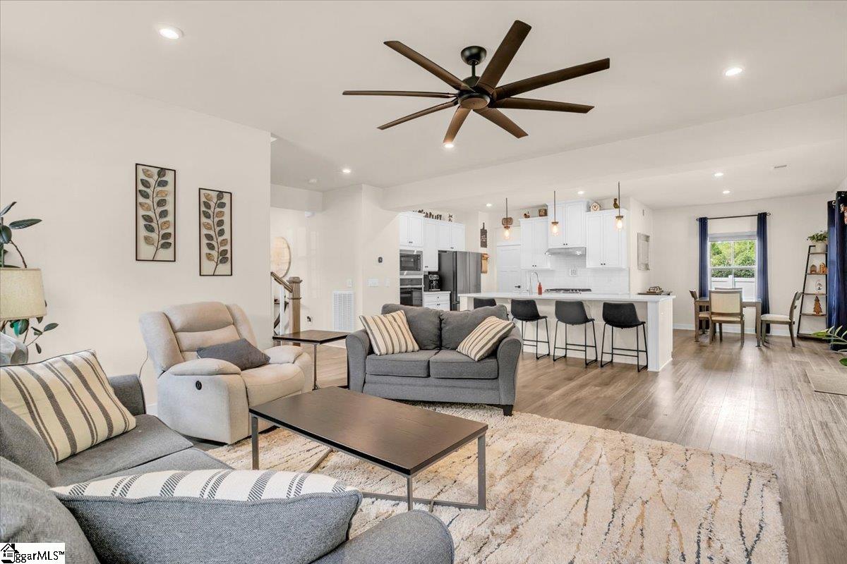 Welcome to Riverstone—where newer construction meets an unbeatable lifestyle in one of the area’s most sought-after communities. This beautifully designed home built in 2023 offers 3 bedrooms, 2.5 baths, plus a dedicated flex/office space and a generously sized loft, giving you the versatility to fit your lifestyle. The main level features wide-plank LVP flooring and hardwood stairs, creating a seamless, polished look throughout. At the heart of the home is an impressive kitchen built for both everyday living and entertainment. Enjoy a massive 10-foot island, quartz countertops, custom tile backsplash, gas cooktop, double ovens, 42" cabinetry, and the rare bonus of two pantries—providing exceptional storage. The kitchen flows effortlessly into the breakfast area and spacious living room, anchored by a beautiful gas log fireplace. A private flex/office with French doors on the main level offers the perfect space for working from home or quiet retreat. Upstairs, you will find all three bedrooms along with a versatile loft area. The primary suite is truly expansive, featuring a closet so large it feels like an additional room. The en-suite bath includes a double vanity and a stunning tiled walk-in shower with dual shower heads and a built-in bench for a spa-like experience. Step outside to enjoy a private, fully fenced backyard with a large, covered patio—perfect for relaxing or entertaining. With no rear neighbors and a peaceful wooded backdrop, this outdoor space offers rare privacy. Riverstone residents enjoy an exceptional amenity package including a pool, tennis and pickleball courts, playground, fitness facility, and scenic walking trails leading to a pavilion and picnic area by the river. All of this in a prime location just minutes from shopping, dining, and convenient access to I-385—offering the perfect blend of tranquility and accessibility.