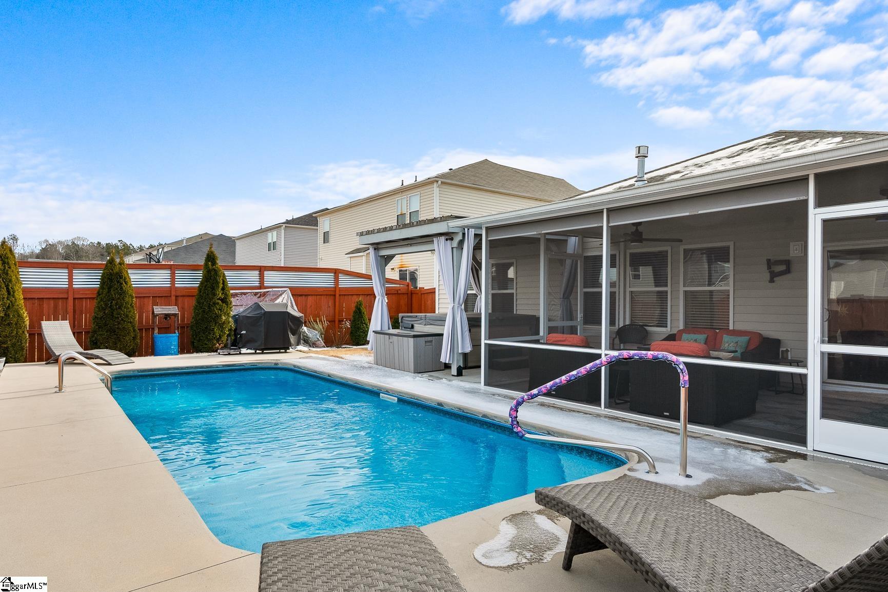 Missing out on this home would be a tough pill to SWALLOW - don't be the last to see this home at 320 Fox Hollow! This nearly new home has already been updated and enhanced since its construction in 2020. Beautifully stamped concrete welcomes you onto the front porch and into this single story home. Two bedrooms and a full bathroom are located at the front of the home, ideal for privacy and a hallway guides you to the open concept living room, kitchen and casual dining area. The large living room is anchored by the gas log fireplace and is adjacent to the kitchen, which features 42" cabinets, large pantry and an island with bar seating. With the kitchen open to the dining room, the space is ideal for hosting meals for gatherings. The entertainment space expands outside to the large, screened porch. With two doors, you can exit the porch from one door and head to the inground pool or exit the other door and head to the hot tub! Complete with a fence, you'll appreciate the privacy you'll experience with your oasis backyard. Back inside, you'll find an oversized primary bedroom with a spa-inspired ensuite - double vanity, tiled walk-in shower and private water closet. This home's builder is known for its energy efficient features: spray foam insulation in the attic for energy savings and better health; Low E windows for an estimated 15% savings in heating/cooling costs; CFL/LED lighting for an estimated cost savings of 75%; fresh-air management system for clean, fresh air circulation; conditioned attic to help seal out particulates, rodents and noise; PEX plumbing, which is more resistant to freeze breakage; Minimum Merv 8 filtration helps minimize indoor particulates. As if this were not enough, this home is located in one of the most perfectly positioned communities in all of the Upstate! This home is located in Anderson county, which has lower property taxes, but is nearly equidistant and just 20 minutes to Anderson OR Greenville! This home is also zoned for the award winning Spearman/Wren schools.