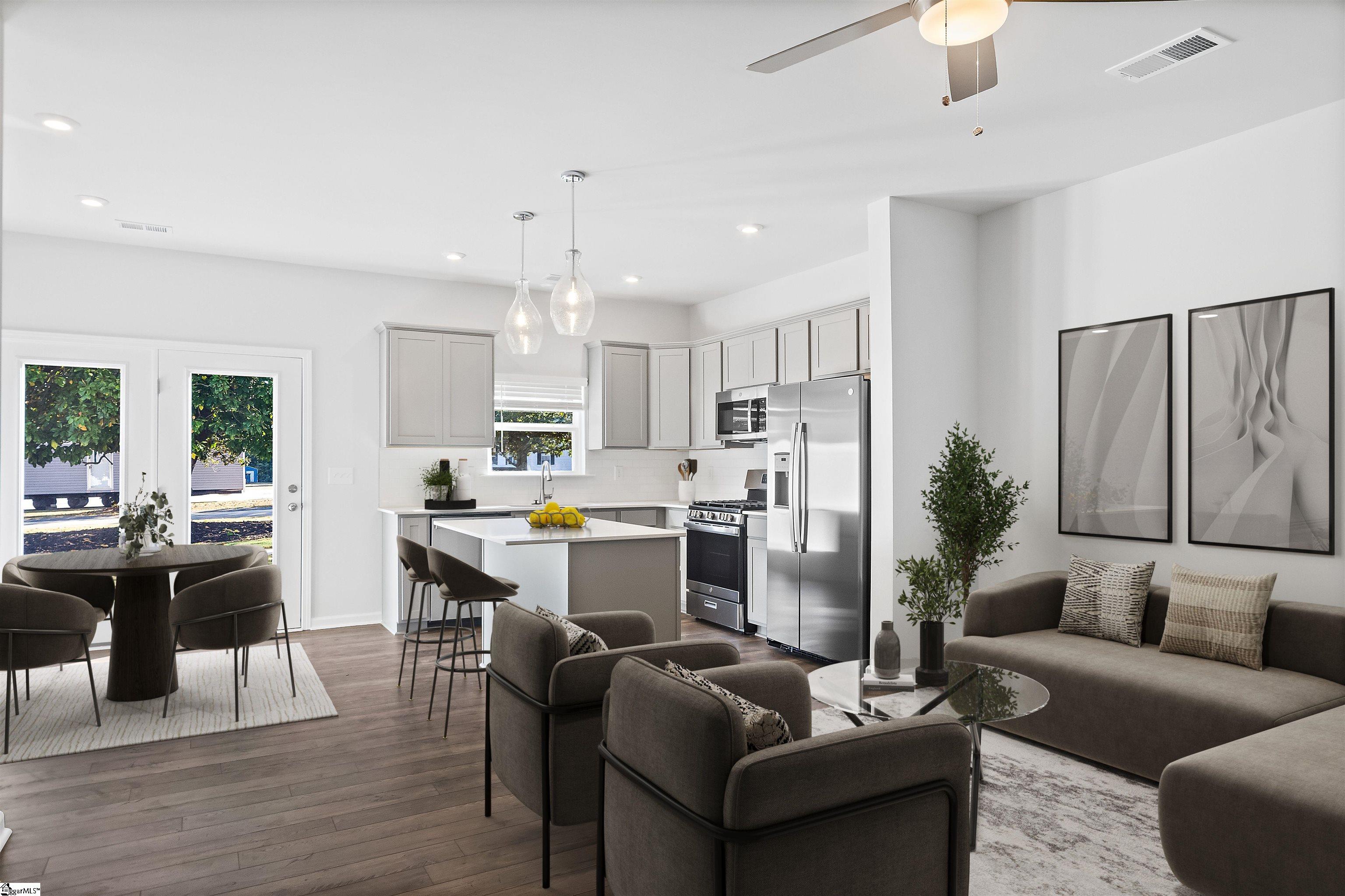Discover Amaris, Mauldin’s newest townhome community where modern living meets unbeatable convenience and charm. Nestled just off Laurens Road and minutes from the vibrant Bridgeway Station, Amaris offers a lifestyle that blends comfort, style, and affordability in perfect harmony. Step into the beautifully crafted Amara floor plan, a spacious 3-bedroom, 2.5-bathroom home with 1,470 square feet of thoughtfully designed space. From the moment you enter, you’ll be greeted by an open-concept main level featuring sleek laminate flooring, elegant oak stairs, and contemporary open railings that elevate the entire aesthetic. The kitchen is a true showstopper, boasting quartz countertops, a stylish tile backsplash, pendant lighting, and premium stainless steel GE appliances—including a gas range, built-in microwave, and side-by-side refrigerator—all surrounded by ample cabinet storage. Upstairs, the primary suite is your personal retreat, complete with a generous walk-in closet and a spa-inspired ensuite featuring a double vanity, tile flooring, and a luxurious 4-foot tile shower. Two additional bedrooms, a shared full bath, and a convenient laundry room round out the second floor, offering space and functionality for every lifestyle. Every home at Amaris is built with energy efficiency in mind, including a tankless gas water heater and high-performance furnace. Exterior upgrades like hardiboard plank siding, a stone water table, and sophisticated two-tone finishes add to the stunning curb appeal. The community’s inviting courtyard, centered around a cozy fire pit, sets the stage for memorable gatherings and relaxed evenings. As a Stanley Martin homeowner, you’ll enjoy the peace of mind that comes with a Builder Warranty and included lawn maintenance—giving you more time to focus on what matters most. Come tour our model home and experience firsthand why Amaris is the place you’ll want to call home. We’re excited to welcome you.