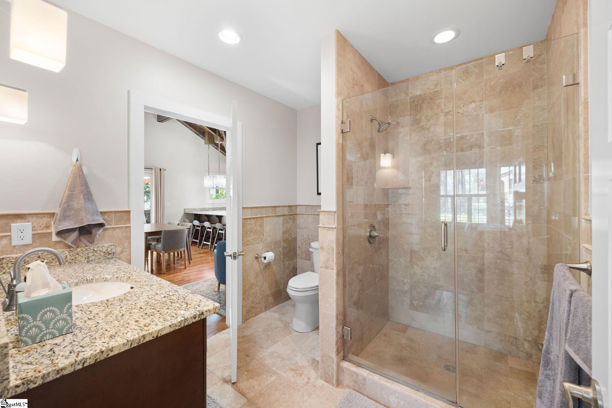 Located in the historic Hampton Pinckney neighborhood, 323 Hampton Ave offers a rare blend of character, walkability, and low-maintenance living, just minutes from downtown Greenville. From here, you're a short walk to North Main Street, the Swamp Rabbit Trail, and Unity Park, making it easy to enjoy some of the city's best restaurants, shops, and outdoor spaces. As part of The Hamptons condo community, the HOA covers all exterior and lawn maintenance, allowing for truly easy ownership. Originally built as a parsonage for Bible Presbyterian Church, this Craftsman-style bungalow is now part of The Hamptons, giving you the feel of a standalone home with the convenience of condominium living. Inside, the main living space is open and inviting, highlighted by vaulted ceilings, exposed beams, and hardwood floors throughout. The living area flows naturally into the dining space and kitchen, creating an easy layout for everyday living or hosting. A ventless gas fireplace anchors the great room, adding warmth and function. The kitchen features extensive custom cabinetry, granite countertops, and stainless appliances, including a gas cooktop with vented hood. There's plenty of workspace and storage, whether you're cooking regularly or entertaining. Both bedrooms are generously sized, each with walk-in closets and simple access to the bathrooms finished in travertine tile. The front bedroom is separated by sliding barn doors, adding flexibility for guests, an office, or additional living space. Toward the back of the home, a bright laundry room provides extra functionality and storage. Step outside to a 38' x 10' deck, ideal for outdoor seating and hosting friends or family. Parking is a standout feature for this location, with a covered, assigned space in the gated rear lot, plus additional off-street parking in the front driveway. There is also attic access and secured storage cabinets for added convenience. Hampton Pinckney is known for its strong sense of community, with neighborhood gatherings and easy access to everything happening downtown. If you've been looking for something with true character, a prime location, and a layout that actually lives well, this one is worth a look.