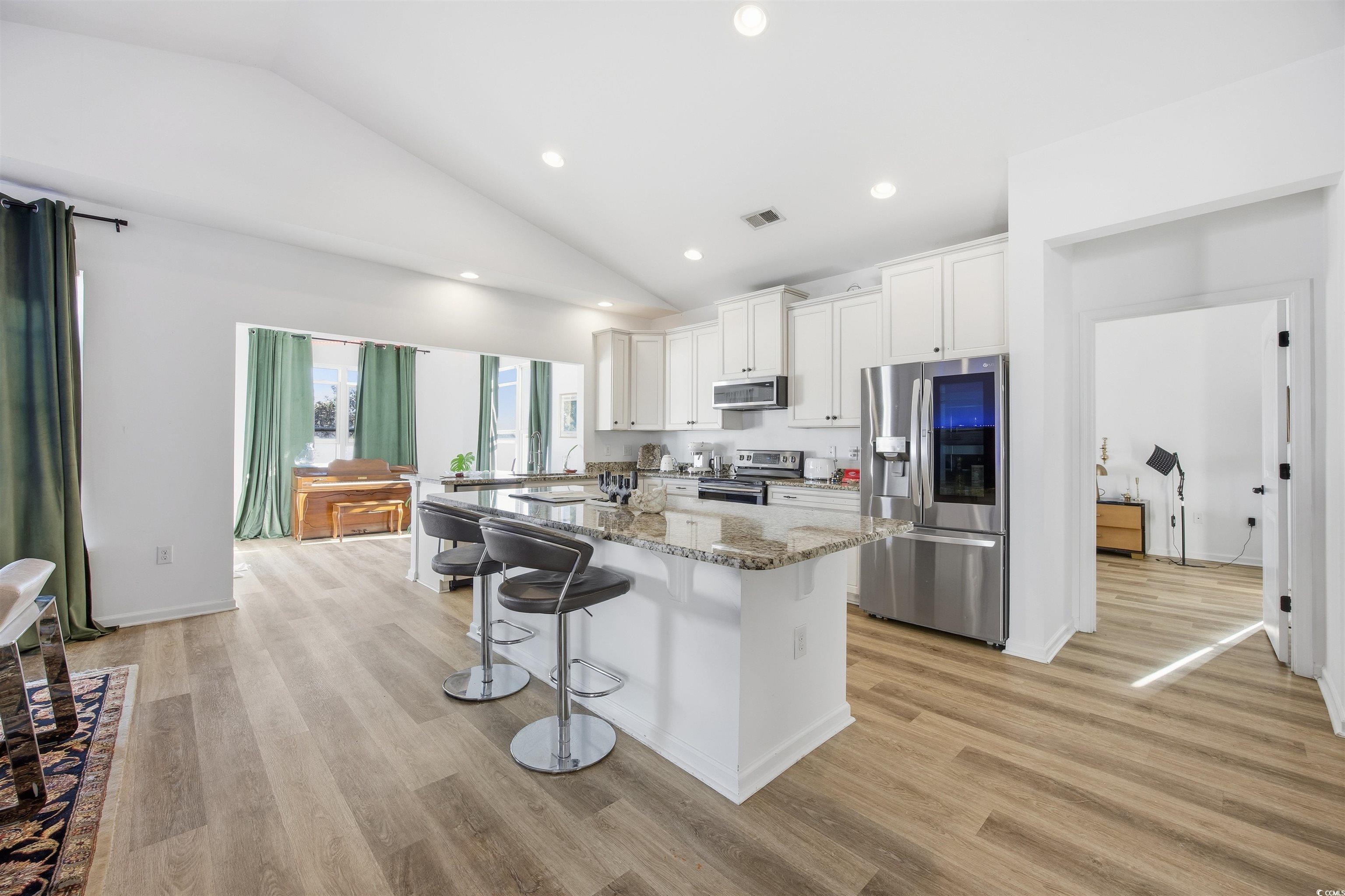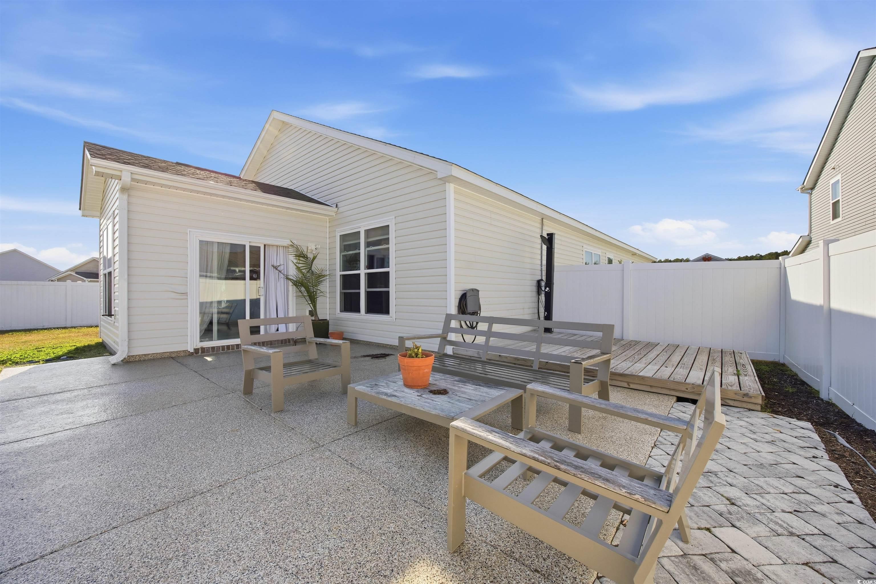 Discover effortless coastal living in this beautifully cared-for 3-bedroom, 2-bath residence in the sought-after Bella Vita community. The open concept design showcases vaulted ceilings, a spacious great room, and a well-appointed kitchen featuring solid-surface countertops, stainless appliances, a center island, and ample storage. The first-floor primary suite offers comfort and privacy with a generous walk-in closet and relaxing ensuite bath. Additional highlights include a split-bedroom layout, upgraded flooring, natural gas utilities, and a finished laundry room. Outdoors, enjoy a peaceful patio and fenced yard ideal for quiet mornings or entertaining. Residents benefit from a clubhouse and community pool, all just minutes from shopping, dining, top schools, and the beaches of Myrtle Beach.