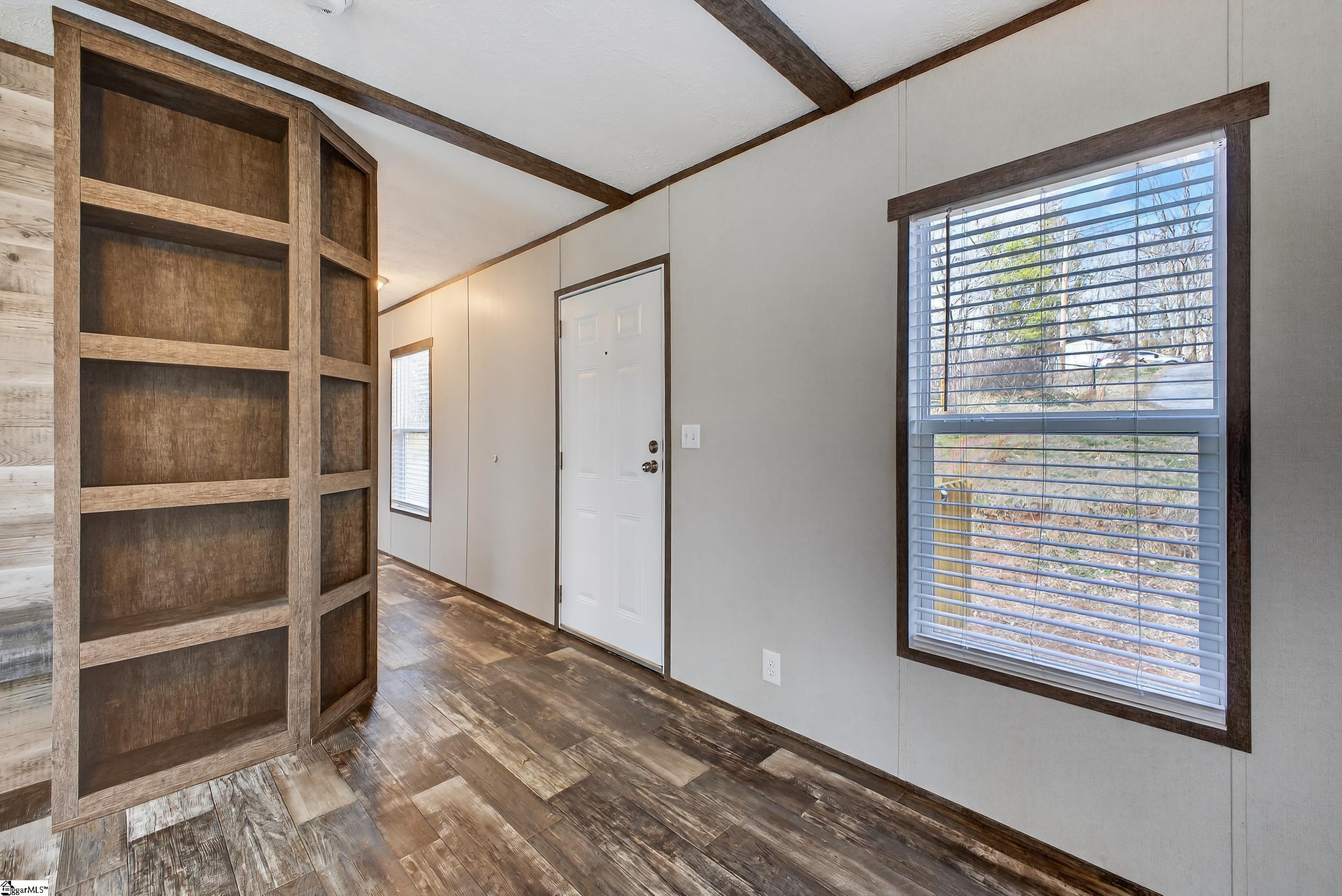 Modern finishes, built-in bookcases, and a private wooded setting along Georges Creek — with no HOA — set this 2021 Clayton “Anniversary 76” (16x76) home apart from the ordinary. Situated on 0.51 acres, this 3-bedroom, 2 full bath home offers an open-concept layout with neutral cool tones and durable wood-look flooring throughout. The spacious living area features decorative ceiling beams and custom built-in shelving, creating both character and functional storage. The kitchen is designed for everyday living with abundant cabinetry, electric range with vent hood, stainless apron-front sink, and a large island overlooking the main living space. Natural light enhances the home’s modern yet comfortable feel. The primary suite is privately positioned on one side of the home and includes a dual vanity, soaking garden tub, separate shower, and walk-in closet. Two additional bedrooms and a full bath are located on the opposite side for added privacy. A walk-in laundry room with washer and dryer provides added convenience. Enjoy both front and back decks overlooking the wooded, sloping lot with seasonal views of Georges Creek. A separate storage building conveys with the property. Custom LeafFilter gutters installed to help direct water flow from the house and prevent seasonal leaf buildup. Also comes with a transferable warranty. Conveniently located just 5 minutes to Hwy 123, 10 minutes to Hwy 153, and approximately 20 minutes to Downtown Greenville, this property offers accessibility while maintaining a peaceful, tucked-away setting — all without restrictive HOA rules. Ideal for homeowners seeking affordable modern living or investors looking for a strong rental opportunity.