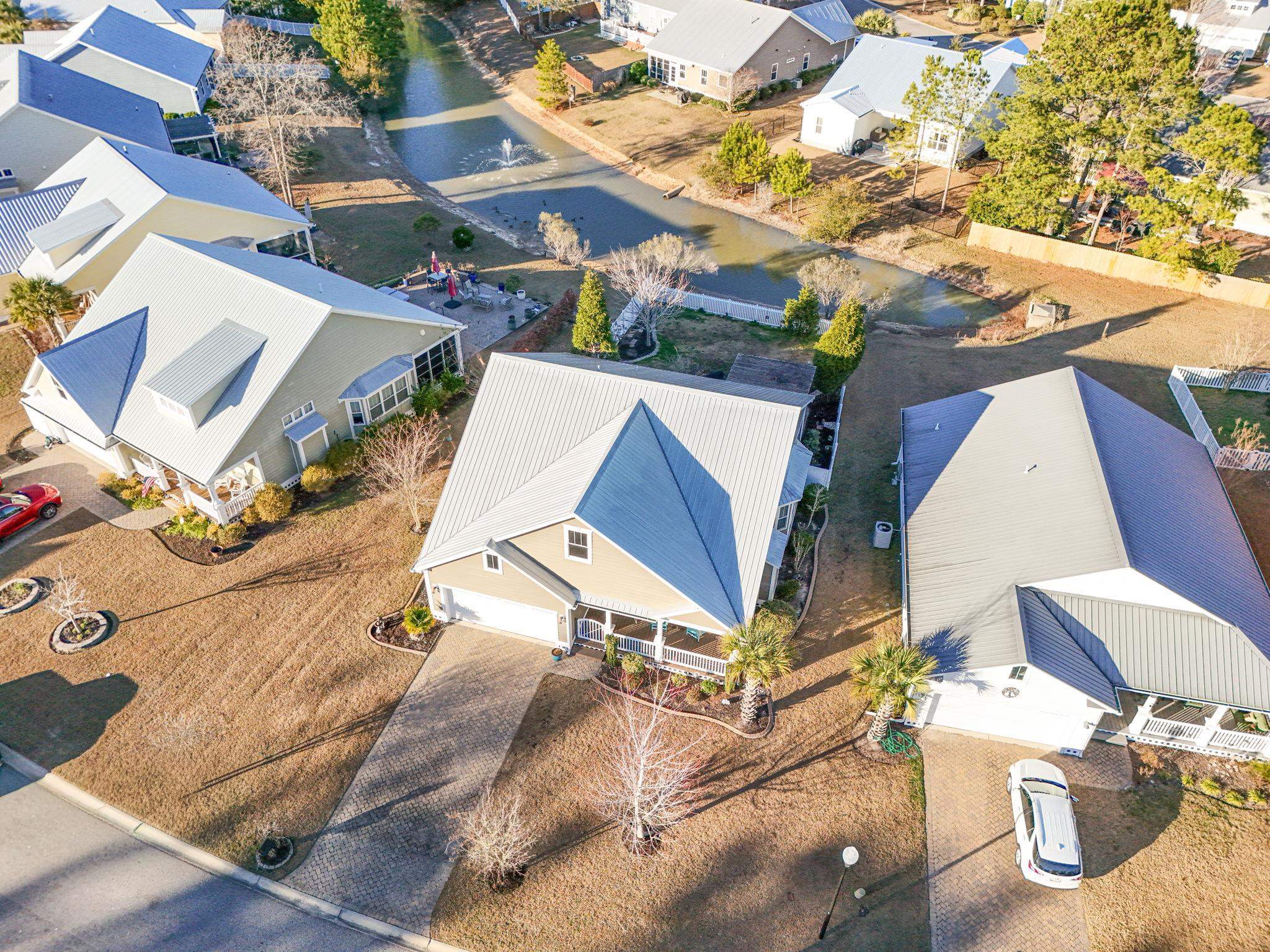 This thoughtfully maintained Lowcountry-style home surprises you with refined finishes, an inviting layout, and a serene pondside setting just minutes from the coast. Offering three bedrooms and two bathrooms, the interior is filled with natural light, elegant moldings, and a warm living room anchored by a natural gas fireplace. The kitchen feels both polished and functional with freshly painted cabinetry in curated designer tones, updated backsplash, and brushed nickel blown-glass pendant lighting, while all kitchen and laundry appliances convey for added convenience. An EZ Breeze room expands the living space, adding a comfortable, light-filled room designed to be enjoyed throughout the seasons while overlooking the pond and fountain. The backyard is a standout feature with lush landscaping, shade trees, flowering perennials, vinyl fencing, and peaceful water views. Outside, the home continues to impress with Hardie board siding, sleek metal roofing, and a paver driveway that adds durability and a sophisticated touch. A solid cedar pergola, extended brick patio, freshly painted rear steps, and ornamental walking bridge enhance both form and function, while the front deck has been refreshed with new paint and a brand-new gate. Additional highlights include a luxury trim package, updated ceiling fans, glass shower door, storm door, Rain Bird irrigation system. Curbscape edging adds a finished look to the landscape, all set within a natural gas community that blends Lowcountry character with modern comfort all while being minutes to the coast.