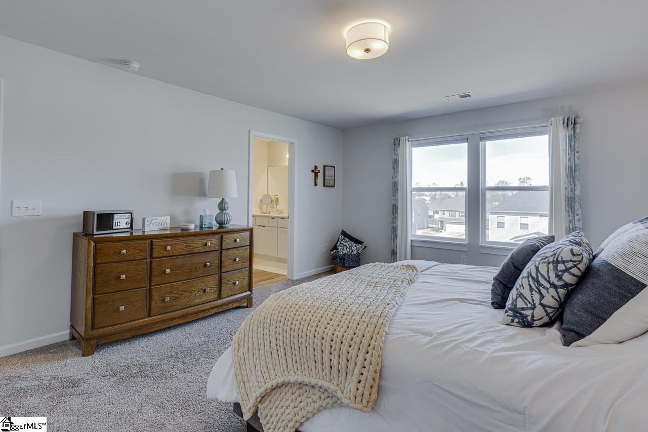 Move-in ready and thoughtfully designed, this two-story home has a layout that feels both warm and open. As you drive up for the first time, you will notice the tidy landscaping and the inviting front porch. When you step inside, just off the foyer, you will find a flexible room to the left which provides the perfect spot for a home office, den, dining room, or creative space to suit your lifestyle. The main living area opens up beautifully, where the living room, dining area, and kitchen come together in a bright, inviting setting, all enhanced by durable and stylish Almond Oak LVP flooring throughout the first floor. A gas log fireplace with a classic mantle anchors the living room, providing a cozy spot to read a book or watch your favorite shows. The kitchen truly shines, featuring striking black and white granite countertops, crisp white shaker cabinetry, stainless steel appliances, and a breakfast bar for casual seating. Two pantries, one walk-in and one closet-style, offer exceptional storage and keep everything within easy reach. A half bath, under-stair storage, coat closet, and two-car attached garage complete the main level. Upstairs, a spacious loft creates an additional living area that works perfectly as a home theater, second living room, or just a quiet retreat. All three bedrooms can be found on this level, ensuring peace and quite away from the bustle of the main floor. The generously sized primary suite includes a well-appointed ensuite bathroom with a double sink vanity, walk-in shower with glass doors, and an impressive walk-in closet. The two secondary bedrooms are comfortably sized and thoughtfully arranged both with a walk-in closet, and the hall bathroom features a convenient tub/shower combo. Outside, you will find the screened porch which is ideal for relaxing evenings, along with an extended patio ready for grilling and gathering. The fenced backyard adds an extra layer of privacy and usability. Beyond the home, the community includes a range of amenities designed for both relaxation and activity, including athletic facilities, a playground, firepit, sidewalks through out the neighborhood , and two pools, giving you plenty of ways to enjoy your surroundings year-round. Convenient to amenities on Fork Shoals Road, including the new Publix grocery store, and just minutes from the heart of Simpsonville, Mauldin, and Greenville. Don't miss out on your chance to tour this charming abode. Schedule your showing today!