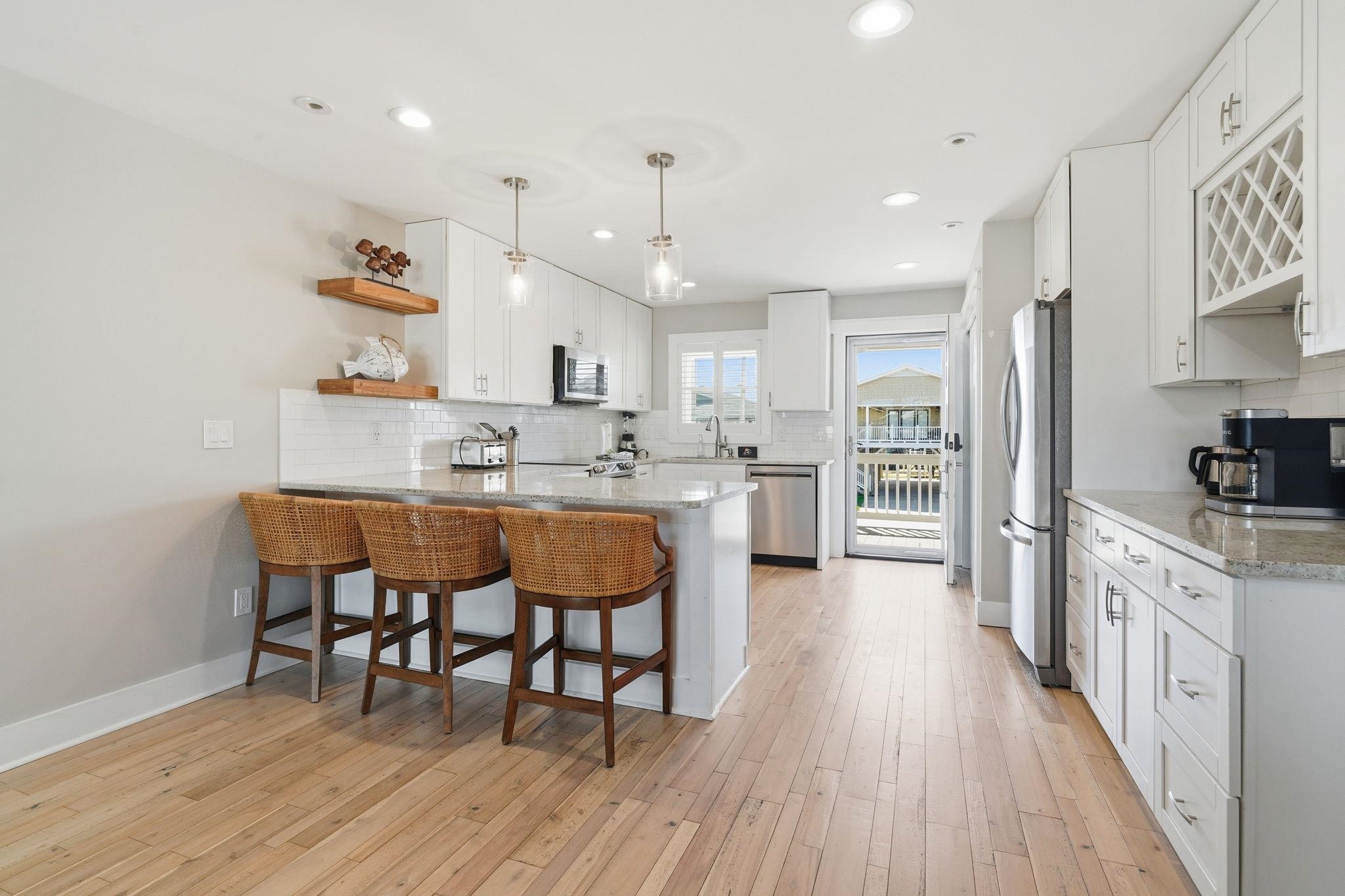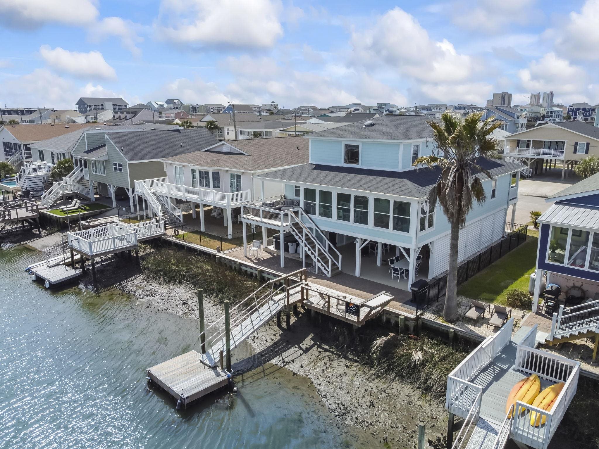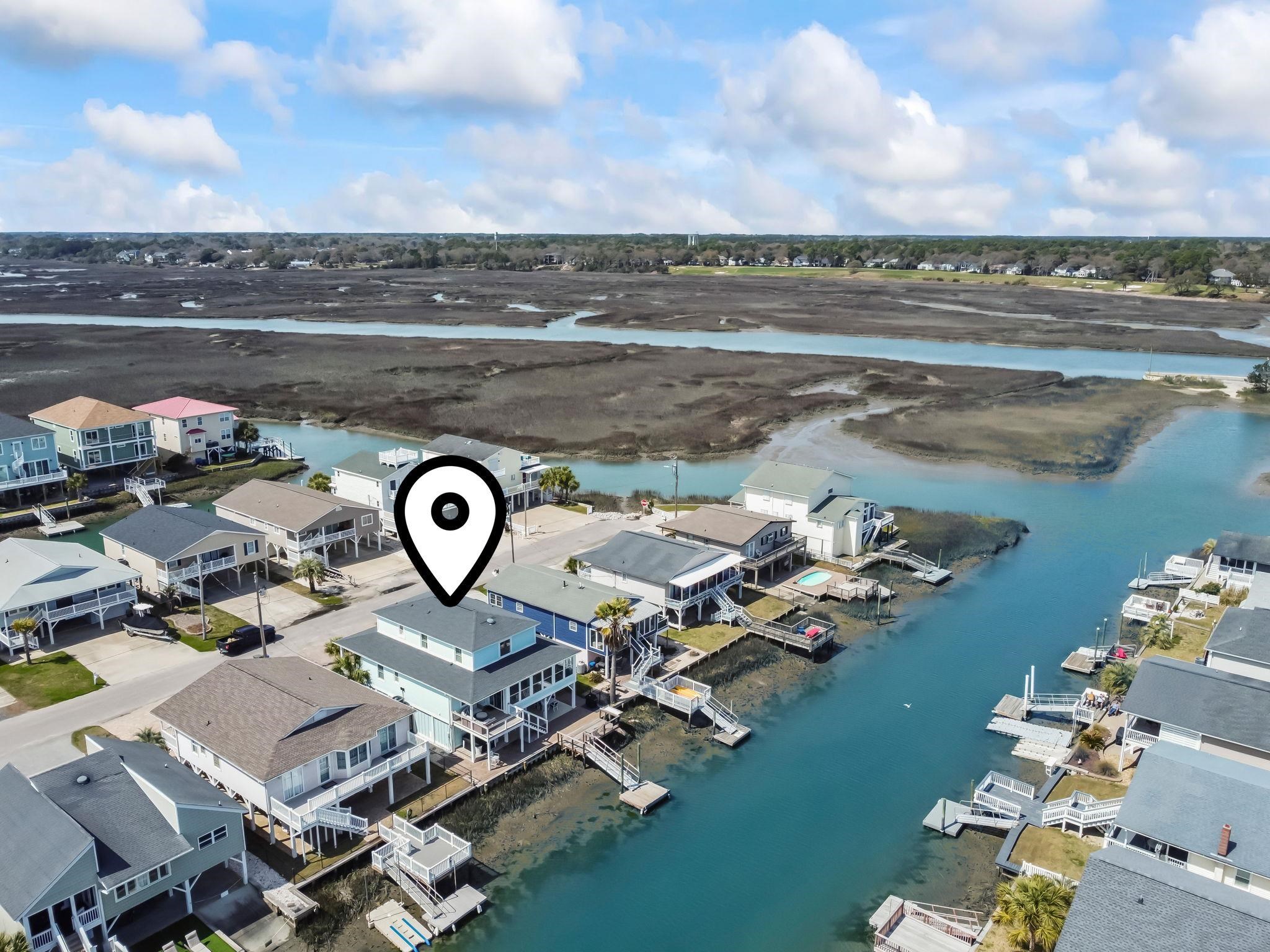 Experience the pinnacle of coastal living in this impeccably renovated 4-bedroom, 3.5-bath channel home in the heart of Cherry Grove. Reimagined from the studs up between late 2018 and 2019, this residence offers the rare peace of mind that comes with having all heated living space situated safely above the flood zone. Inside you'll find authentic hardwood floors, tongue-and-groove ceilings, and a modern aesthetic defined by contemporary cable railings and designer lighting. The chef’s kitchen is a focal point of the main level, featuring granite countertops, a classic subway tile backsplash, and custom cabinetry. Three of the four spacious bedrooms boast walk-in closets, while the bathrooms offer fully tiled showers and updated plumbing fixtures throughout. The renovation included a new seawall and a large oversized paver patio which you don't see often in Cherry Grove. The exterior features a new fence installed in 2023, a custom outdoor shower with composite decking, and professional stone landscaping. For those who need extra utility, the ground level provides a massive two-section workshop with built-in shelving and an additional finished storage room equipped with quartz countertops, sink, and a refrigerator. The perfect property for a Primary Residence, Home at the Beach, or a high-income producing Rental property, it is truly a gem in Cherry Grove with nothing quite like it!