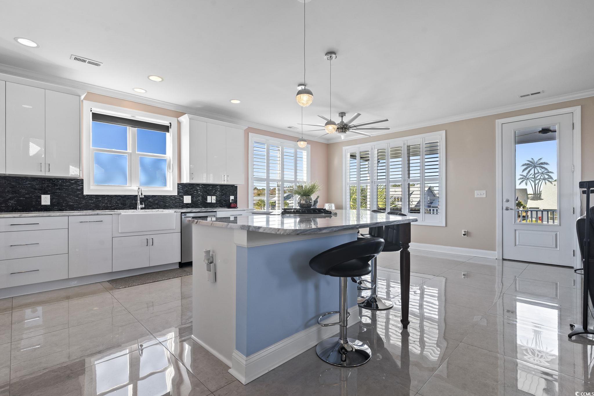 Welcome to 338 Harbour View Drive, a custom-built, thoughtfully designed Charleston-style raised beach house that offers unparalleled luxury, value, comfort and location. This 3-story home boasts 4 bedrooms, 4.5 bathrooms and 3,134 heated square feet with every detail meticulously chosen. Nestled within the gated luxury intracoastal waterway community - Boardwalk on the Waterway - this one-of-a-kind residence offers a blend of sleek modern luxury design & clean smooth minimalism that’s accentuated by a floorplan that takes full advantage of the 3,780 total square footage. From front to back, the numerous windows adorned with custom plantation style shutters allow natural light to flow throughout and illuminate the floorplan. Interior highlights on the main floor include a gourmet kitchen with sleek high-gloss white imported cabinets from Holland with premium soft closes, black crushed glass tile backsplash, marble swirled granite, a belfast sink, pendant lighting above breakfast bar and stainless steel appliances including a dual fuel downdraft gas range, and an instaview fingerprint free smart fridge that provides the kitchen an added touch of sophistication and luxury. The 30 x 30 oversized high-gloss luxury tile accentuates, reflects, and carries the flow of natural light throughout the floorplan. The main level also features a convenient half bathroom off hallway, a formal dining room with coffered ceiling, the 4th bedroom (which can also be used as an office/den) and an oversized family room with 72” ceiling fans, an electric fireplace and incredible views. Upgraded lighting throughout the house including crystal chandeliers in the entryway foyer/dining room and a show stopping Ethan Allen chandelier light in the staircase leading up to the 3rd floor. The ground floor is set up with the functionality to be a separate living space/mother-in-law suite if desired. It consists of its own laundry room with utility sink, an oversized bonus room/bedroom that passes through to a kitchenette area and a full bathroom with walk-in shower - both convenient and practical as the two patio sliding doors each lead out to the cooling pool deck. Kitchenette features white cabinets, stainless steel sink, marble swirled granite, tile backsplash & a beverage cooler. Third floor offers 3 beds/3 baths total including an oversized master suite with tray ceiling, 60” ceiling fan, and dual walk-in closets. The luxury bath en-suite offers a one-of-a-kind walk through spa shower, oversized 30 x 30 high-gloss tile flooring, and dual raised sinks. Second laundry room off the hallway with Maytag washer/dryer set, cabinet storage, & additional large linen closet opposite laundry room door. This premium second row lot overlooks the community pond and is directly across from the intracoastal waterway & boating paradise. The black wrought iron fenced-in backyard has 3 gate entries and showcases a heated, cooled, and lit saltwater pool with cooling deck. Privacy hedge landscaping on each side of the lot, palm trees, and crushed rock accents create an exterior paradise that can be enjoyed from multiple outdoor living spaces - including a ground level patio, second floor wood deck, and a front covered trex porch. Rear light comes on from dusk until dawn - illuminating the backyard and pool and creating an incredibly relaxing serene ambiance. Other features of note include: HardiPlank siding, 2-car finished garage with epoxy floor, Rainbird irrigation system, gutters, front motion activated security light, 3 HVACs, tankless gas water heater, and a 17 solar panel system that efficiently maximizes your energy consumption while lowering your monthly expense. Community amenities include a boat ramp, boat storage, community day dock, and a picturesque boardwalk along the waterway. Centrally located between Hwy 501 & Hwy 17, you are near minutes away from MB Airport, Coastal Grand Mall, Market Commons, Carolina Forest, and the Beach!