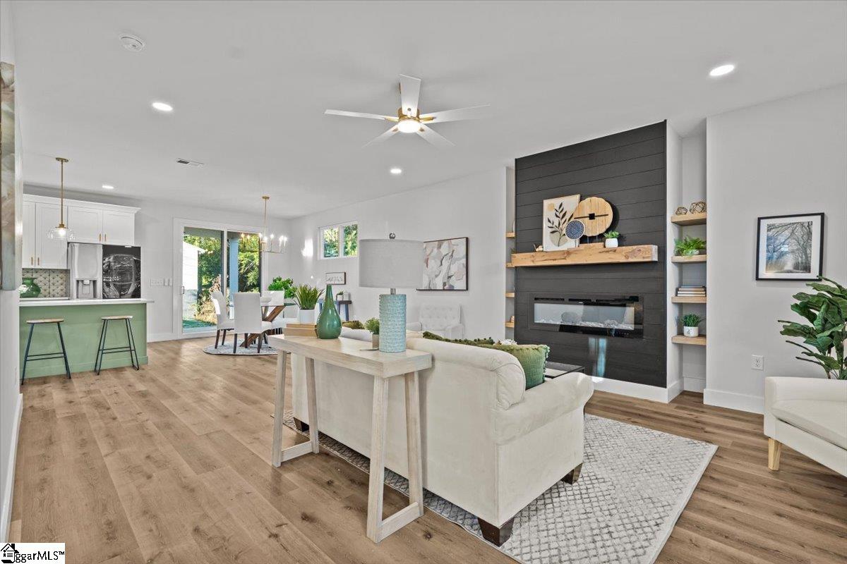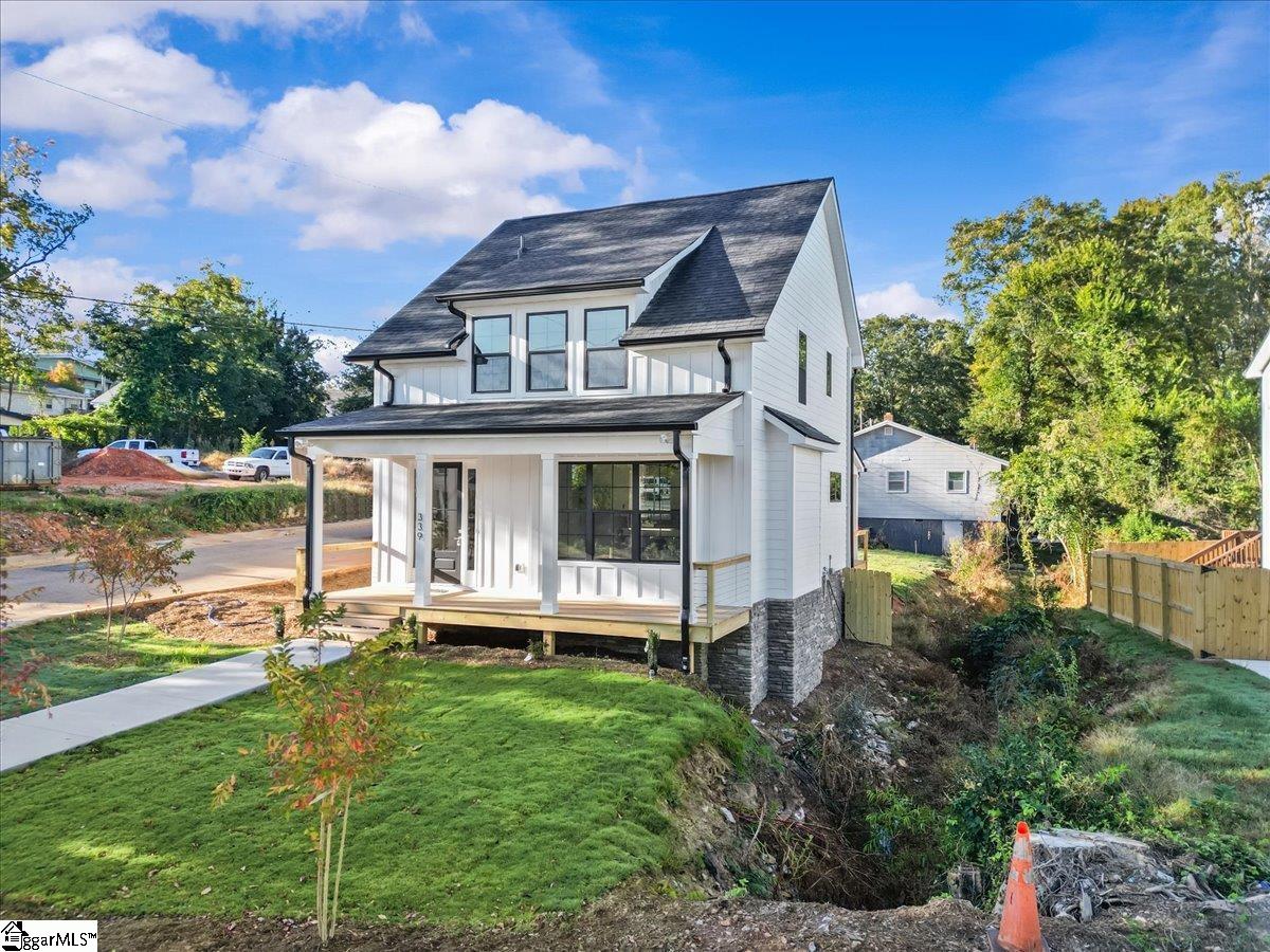 This brand-new home blends modern design with southern charm. The bright open floor plan includes a spacious living area with a sleek black shiplap fireplace, wide-plank floors, and plenty of natural light. The kitchen features quartz countertops, two-tone cabinetry in white and sage green, gold fixtures, a large island with seating, and stainless-steel appliances—perfect for cooking and entertaining. Upstairs, the owner’s suite offers vaulted ceilings, a roomy walk-in closet, and a luxury bath with dual vanities and a fully tiled walk-in shower. Two additional bedrooms share a stylish hall bath. Enjoy covered porches in the front and back, a newly sodded yard, and a location just minutes from Downtown Greenville, Unity Park, and the Swamp Rabbit Trail. Move-in ready and built for comfort, convenience, and style—welcome home to 339 Gower Street.