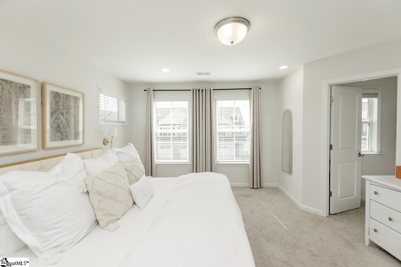 Don't miss the opportunity to own this attractive end-unit townhome in Saddlebrook Farm, a community featuring single family homes and townhomes. The neighborhood boasts sidewalks, a community stocked fishing pond and a recreational path encircling the pond. This townhome, built in 2022, offers an impressive array of special features and upgrades, including 9 ft smooth ceilings, open living space, a kitchen with stainless appliances, staggered 42 inch birch cabinets with crown molding, a gas oven, counters topped with marble and a breakfast bar with seating. The primary bath showcases a large tiled shower, dual sinks paired with elevated vanity and tile flooring. Both baths have quartz counter-tops. Other features include architectural shingles, energy saving gas furnace, tankless gas water heater, low-e windows, a radiant barrier in the attic, James Hardi fiber-cement siding and a screened back porch with storage closet. A 1-car garage and an extra parking pad creates space for 2 cars. All in a great location convenient to downtown Greer, Greenville and Spartanburg, SC as well as the GSP International airport, BMW, Pelham Medical Center and many shopping and dining venues. Zoned for Woodland Elem, Riverside Middle & Riverside High; one of the areas top school districts. Move in ready!