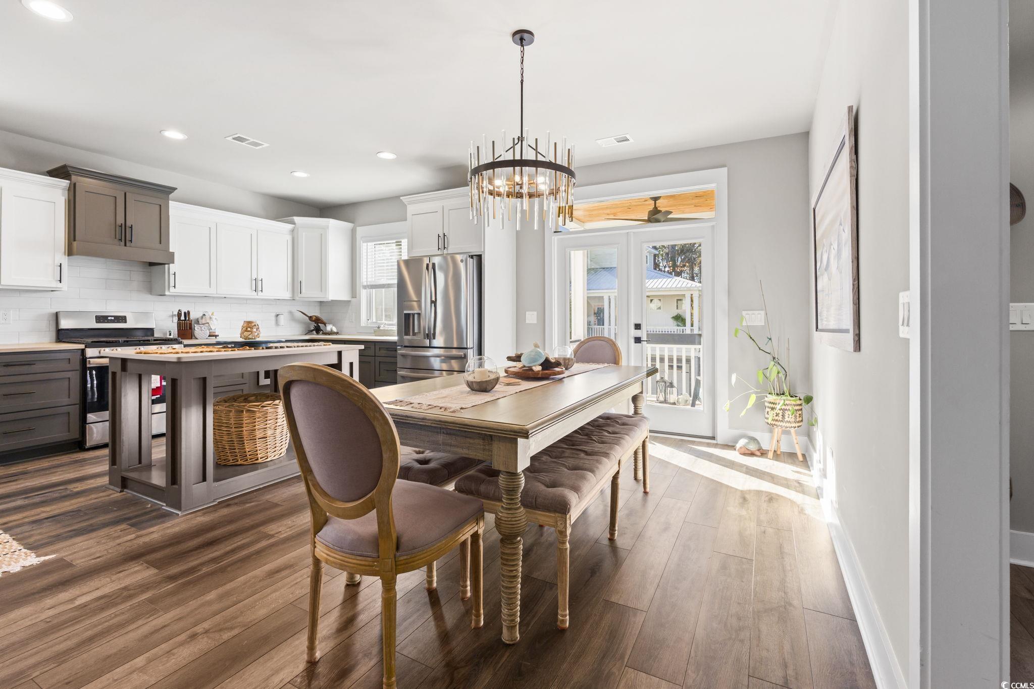 Welcome to 34 Hammock Trail in Pawleys Island, South Carolina, a beautifully designed furnished 3-bedroom, 2.5-bath raised beach home located in the desirable Marshland Park. This coastal home offers modern finishes, durable construction, and low-maintenance living just minutes from Pawleys Island beaches, nearby marsh views, championship golf courses, Brookgreen Gardens, and Huntington Beach State Park. Built with Hardie plank siding and a standing-seam metal roof, the home blends classic Lowcountry style with long-lasting materials ideal for coastal living. The open main living level features luxury vinyl plank flooring and custom cabinetry, creating a bright and inviting space for everyday living and entertaining. The furnished interior allows for a seamless move-in experience, with the kitchen flowing effortlessly into the dining and living areas filled with natural light. Upstairs, the primary suite offers a private retreat with a spa-style bathroom and direct access to a private outdoor balcony, perfect for enjoying morning coffee or coastal breezes. Two additional bedrooms provide flexible space for guests, family, or a home office. The home is already roughed in for a future elevator and includes a tankless water heater for added efficiency and convenience. On the ground level, a covered outdoor area provides the perfect place to relax after a day at the beach or host friends, with parking and storage designed specifically for coastal lifestyles. Marshland Park's prime Pawleys Island location offers easy access to local dining, boutiques, and Highway 17 while maintaining a peaceful Lowcountry setting. The HOA includes lawn maintenance and trash pickup, making this furnished raised beach home ideal as a primary residence, second home, or coastal retreat.