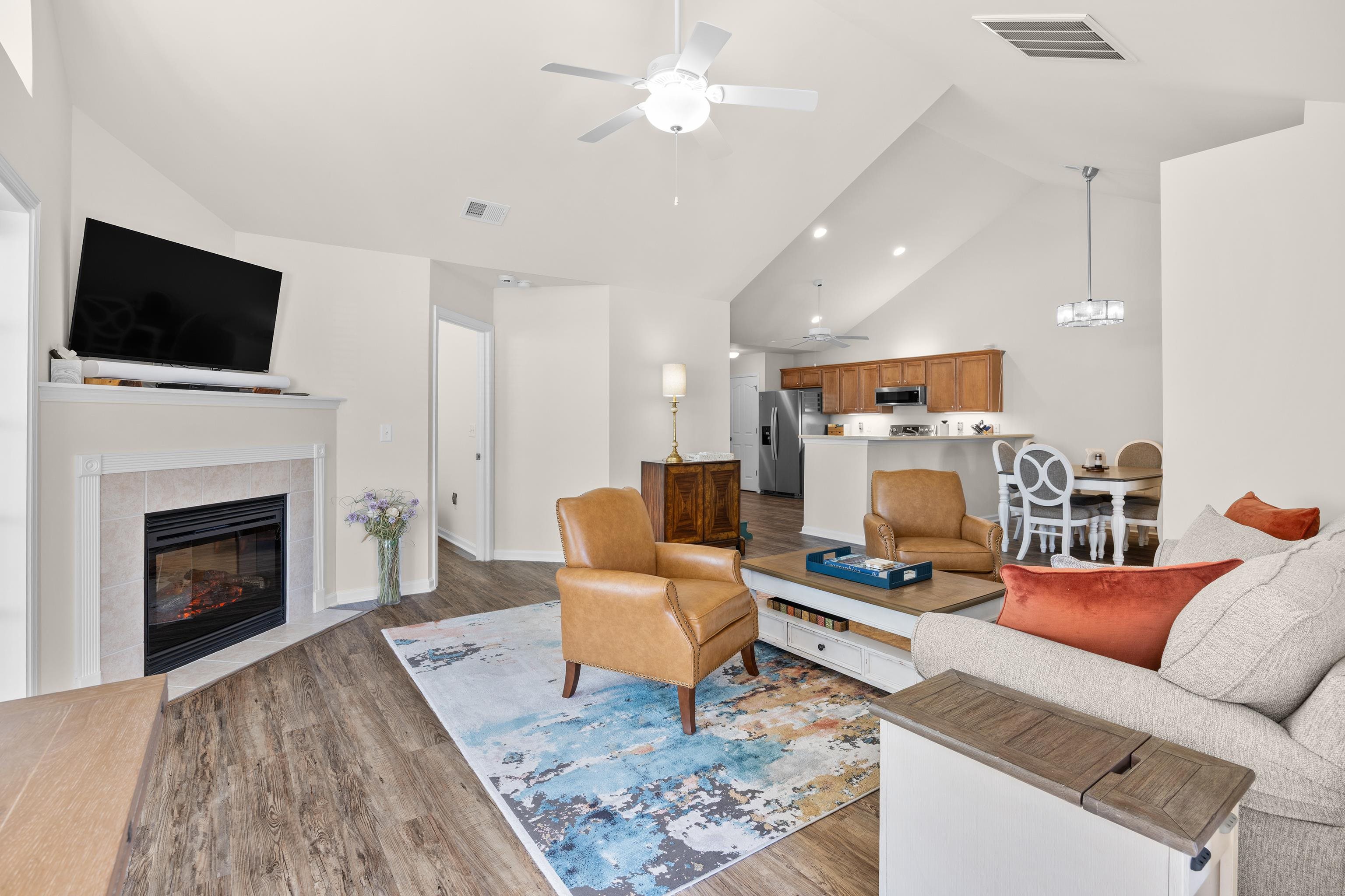 This single-level condominium is situated in the sought-after Stone Gate community within Prince Creek, Murrells Inlet. The residence offers over 1,700 square feet of heated living space. It features two generously sized bedrooms, two full bathrooms, a living room/dining room/kitchen with vaulted ceilings, and a Carolina Room that benefits from abundant natural light. Ample storage is available throughout the home. Some upgrades include an HVAC system equipped with a Blue Light filtration system and an ECCOB Wi-Fi Thermostat, stainless steel appliances, a washer and dryer, a water heater, a garage door and trim, and an electric fireplace conversion featuring a built-in heatilator. The entire unit received a fresh coat of paint in fall 2025 to complement the attractive LVP flooring that is throughout the condo. Both bathrooms are appointed with glass sliding door showers, vanities, and new high-rise toilets. Each bedroom contains a walk-in closet and enhanced natural lighting through palladium windows with window coverings. The garage is equipped with a Wi-Fi-enabled opener and keyless entry pad, as well as hanging cage storage and pull-down stairs for attic access. The laundry room includes shelving above the washer and dryer, a utility sink, and a mirrored ironing board cabinet. The kitchen provides ample cabinetry and countertop space suitable for meal preparation and entertainment, and has been upgraded with both under-cabinet and above-cabinet lighting. The dining area seamlessly connects to the kitchen and living room, creating an open layout that is ideal for gatherings. Two wall-mounted televisions are included with the sale. The Stone Gate monthly HOA fee encompasses water, sewer, trash collection, pest control, basic cable, internet, common area maintenance, off-site management, access to the outdoor pool, and a clubhouse with gym facilities. Building insurance is invoiced separately by the HOA and is currently covered through April 2026. Stone Gate offers convenient proximity to Publix, Lowe’s, CVS, Wal-Mart Market Store, The Marsh Walk, Tidelands Hospital, a variety of dining options, and medical centers. Amenities are easily accessible by walking or golf cart, and the community is pet-friendly. Come and tour this beautiful condo. There is nothing you need to do, unpack and start living the coastal lifestyle today!