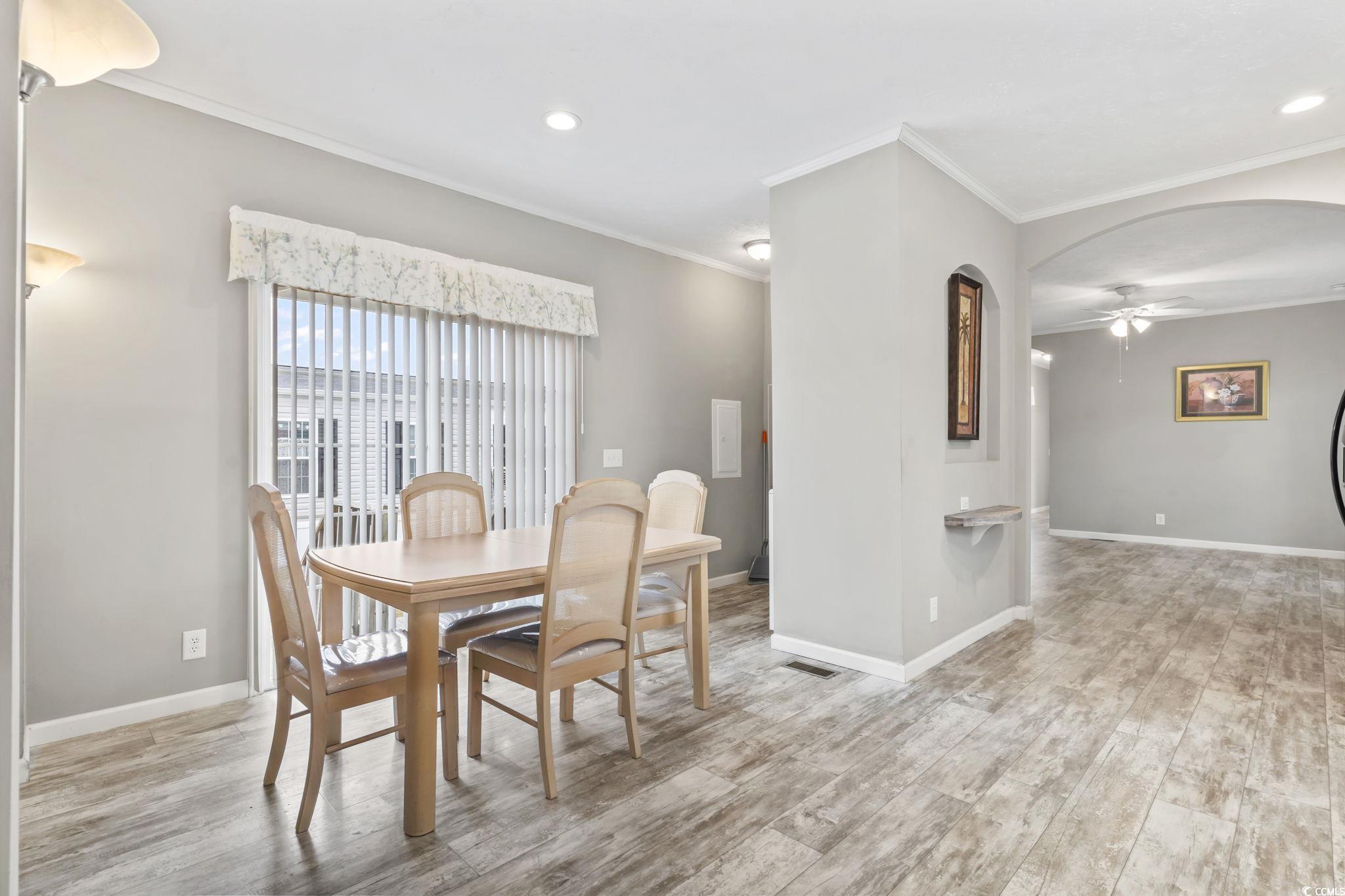 Welcome to Market Village! This welcoming 3-bedroom, 2-bath manufactured home is ideally located just minutes from The Market Common’s shops and dining, Coastal Grand Mall, entertainment, top-rated golf courses, Myrtle Beach International Airport, and only about a 5-10 minute drive to the nearest public beach access. Enjoy the perfect blend of convenience and coastal living in a home that truly feels brand new. Step inside to a bright and inviting split-floor plan featuring 9-foot ceilings that immediately create an open, spacious feel. The large living room flows seamlessly into the galley-style kitchen, which offers plenty of cabinetry, recessed lighting and easy access to the dining area. Just off the dining room, you’ll find a convenient laundry/utility room. The spacious primary bedroom includes a walk-in closet and an en-suite bathroom with double sinks and a large walk-in shower. Two additional bedrooms provide generous closet space and share a well-appointed second bathroom located at the end of the hallway. Crown Molding and Drywall throughout home. Outdoor living is made even better with a large covered front porch—perfect for relaxing—and an additional 12' x 12' concrete pad, ideal for a picnic table, grilling area, or extra seating. A detached 8' x 10' storage shed providing you additional storage space (pre-wired with electric). There is even Hunter irrigation system and home has a permanent brick foundation. Don’t miss your chance to own this stunning home in a prime location. Schedule your showing today! Square footage is approximate and not guaranteed. Buyer is responsible for verification.