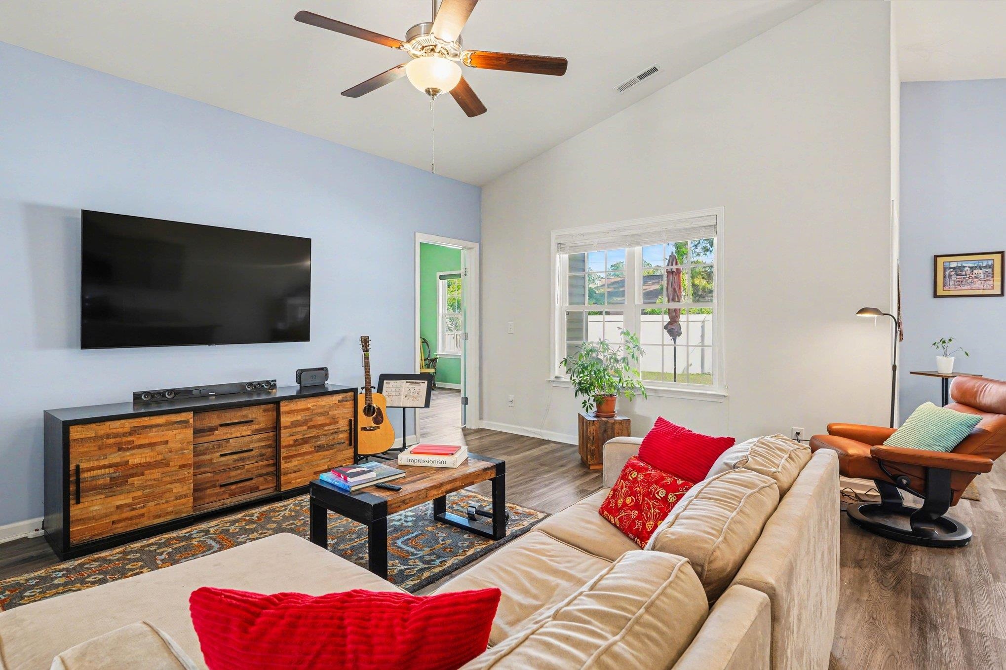 Take a moment to appreciate the professional landscaping highlighting this inviting home. A wide foyer welcomes you with a stunning view through the house to the fully fenced in backyard. Easy access to the secondary bedrooms and bath is on your right. Enter the great room, which is designed for entertaining with the combination of a large island/breakfast bar and eat -in dining area. Natural gas stove, tons of counterspace and soft close cabinets. Easy to maintain LVP flooring throughout with carpeting in the secondary bedrooms. The master is big enough for a king-sized bed and two, yes two, walk in closets! The master bath features a large walk-in shower with two seats as well as double sinks for those crazy mornings. And a gas - tankless water heater. The back porch is covered but could easily be screened in with an additional concrete pad for your grilling needs. A serene, private and peaceful yard with a full yard sprinkler system. Ocean Palms offers a pool and cabana within a golf card ride and just 1.5 miles to the beach. Close to shopping, dining, golf, and more. Buyer is responsible for verifying all HOA information, measurements and square footage.