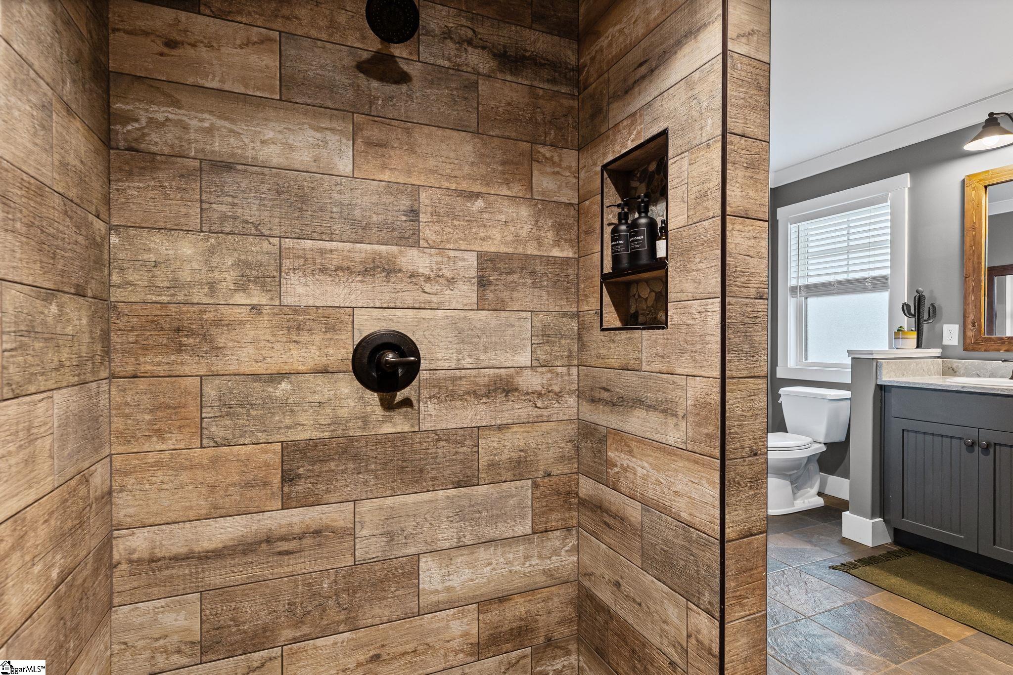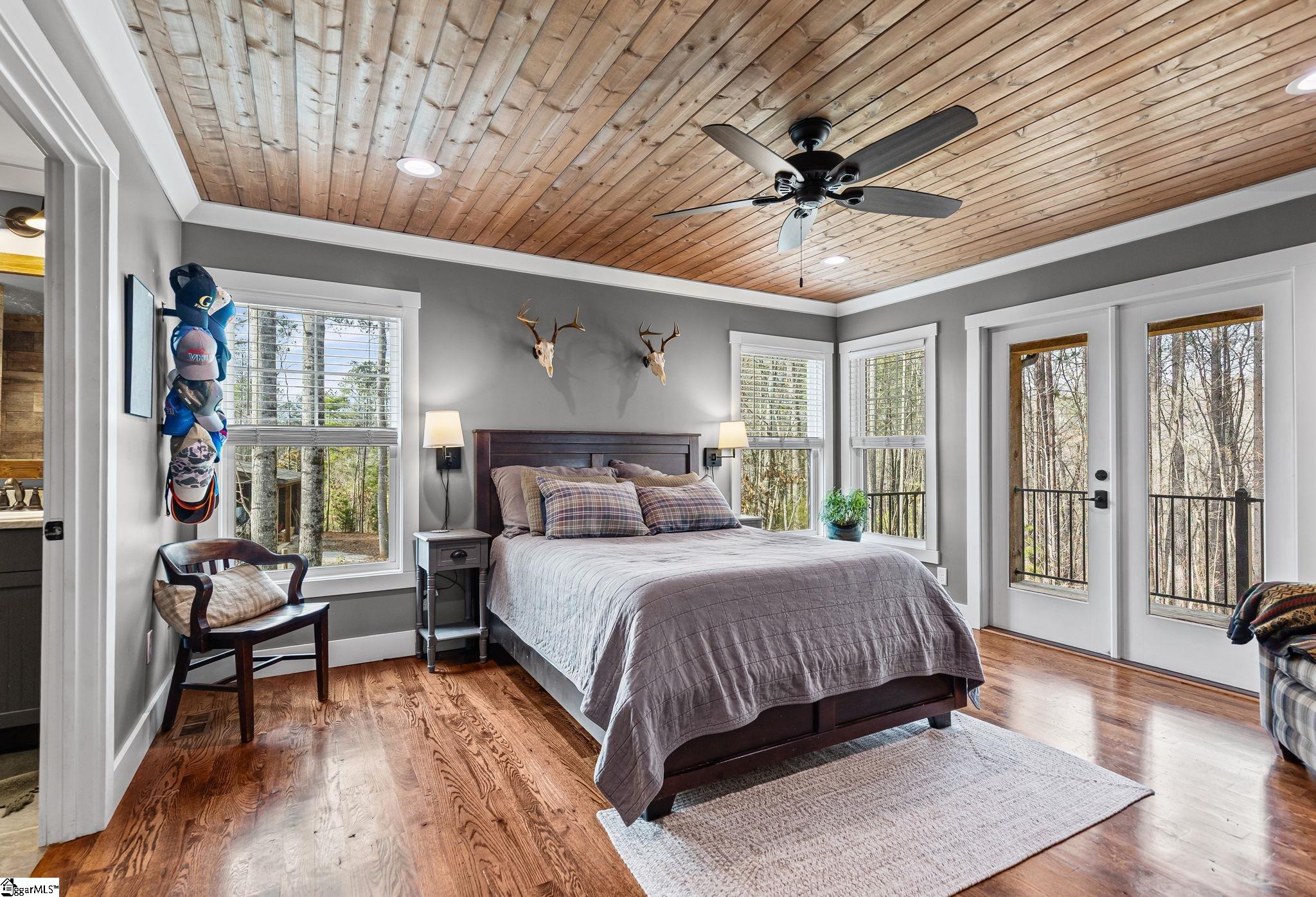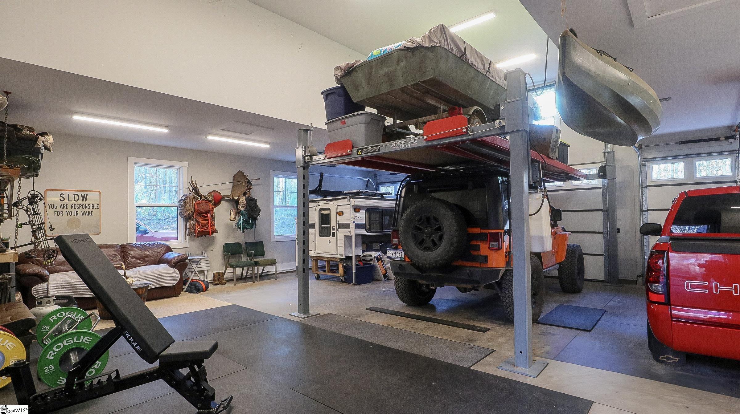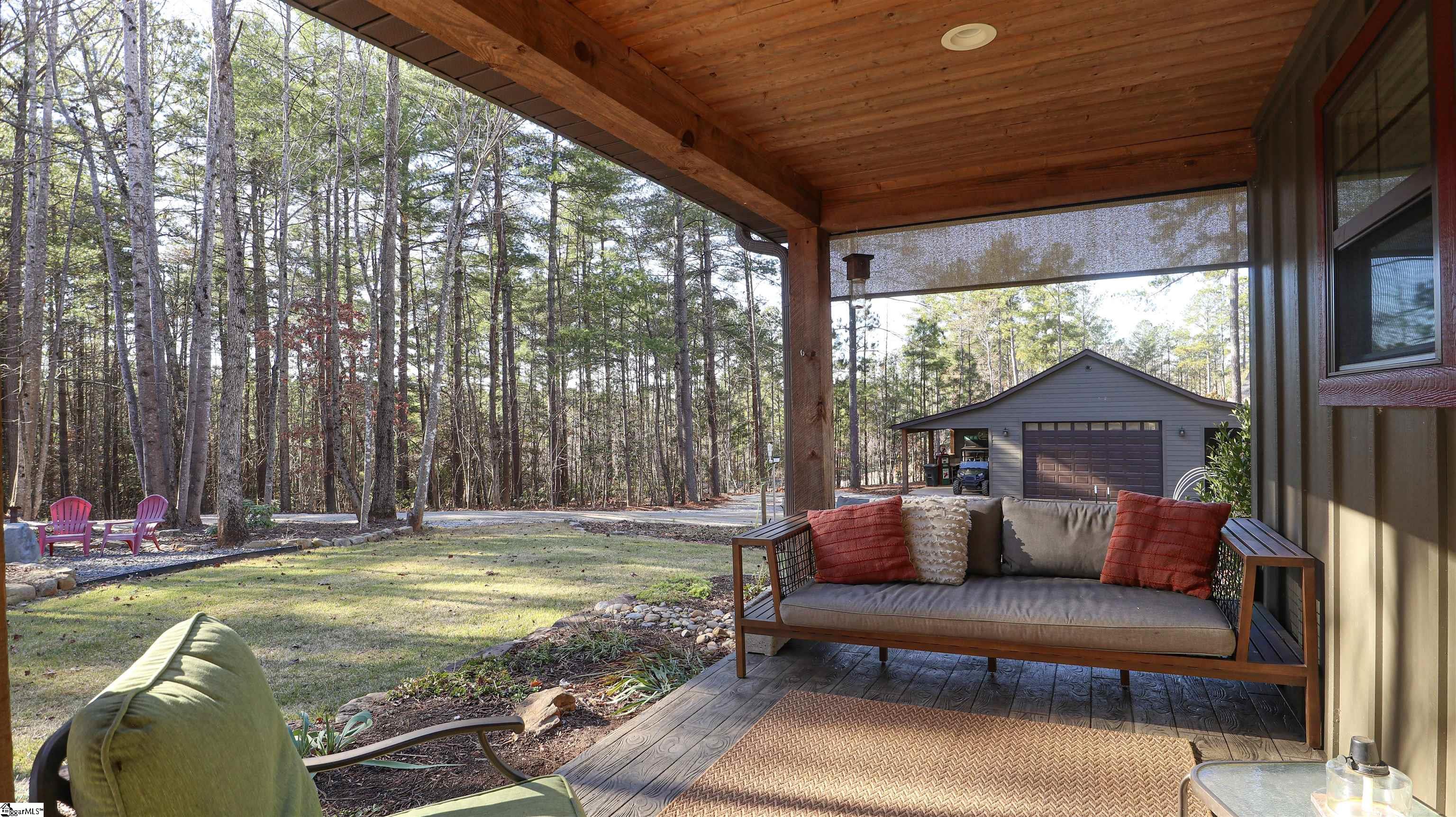 Mountain-style retreat with room to live, work, and unwind! Designed with functionality in mind, this custom-built home blends quality construction with a practical layout and flexible space for work or hobbies in a peaceful natural setting - all while remaining close to the amenities of nearby Travelers Rest, Greenville and Greer! Tucked among the trees on a 5-acre wooded lot, the property offers approximately 2,000+/- square feet of living space with three bedrooms, two and a half bathrooms, an attached 3+ bay garage, a detached heated and cooled workshop, and established raised-bed gardens. A gravel driveway winds gently through the trees, creating a quiet sense of arrival as it leads to the home, with a separate spur road accessing the workshop. Ample parking and turnaround space easily accommodate guests, trailers, boats, or RVs. The covered front porch, finished with stamped concrete and a tongue-and-groove ceiling, offers a welcoming place to slow down and soak in the peaceful surroundings at any time of day. Inside, hardwood floors run throughout the main living areas and bedrooms, paired with solid alder doors, crown moulding, and tasteful window treatments that reflect the home’s quality craftsmanship. The kitchen is designed to function as the heart of the home, centered around a large island, with generous cabinetry, granite countertops, under-cabinet lighting, glazed tile backsplash, a gas cooktop, matching black stainless steel appliances, and a walk-in pantry for additional storage. The main-level primary suite is filled with natural light and features tongue-and-groove ceilings along with direct access to the covered back deck. The primary bathroom includes dual sinks, ceramic tile floors with a natural slate look, and a walk-in tiled shower with dual shower heads. A pocket door leads to the walk-in closet, which connects conveniently to the laundry room. A half bath completes the main level. Upstairs, two spacious bedrooms share a full bathroom with tile floors, a soaking tub, and a tile shower surround, with a walk-in attic for additional storage. For those who appreciate well-equipped utility space, the attached three-bay garage measures approximately 36’ x 34’, with 9-foot ceilings in the side bays and a 14-foot center bay designed to accommodate a four-post hydraulic car lift. Multiple 220-volt circuits support a car charger, welder, lift, and more. The detached workshop offers 24’ x 24’ of enclosed space with two 12’ x 24’ lean-tos, a 16’ x 10’ garage door, Rockwool and spray-foam insulation, a mini-split HVAC system, 200-amp service, a 220-volt circuit, 12-foot ceilings, a hose spigot, and is pre-plumbed for a water heater. The raised garden beds appeal to both hobby gardeners and more serious growers, with established perennials including strawberries, blackberries, asparagus, and pollinator-friendly flowers. A separate hose spigot makes maintenance easy. Just beyond the garden, an established path winds through the wooded rear of the property—perfect for a casual walk, quiet reflection, or enjoying the land in a more hands-on way. The grounds feature a zoysia-sodded lawn, natural stone boulder accents, and mature trees that provide a pleasing balance of sun and shade throughout the day. A south-facing orientation supports healthy landscaping, while stone edging and wooded surroundings create a low-maintenance, naturally private setting. High-speed fiber internet ensures modern connectivity without sacrificing the sense of retreat. Set within the gated Burban Creek Plantation community, owners enjoy access to a 7-acre pond, community lodge, storage barns, expansive greenspace, and more than 10 miles of private trails across 500+ acres of preserved land dedicated to conservation, wildlife management, and outdoor sporting pursuits—extending the sense of privacy and outdoor freedom beyond the property itself.