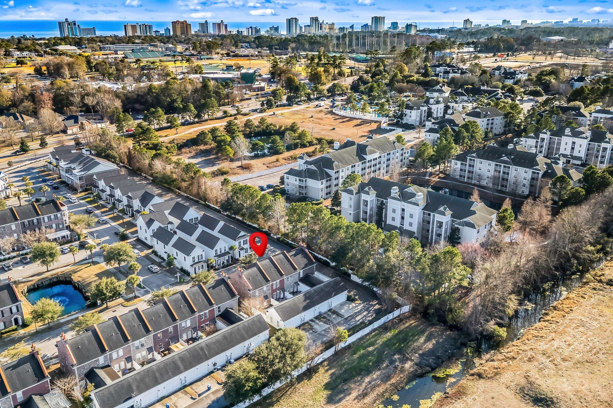 Discover easy coastal living in the heart of St. James Square, one of Myrtle Beach’s most sought-after townhome communities. This impeccably cared-for 2-bedroom, 2.5-bath home makes a striking first impression with its timeless brick façade, mature landscaping, and the rare bonus of a one-and-a-half car private garage offering both parking and extra storage. Inside, the main level welcomes you with an airy, open layout designed for both relaxation and entertaining. Cortec luxury vinyl plank flooring flows throughout the first floor, adding durability and modern style. The kitchen is a true focal point, showcasing stainless steel appliances, a quartz-topped island with breakfast seating, a sleek new tile backsplash, quartz undermount sink, generous cabinetry, and a pantry. A powder room and a tucked-away laundry closet add everyday convenience. Upstairs, both bedrooms are spacious retreats, each featuring ceiling fans, ample closet space, and private en-suite baths highlighted by granite countertops. Additional storage is available in the pull-down attic, ensuring room for everything. Comfort and efficiency are enhanced by a newer HVAC system (2023) and a UV light for improved air quality. Step outside to your own private, fenced courtyard—an inviting space for morning coffee or evening gatherings—upgraded with patio pavers installed in 2022. St. James Square is a true walking community, with a short stroll to nearby shops, restaurants, and everyday conveniences. Plus, the area is golf-cart friendly, making it easy to cruise to the beach and enjoy the coastal lifestyle without ever getting in your car. This home offers low-maintenance, lock-and-go living in an unbeatable location. Whether you’re searching for a primary residence, a beach getaway, or a smart investment, this move-in-ready townhome is a standout opportunity.